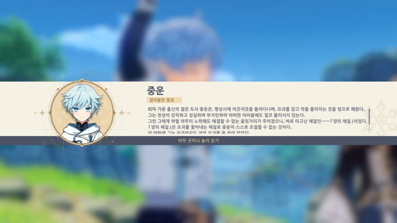 다른 캐릭터들은 전부 마신 임무에서 한 번씩 얼굴을 비추었기 때문에 이미 소개가 되었지만, 중운은 마신 임무에 출연한 적이 없어 여기서 등장인물 설명을 하는 것이었다.