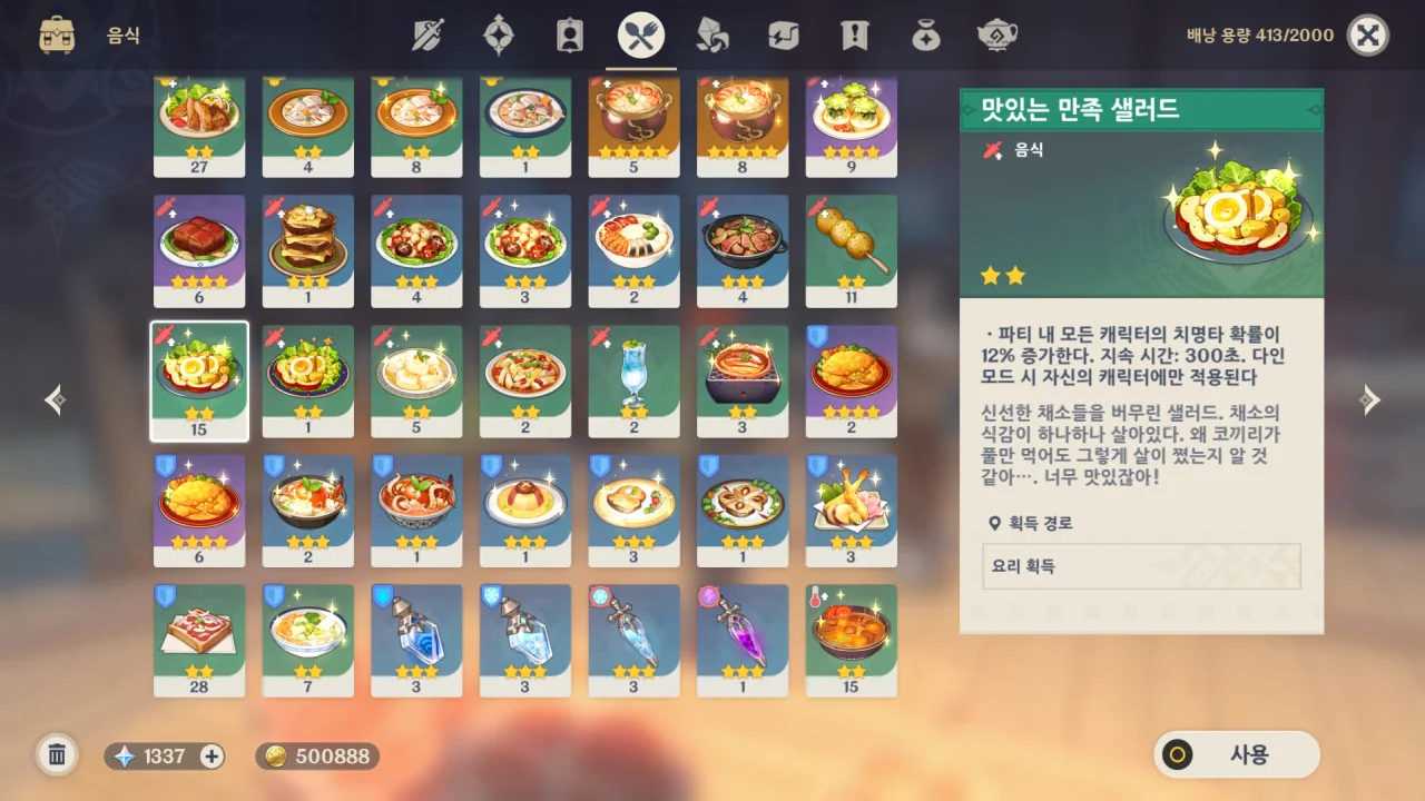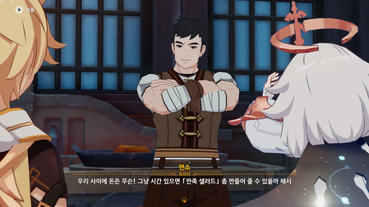 대화가 끝나자마자 "이 정도면 되겠지?"라는 페이몬의 대사가 나와 대체 무슨 상황인가 했는데, 인벤토리에 이미 만족 샐러드가 있어 만족 샐러드를 만드는 임무가 곧바로 끝났기 때문이었다.