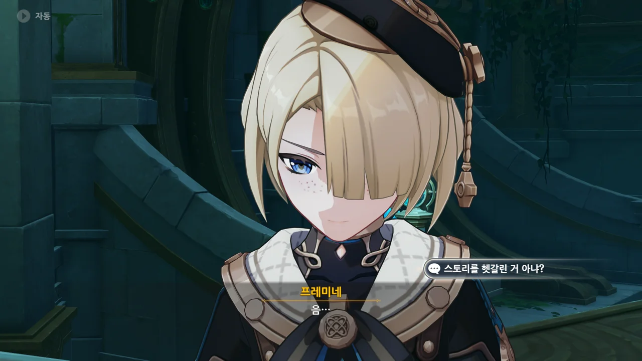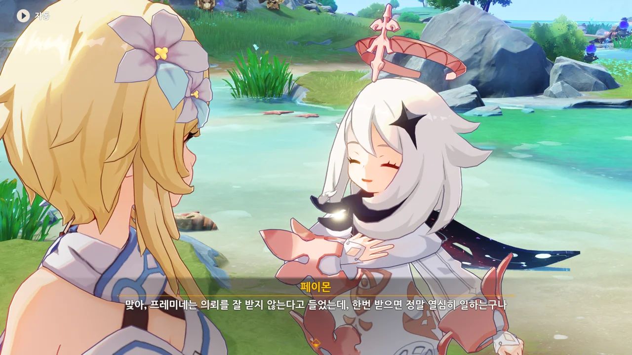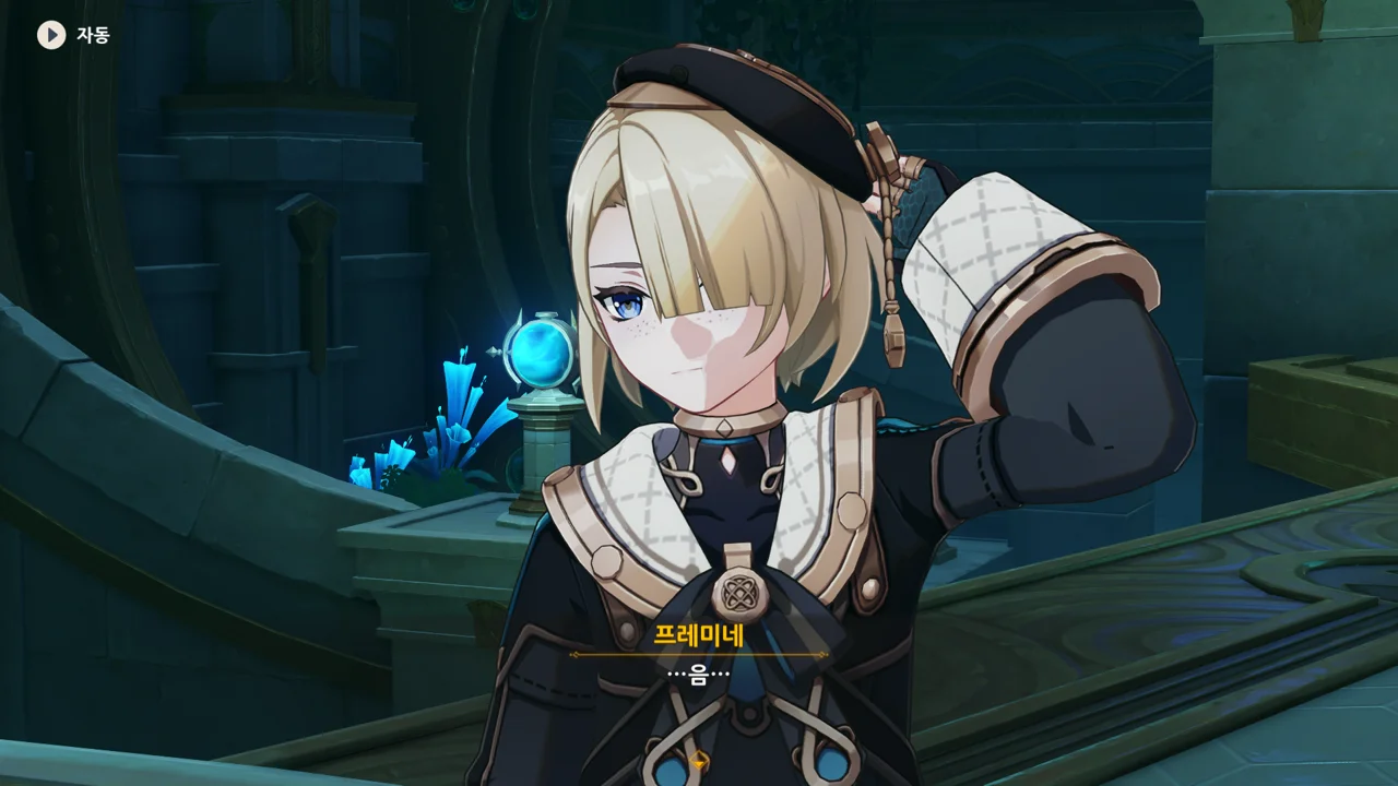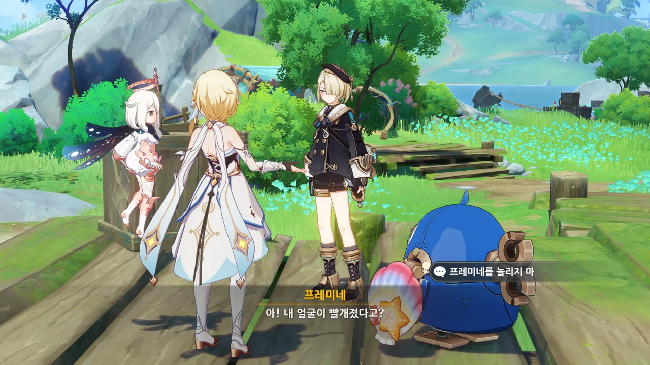 프레미네가 수줍게 뭔갈 말하려는데, 페이몬이 '너 얼굴 빨개졌어'라고 말하자 급하게 목구멍으로 삼켜버린다.