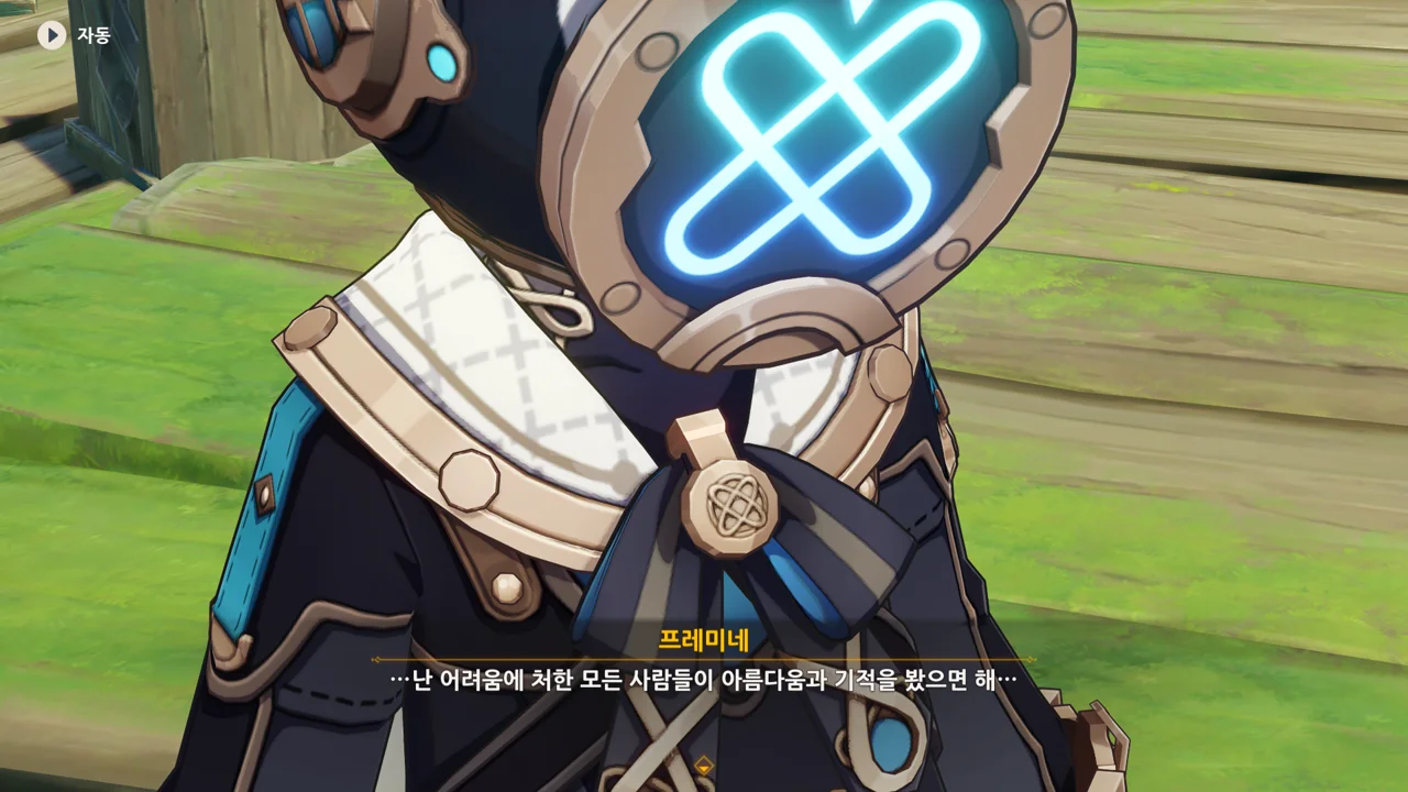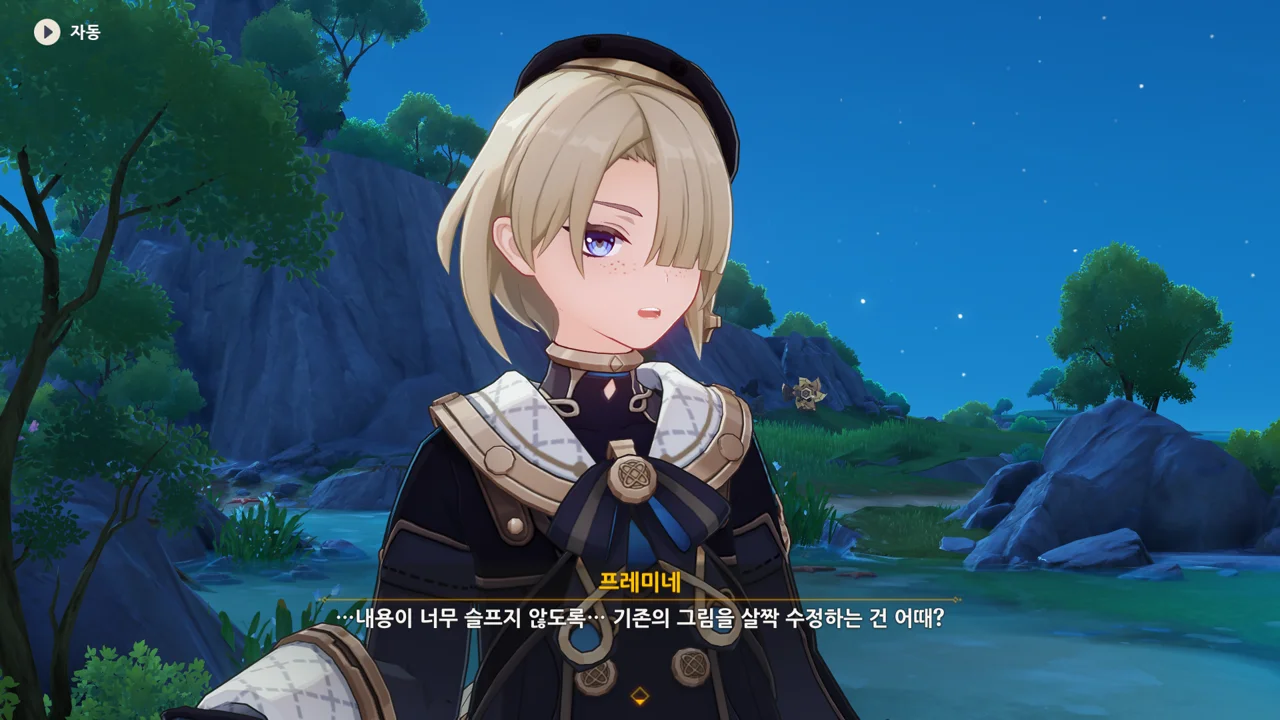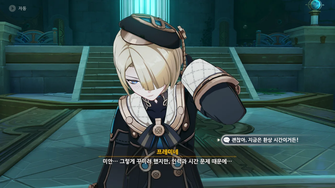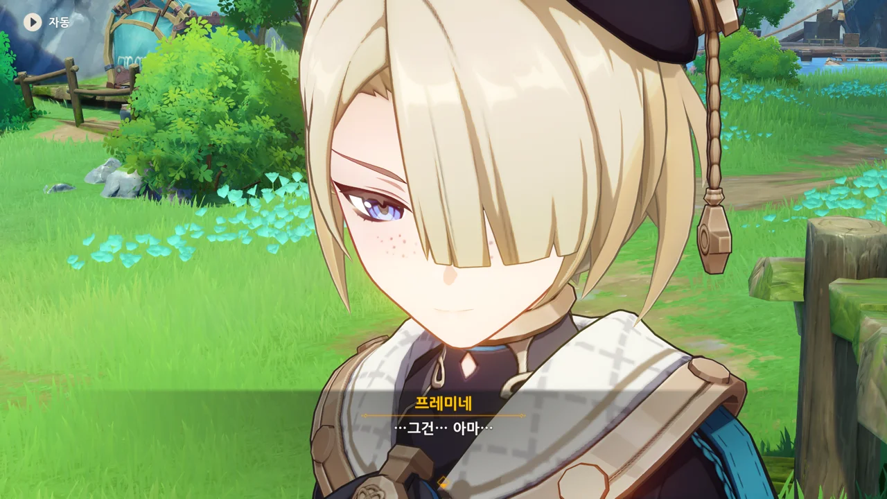 프레미네가 수줍게 뭔갈 말하려는데, 페이몬이 '너 얼굴 빨개졌어'라고 말하자 급하게 목구멍으로 삼켜버린다.
