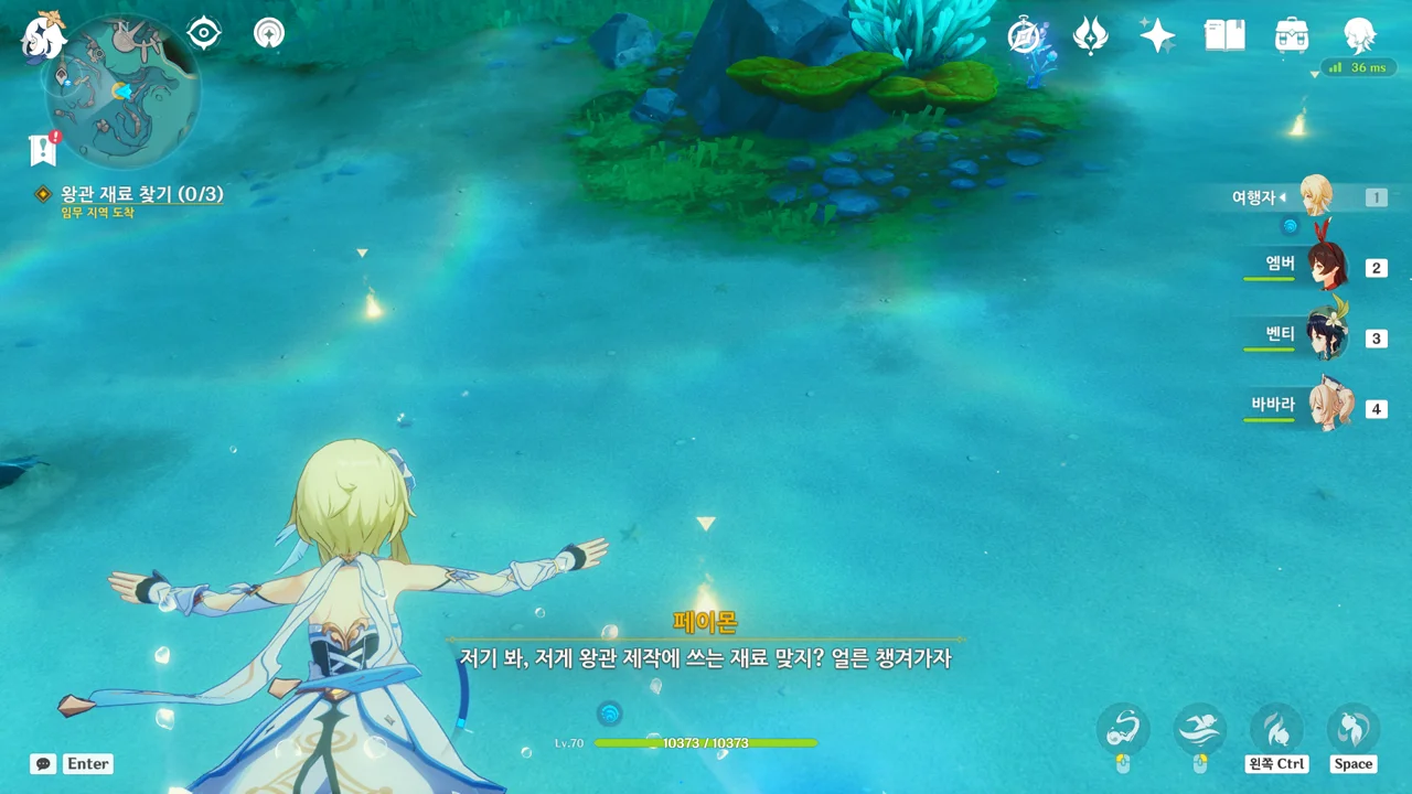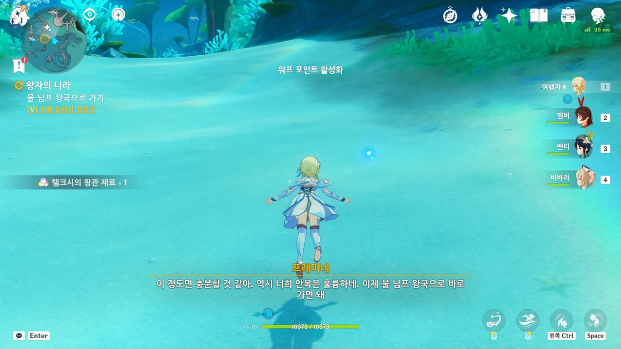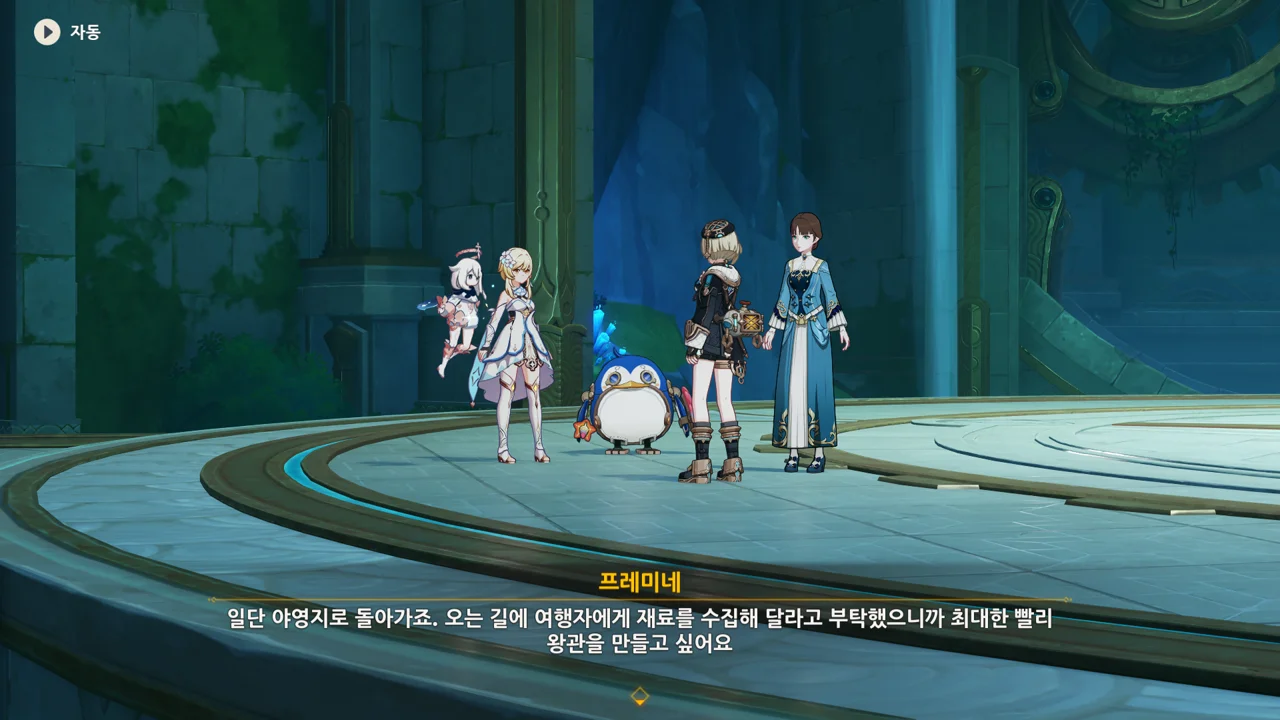 프레미네가 물 님프 왕국으로 출발하기 전, 대관식에 쓸 왕관의 재료를 모으는 걸 여행자에게 부탁한다. 재료는 가는 길에 채집하면 될 거라고 한다.