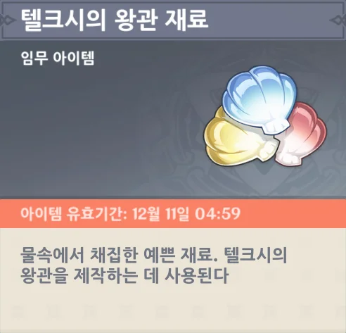 물속에서 채집한 예쁜 재료. 텔크시의 무기를 제작하는 데 사용된다.