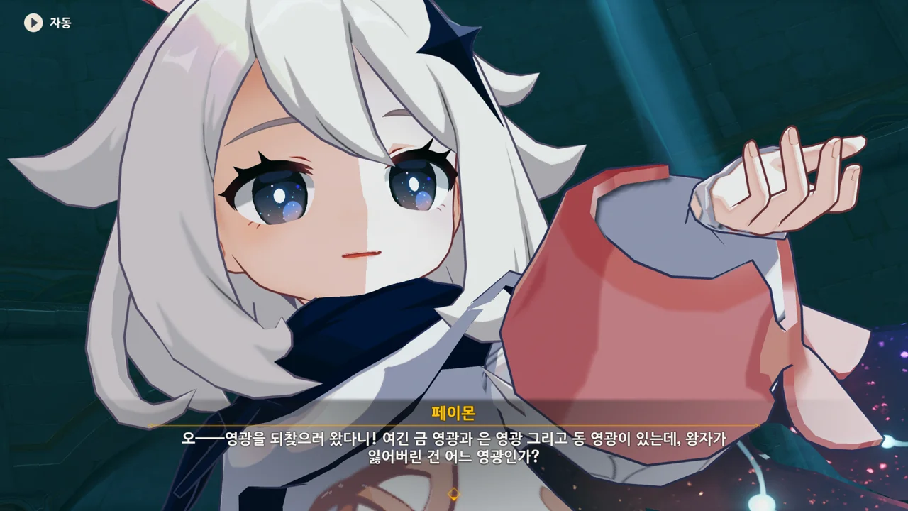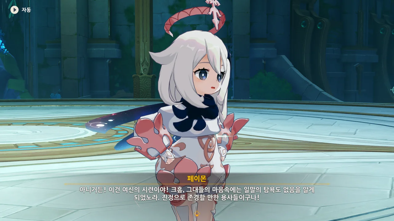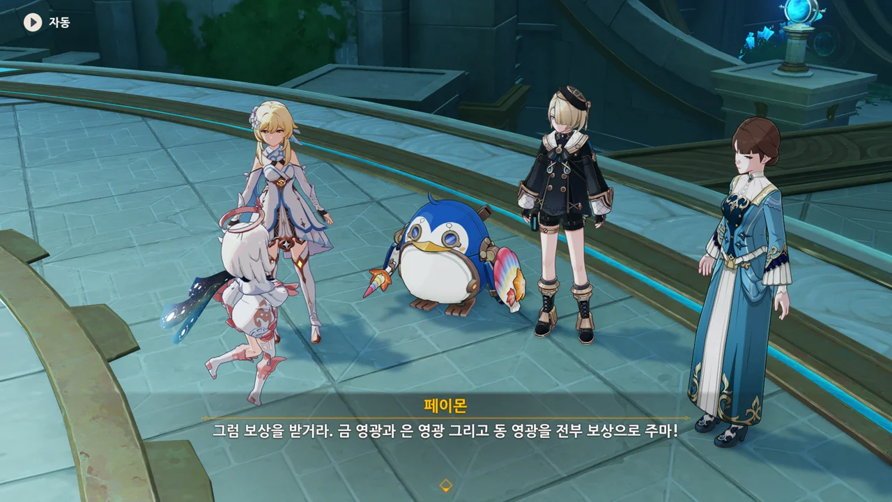 아무튼 이건 여신의 시련이라며, 우리의 마음속에 일말의 탐욕도 없음을 알게 되었으니 그 보상으로 금 영광과 은 영광, 동 영광을 전부 주겠다는 페이몬. 텔크시에겐 특별히 무지갯빛 영광을 하사한다.