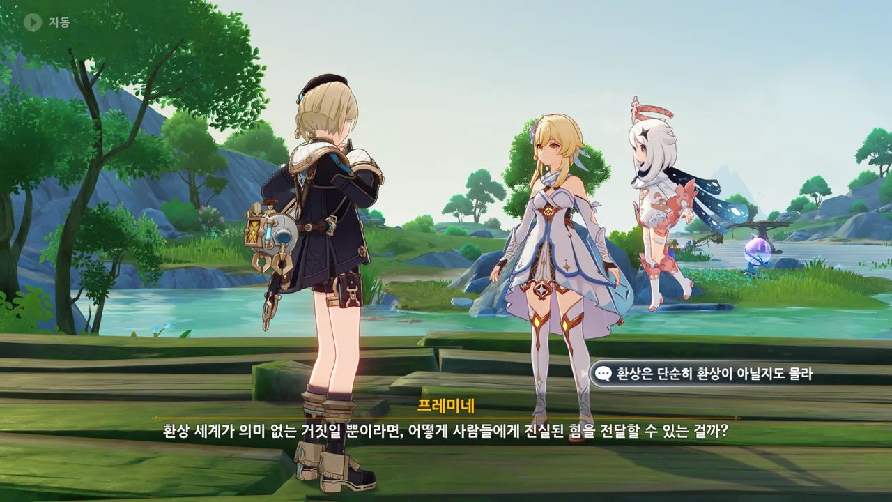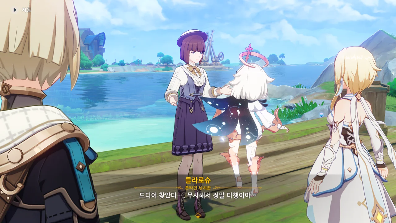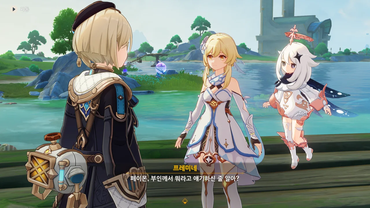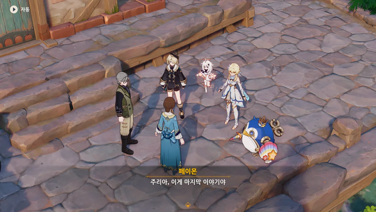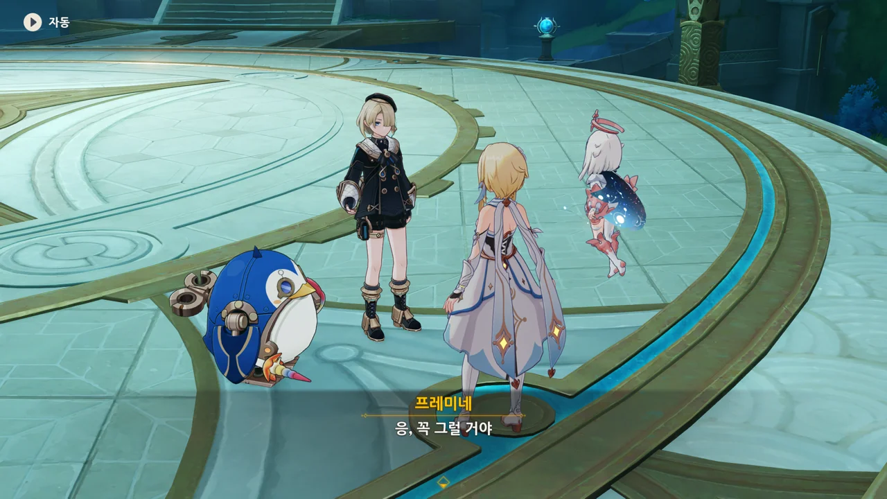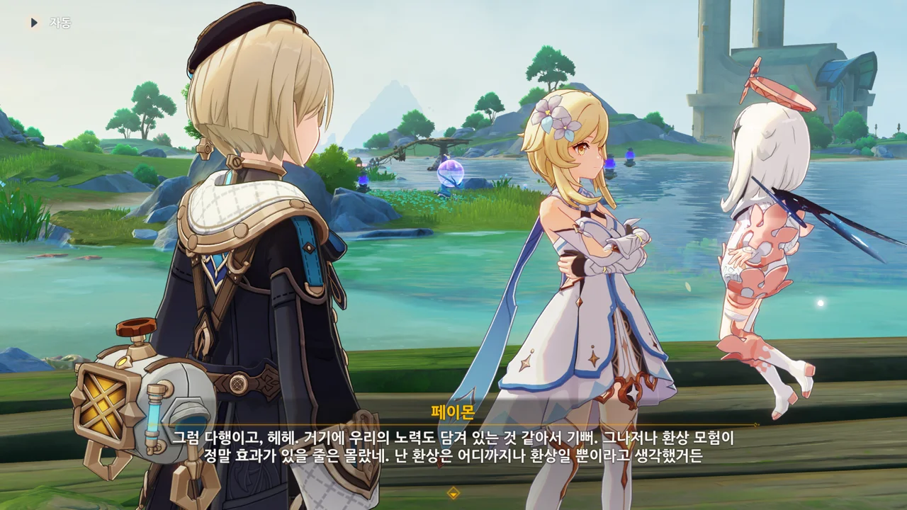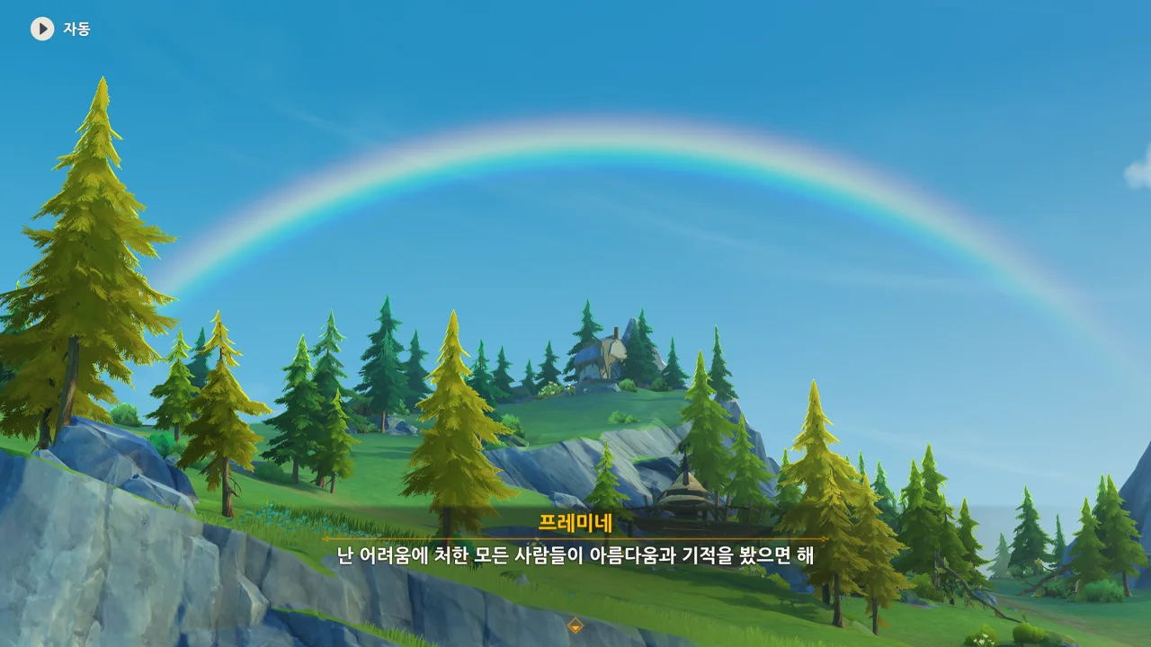 감격에 젖은 왕자는 무지개다리에 올라 지금까지 함께해 온 동료들을 둘러봤습니다. 여행자, 페이몬 여신, 프레미네, 그리고…