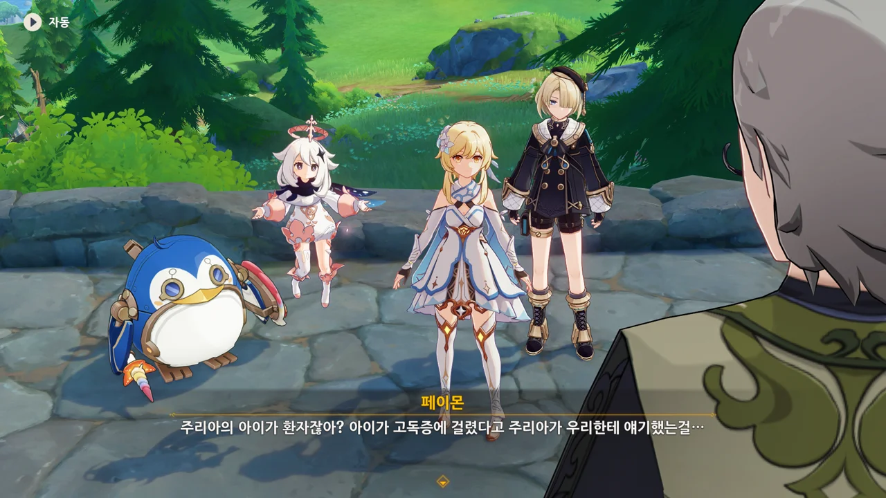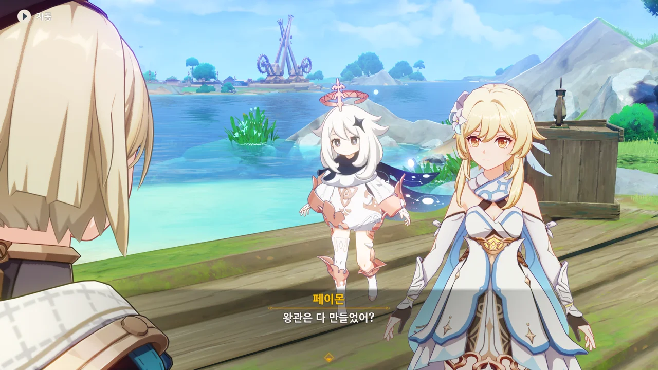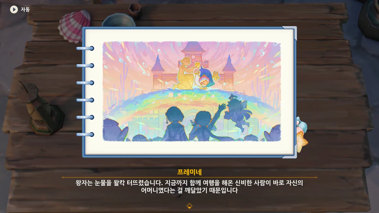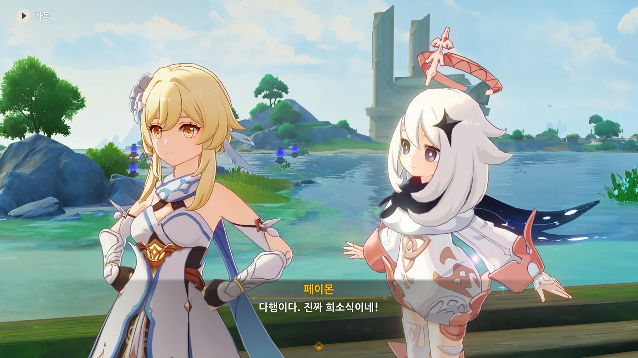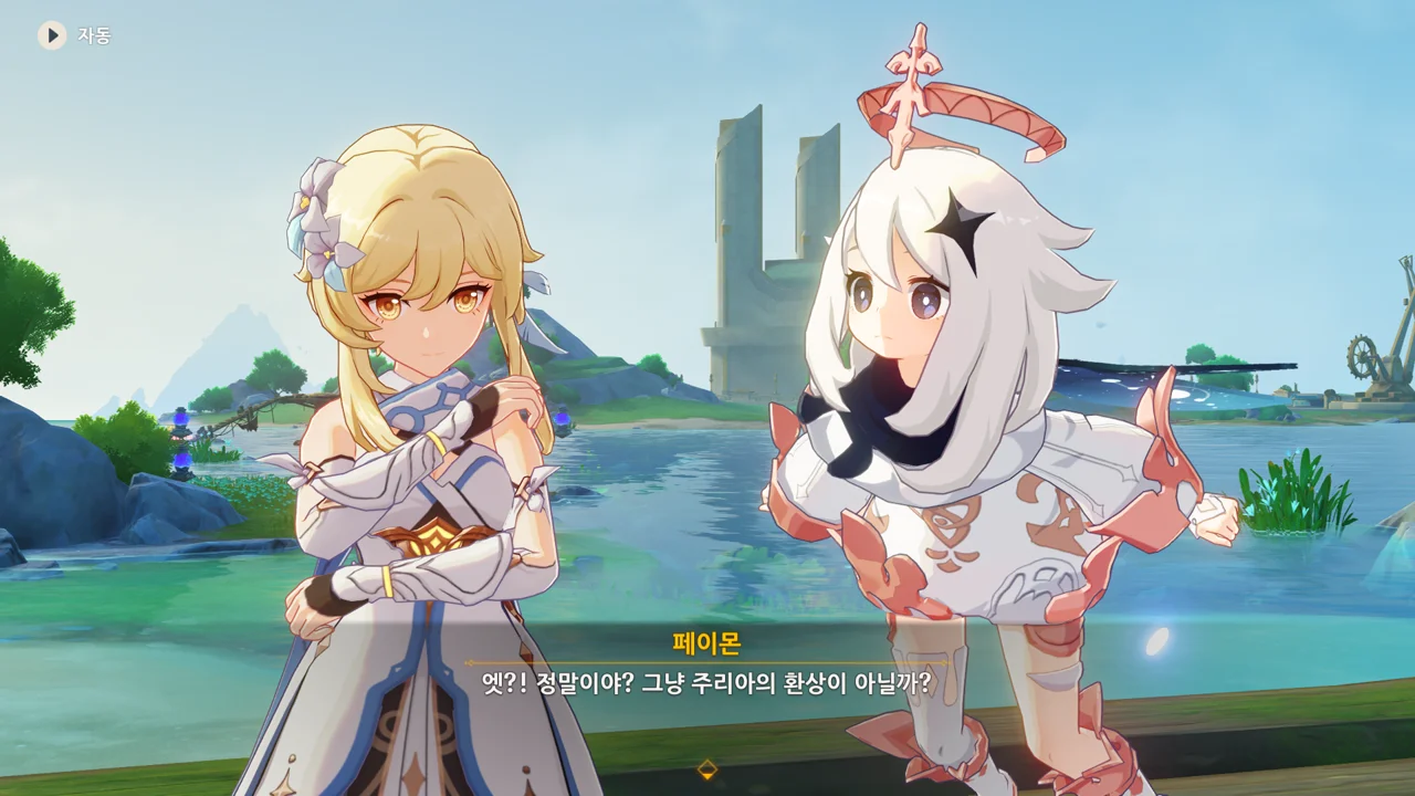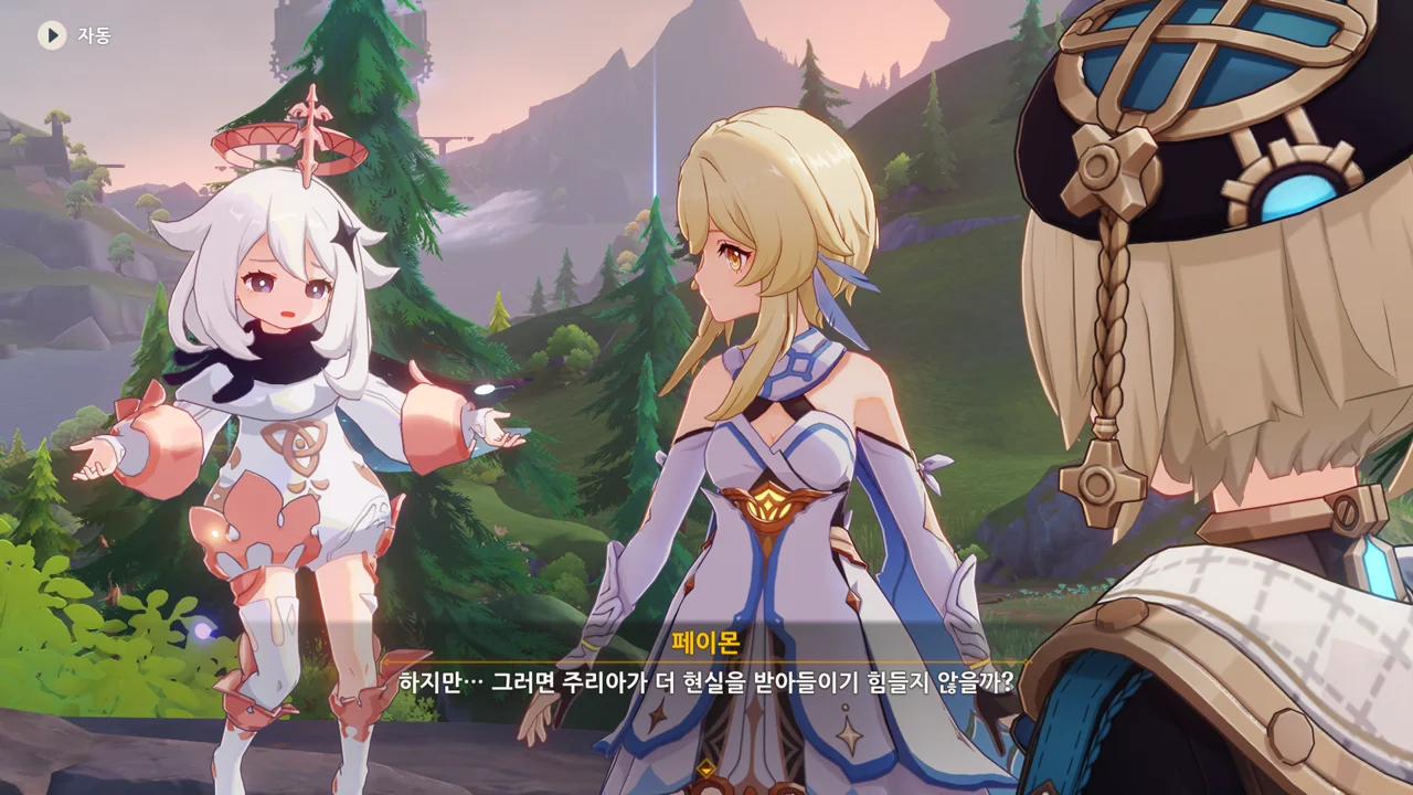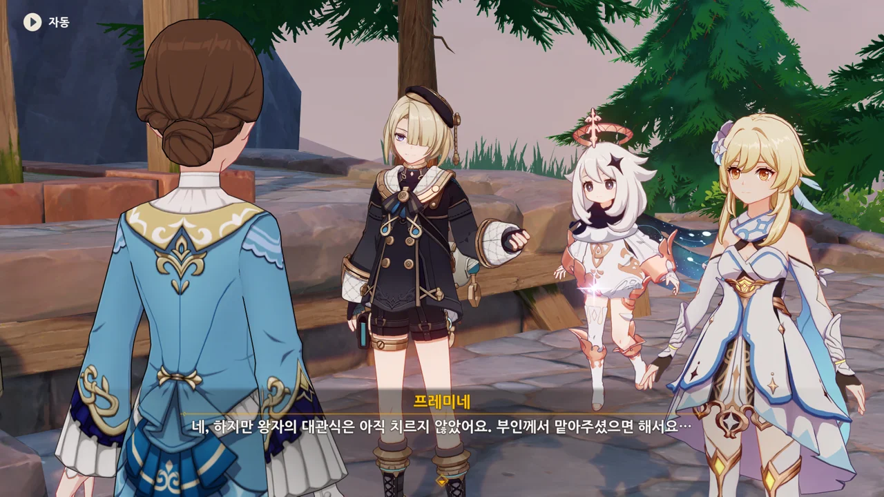 감격에 젖은 왕자는 무지개다리에 올라 지금까지 함께해 온 동료들을 둘러봤습니다. 여행자, 페이몬 여신, 프레미네, 그리고…