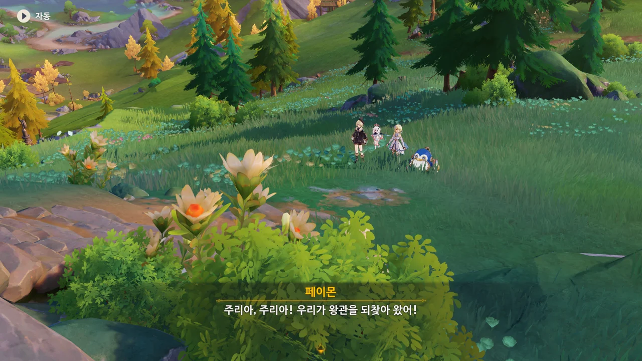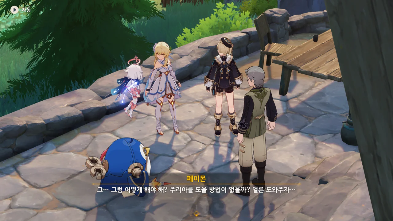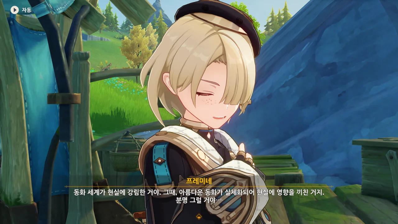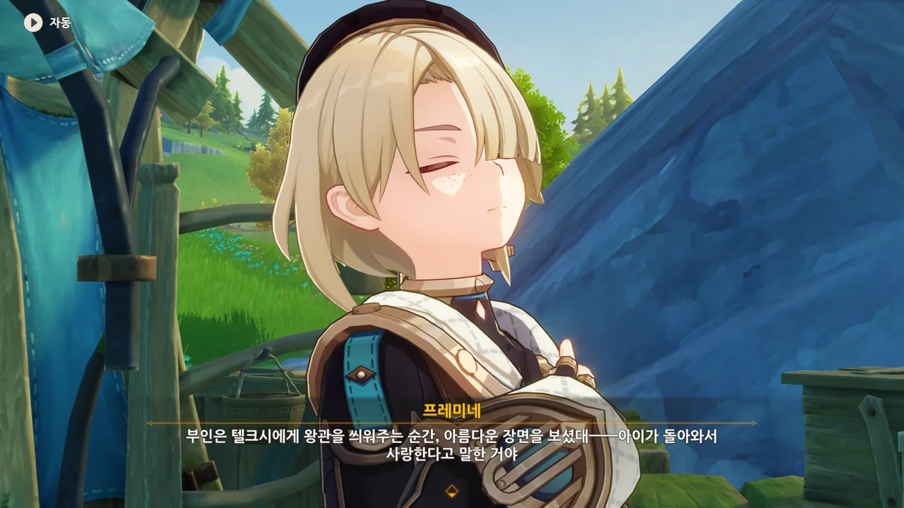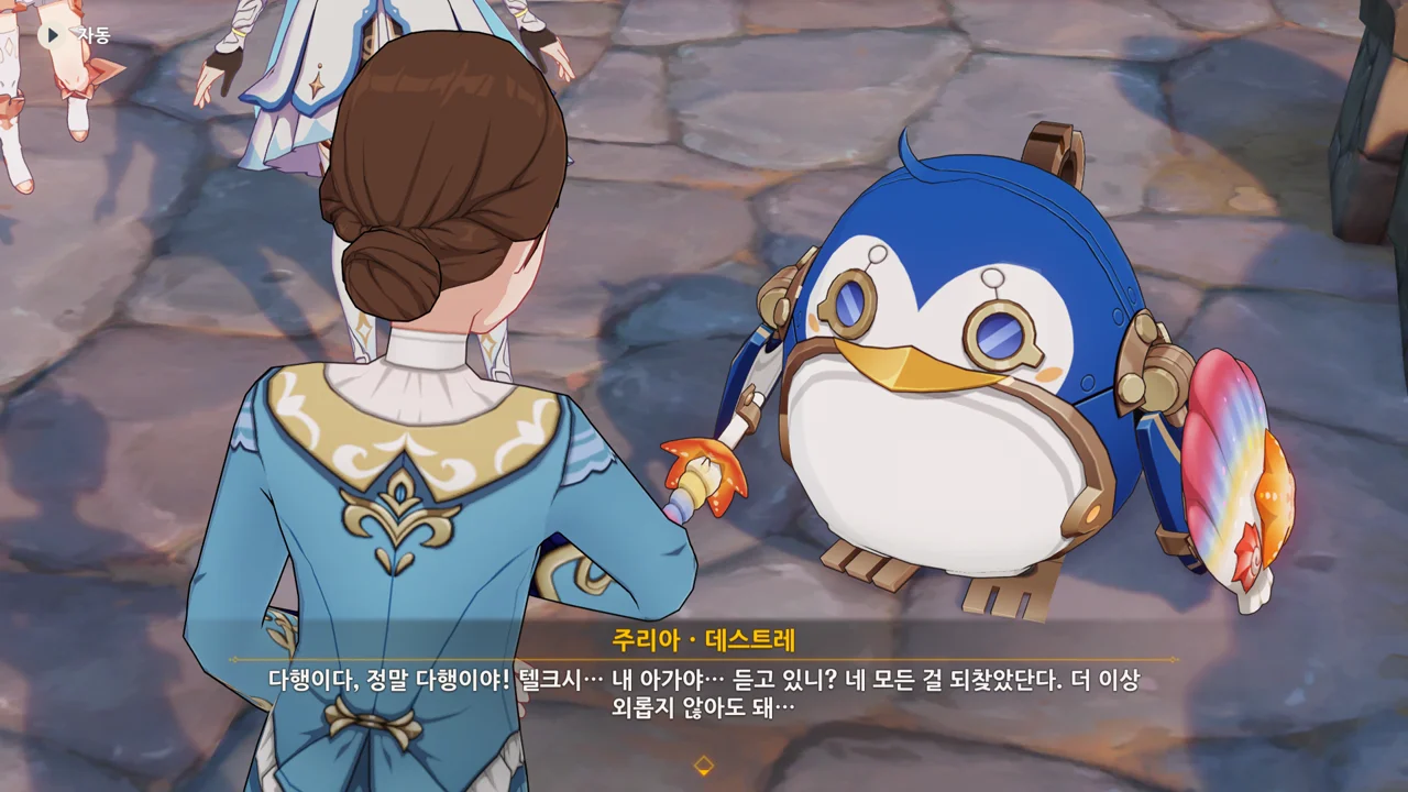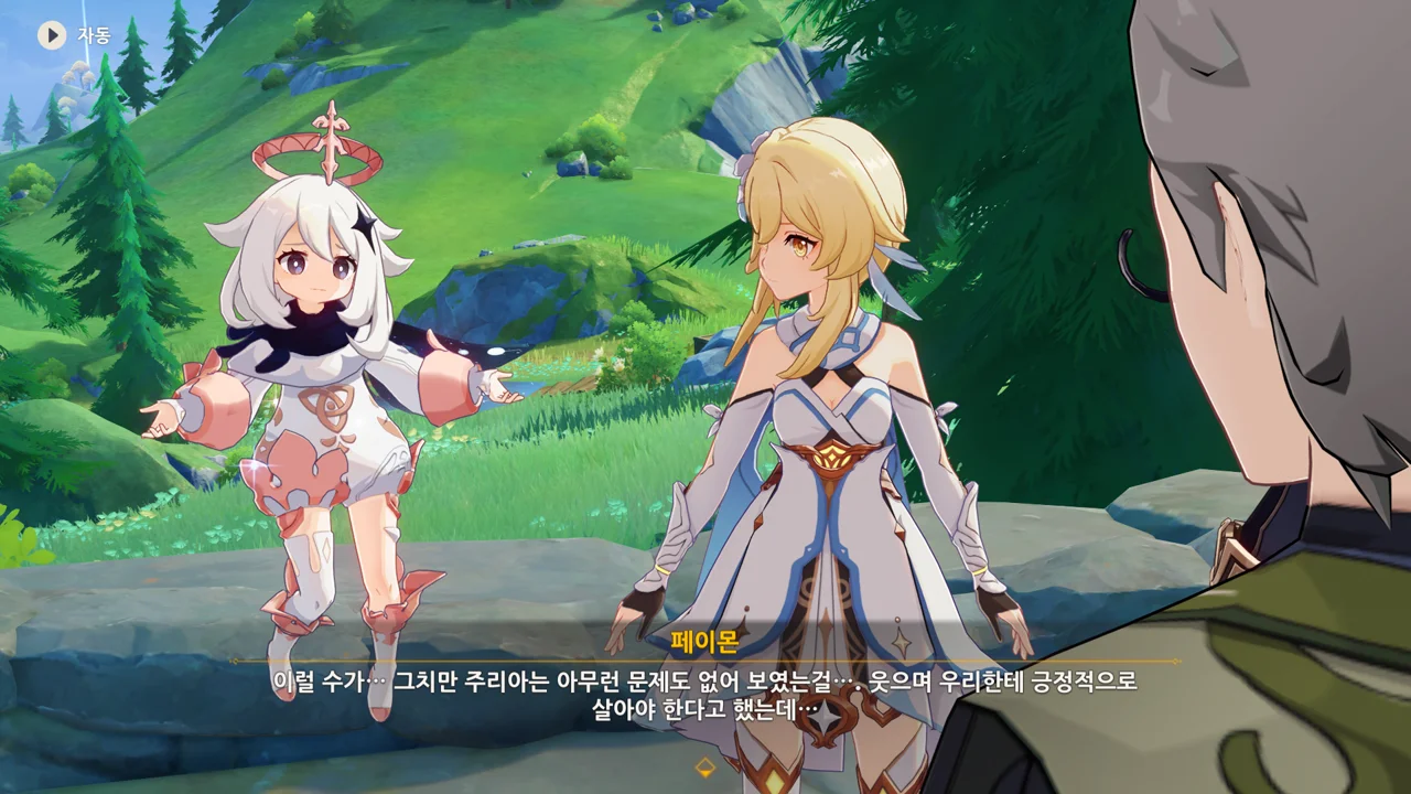 감격에 젖은 왕자는 무지개다리에 올라 지금까지 함께해 온 동료들을 둘러봤습니다. 여행자, 페이몬 여신, 프레미네, 그리고…