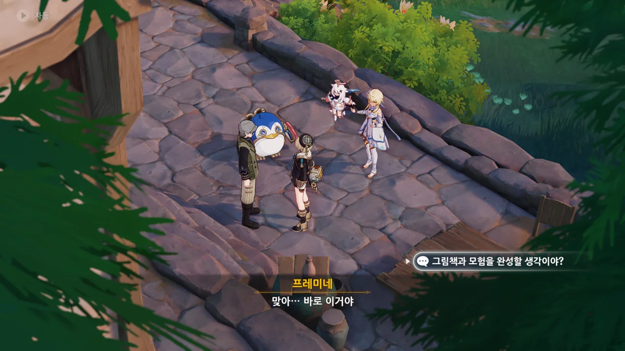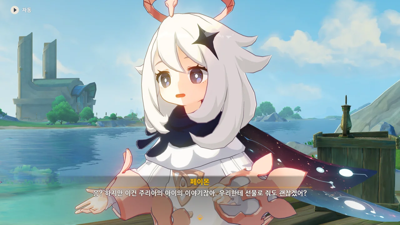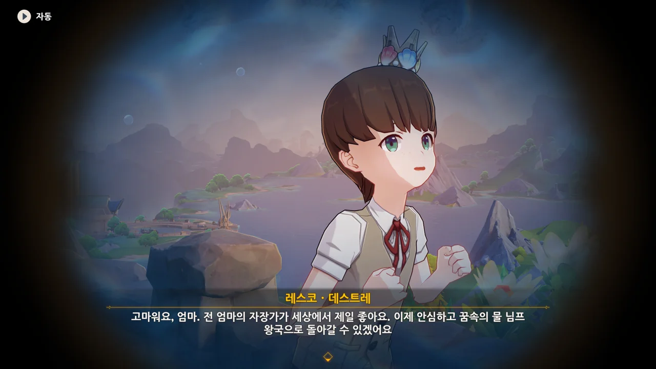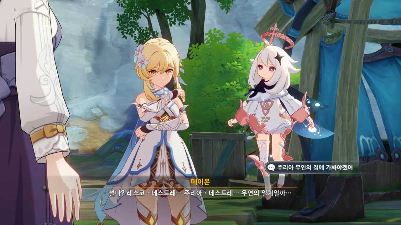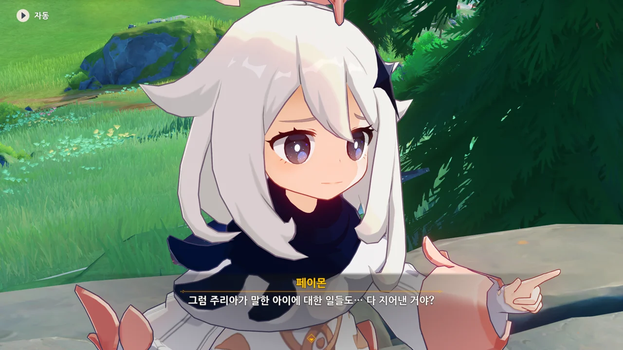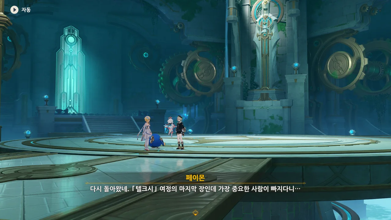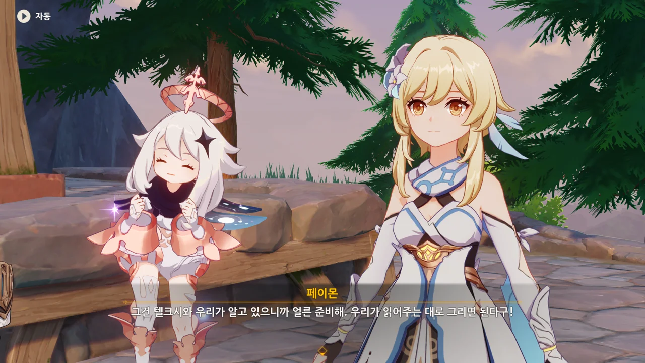 감격에 젖은 왕자는 무지개다리에 올라 지금까지 함께해 온 동료들을 둘러봤습니다. 여행자, 페이몬 여신, 프레미네, 그리고…