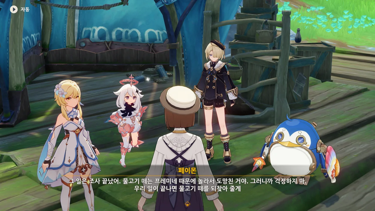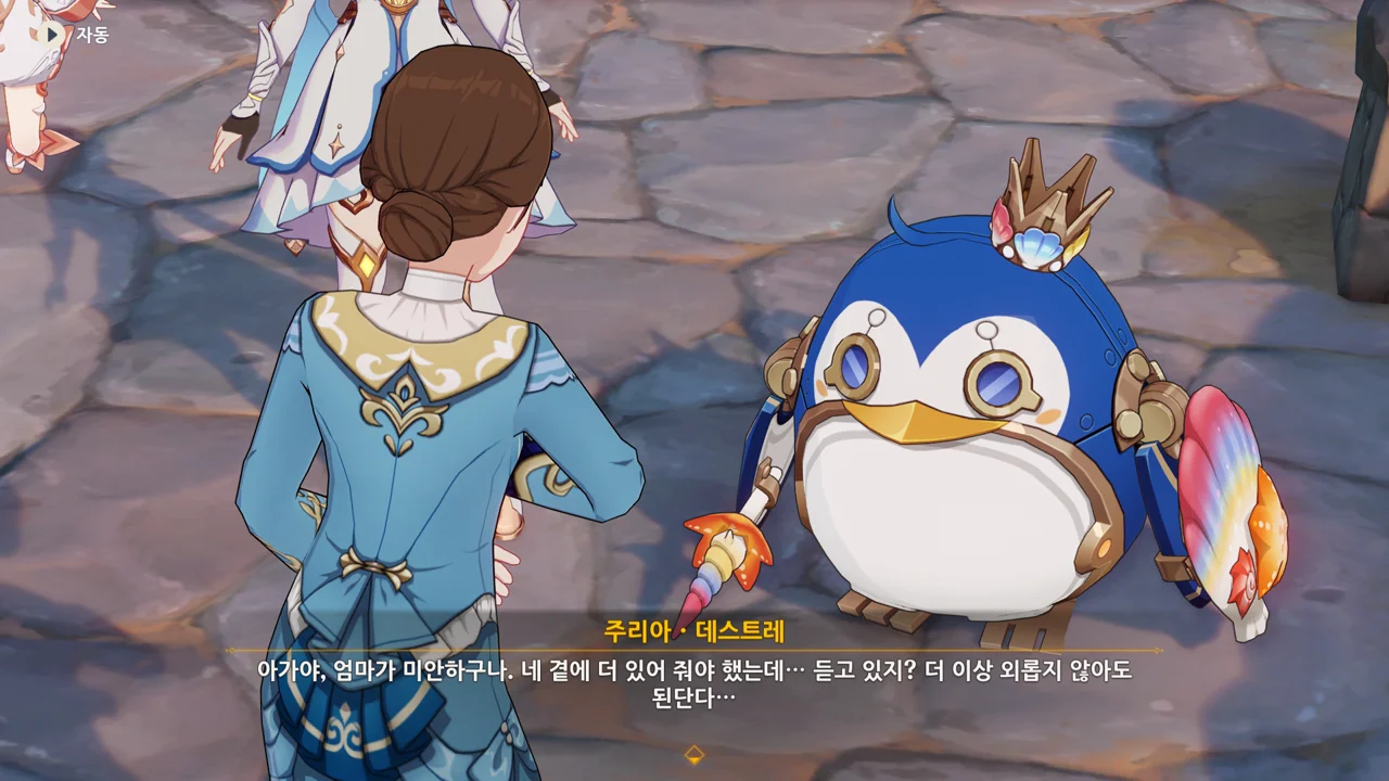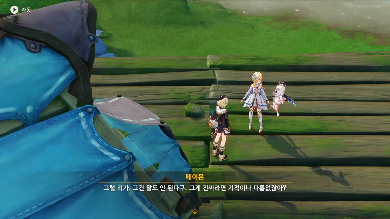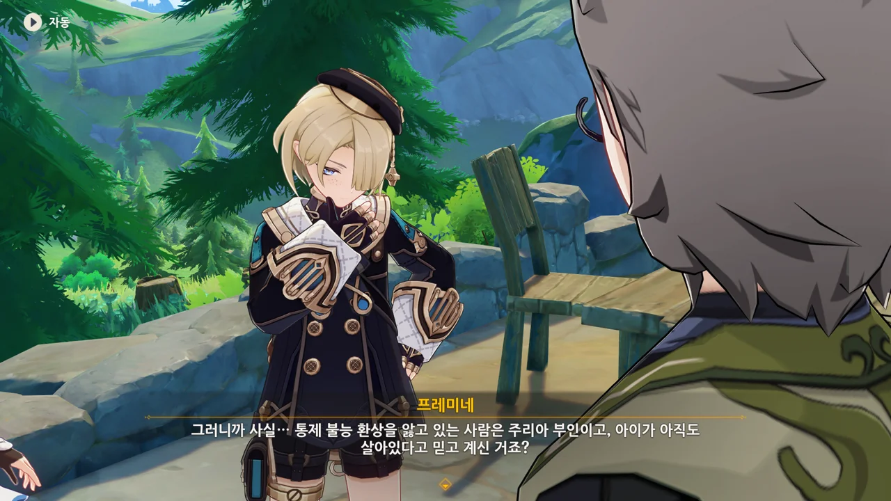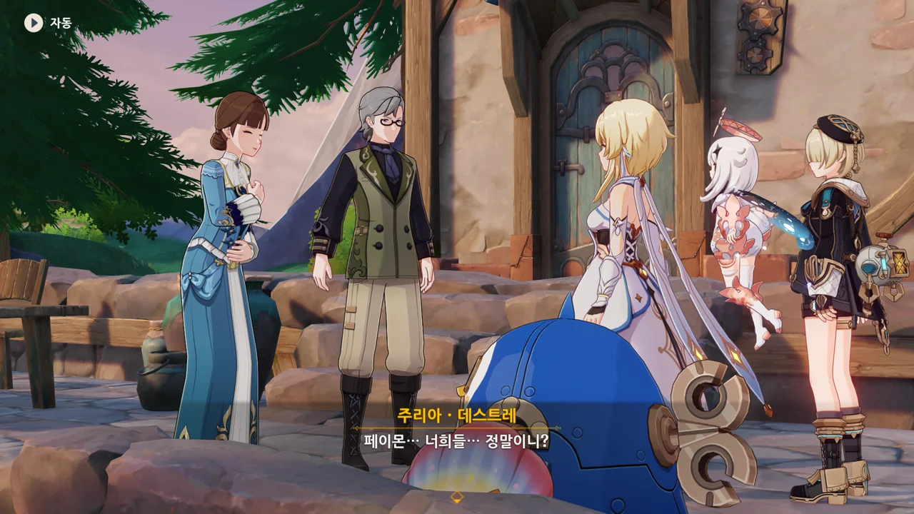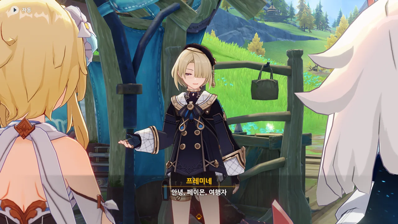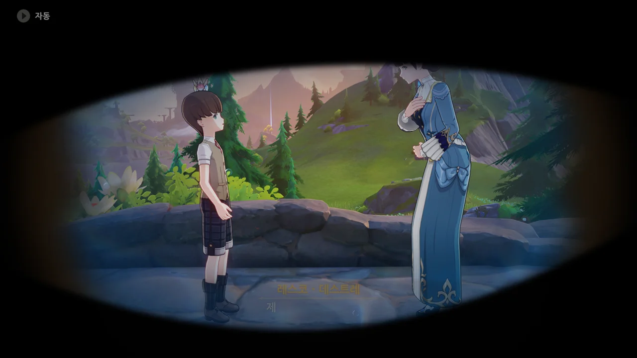 감격에 젖은 왕자는 무지개다리에 올라 지금까지 함께해 온 동료들을 둘러봤습니다. 여행자, 페이몬 여신, 프레미네, 그리고…