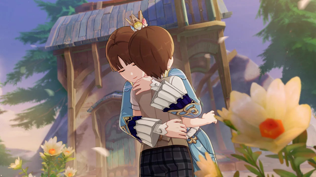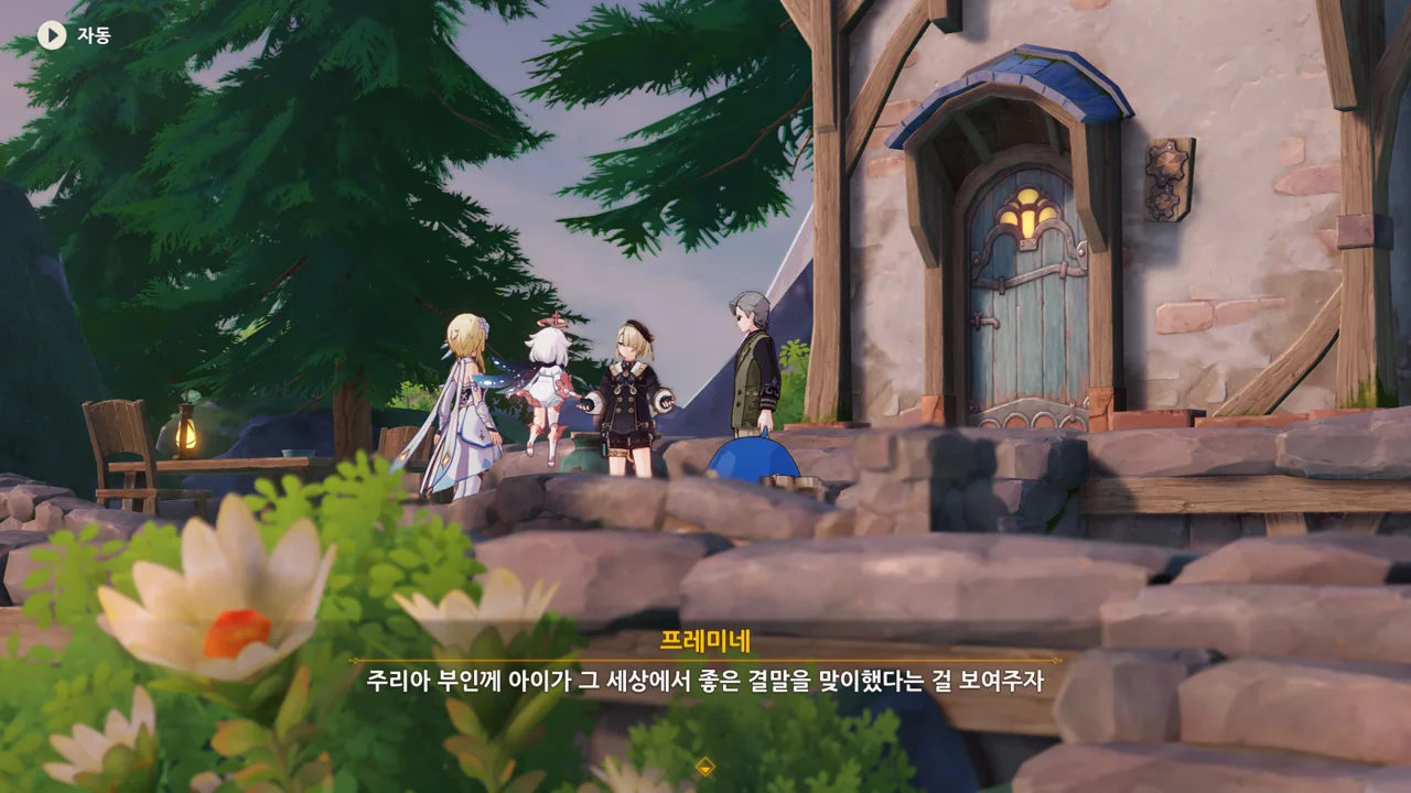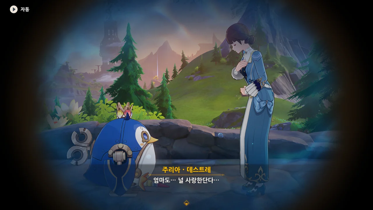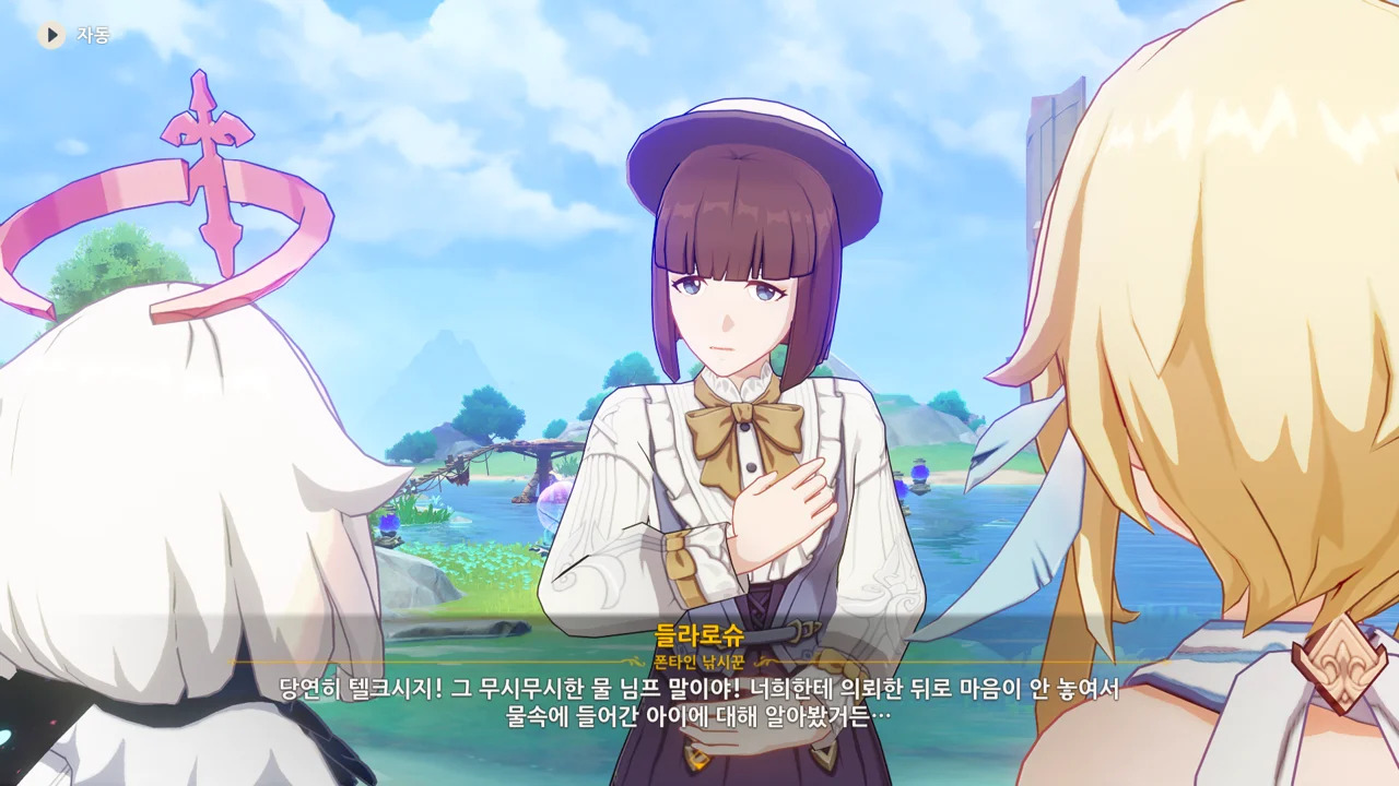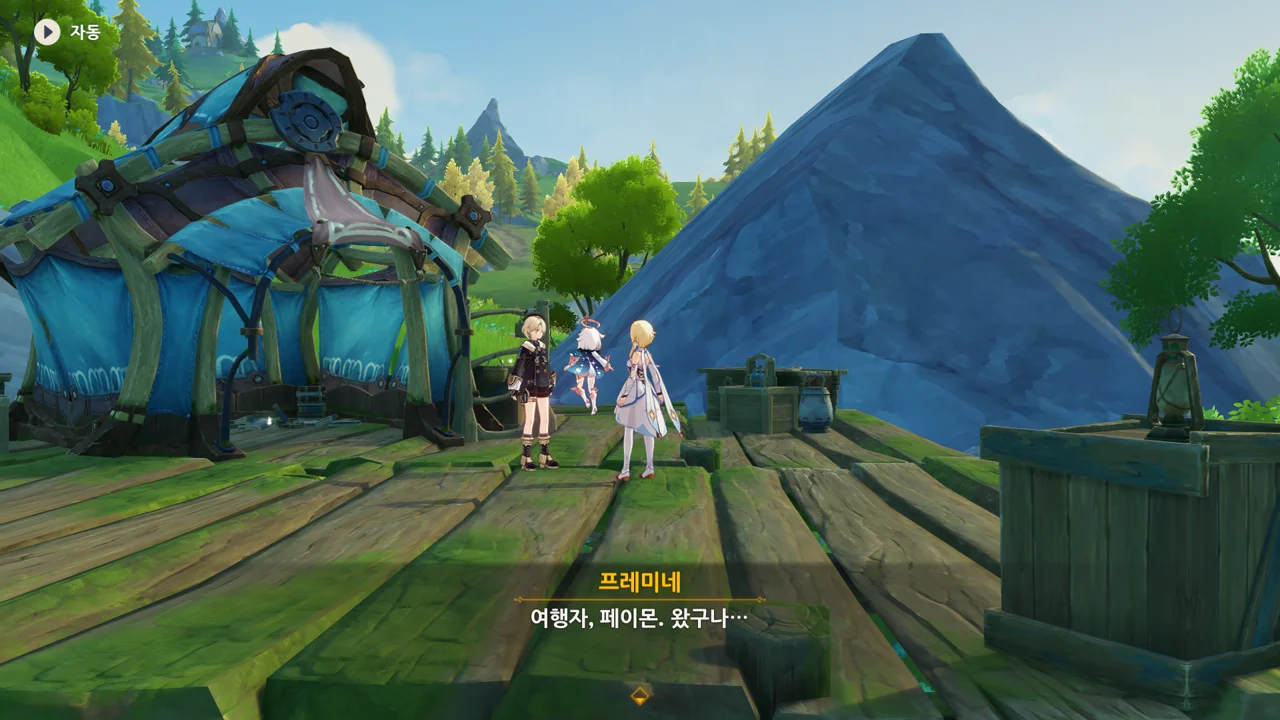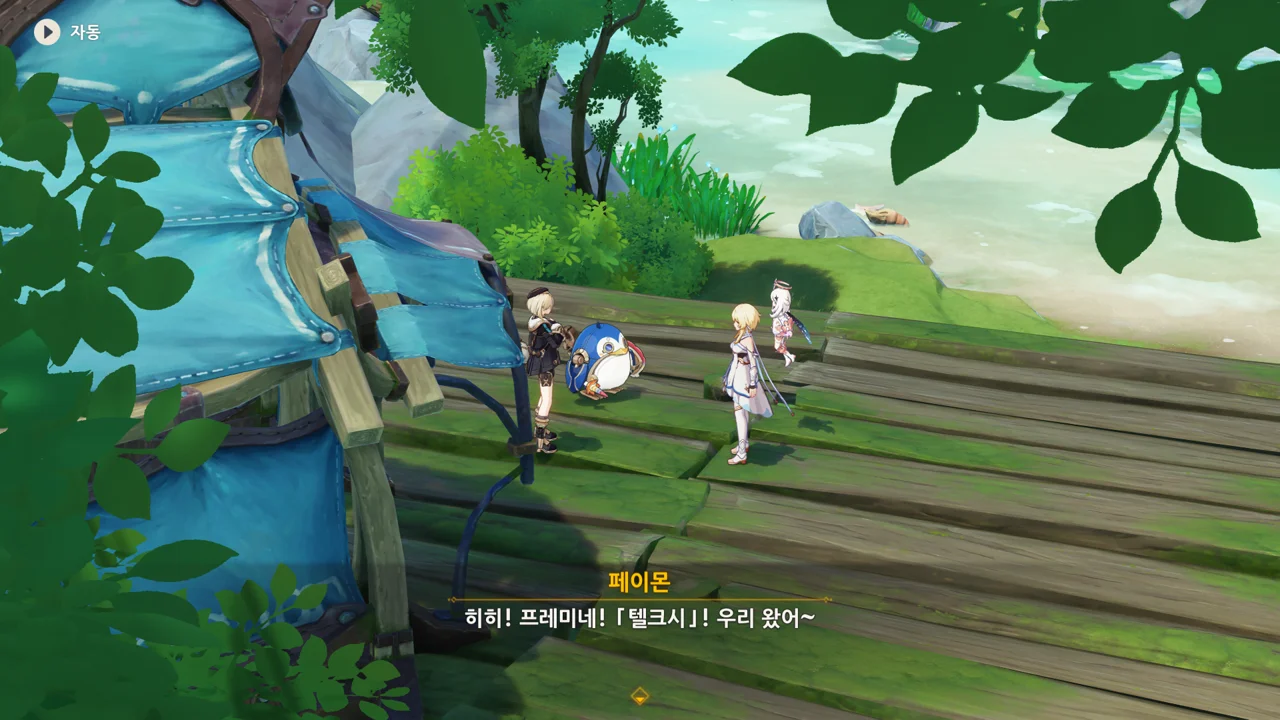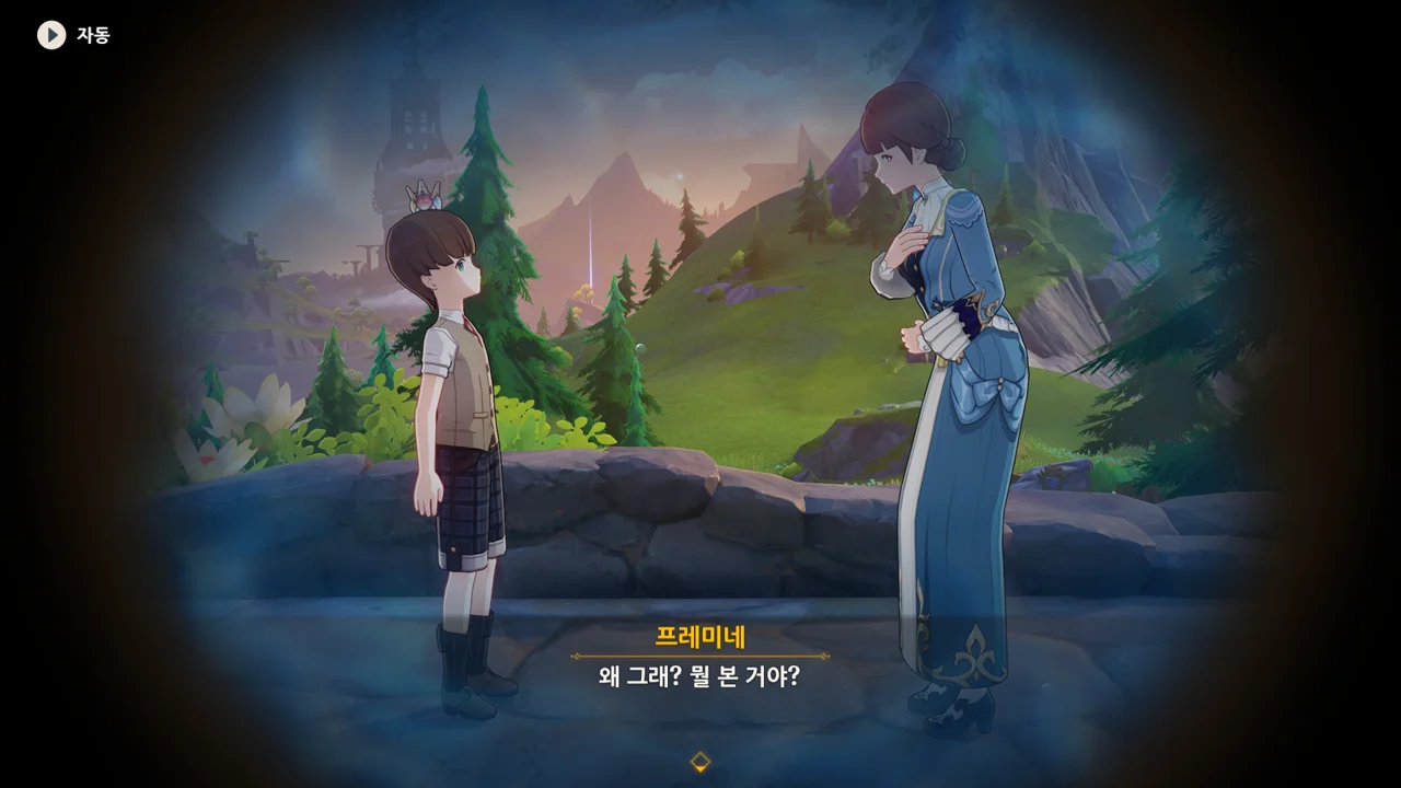 감격에 젖은 왕자는 무지개다리에 올라 지금까지 함께해 온 동료들을 둘러봤습니다. 여행자, 페이몬 여신, 프레미네, 그리고…