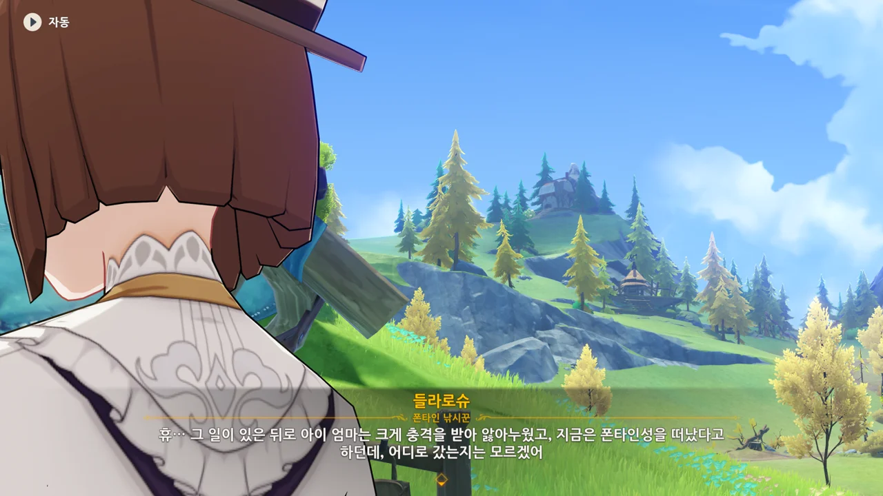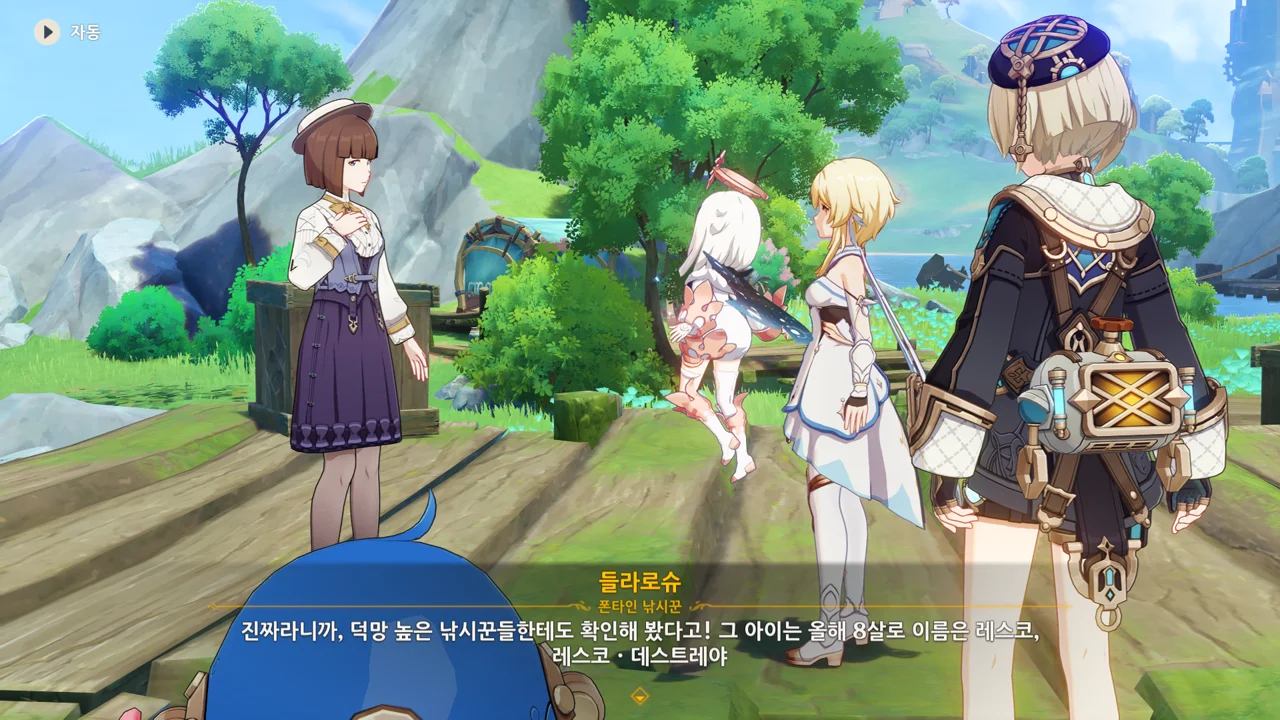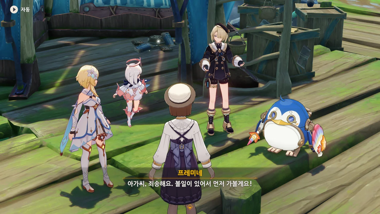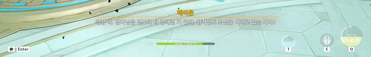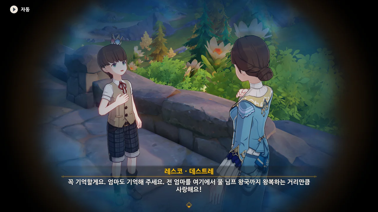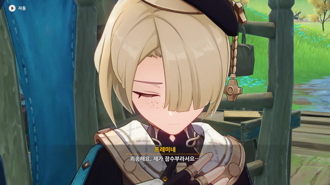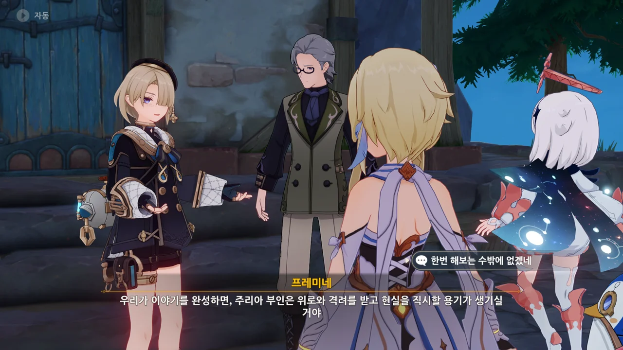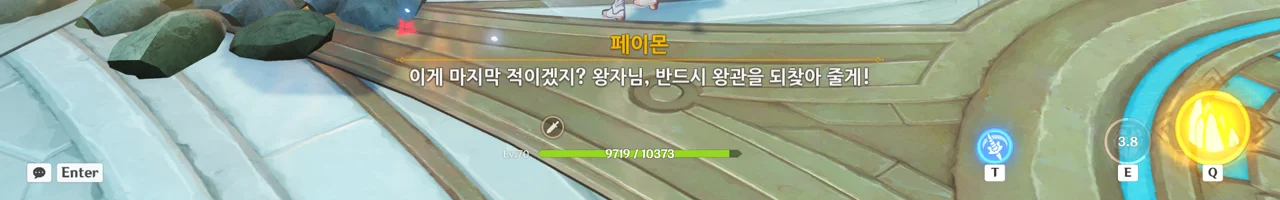 감격에 젖은 왕자는 무지개다리에 올라 지금까지 함께해 온 동료들을 둘러봤습니다. 여행자, 페이몬 여신, 프레미네, 그리고…