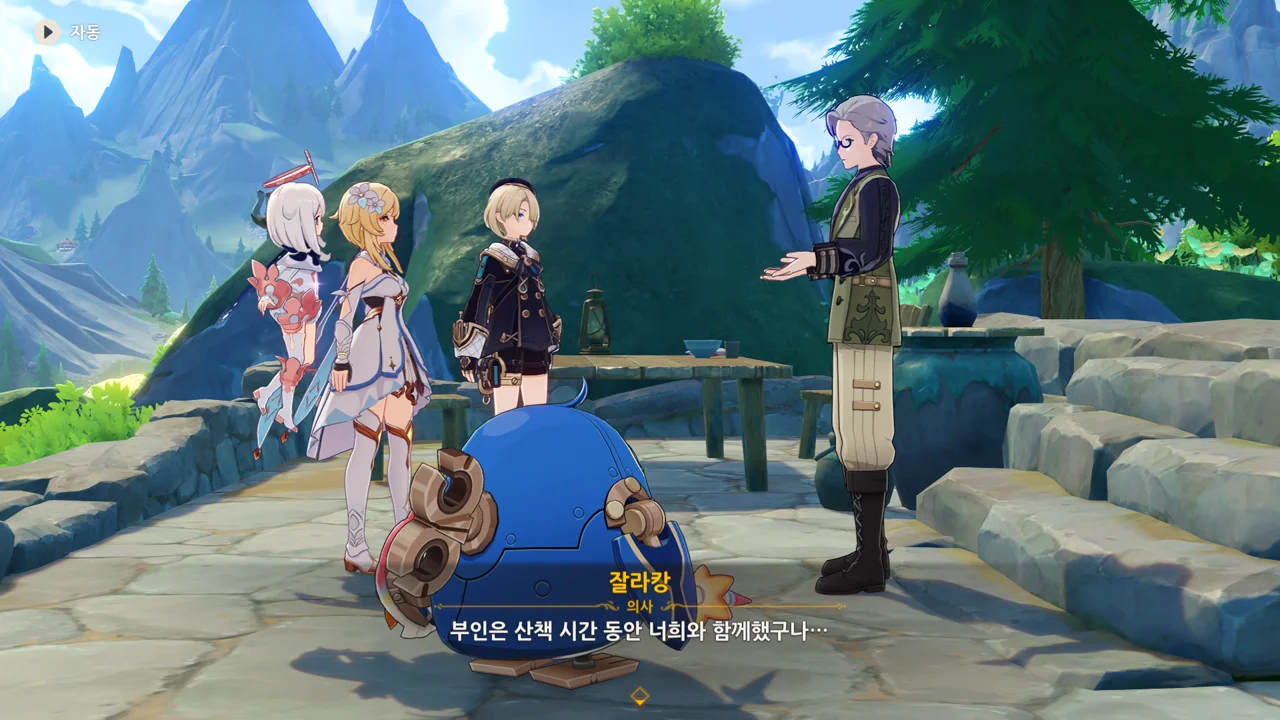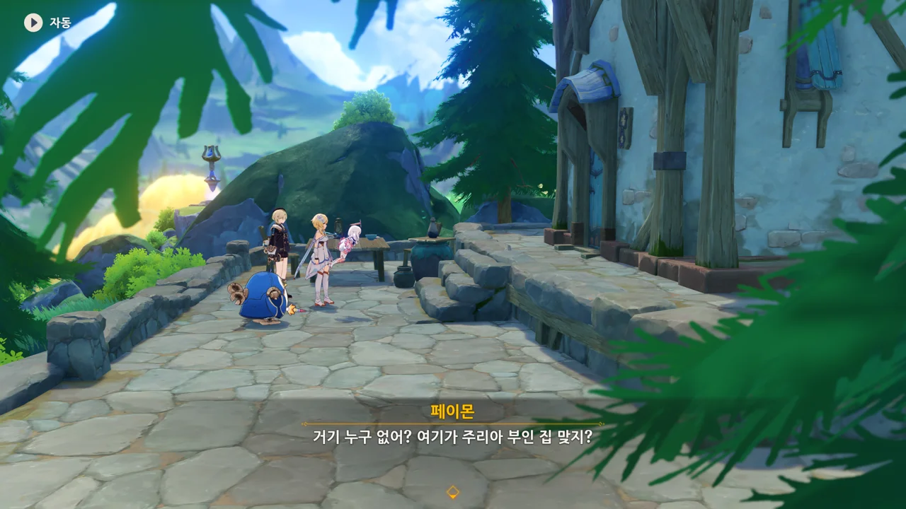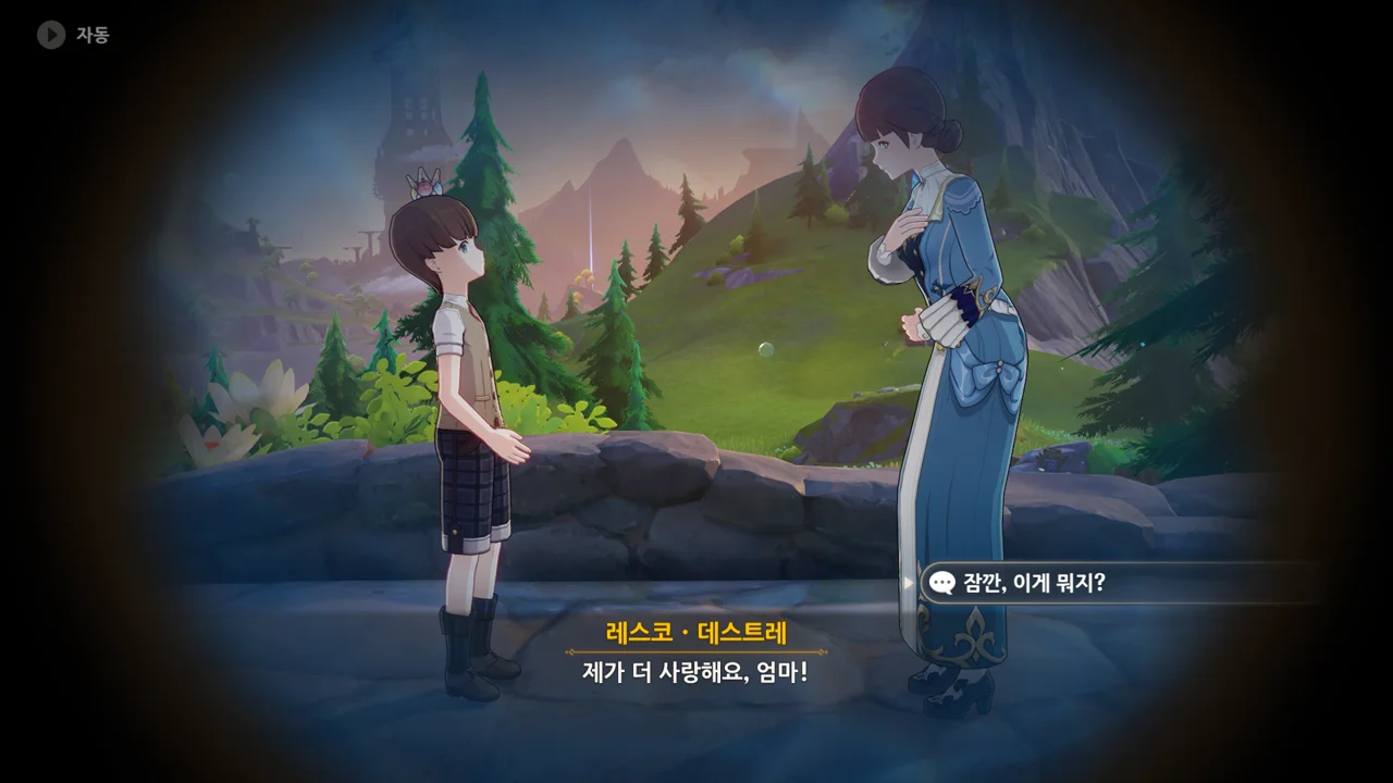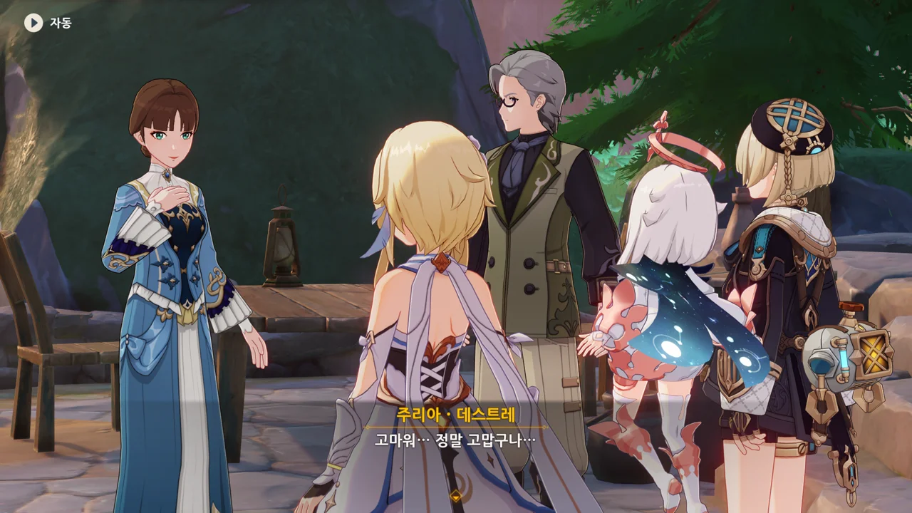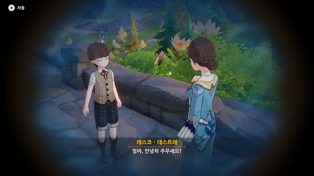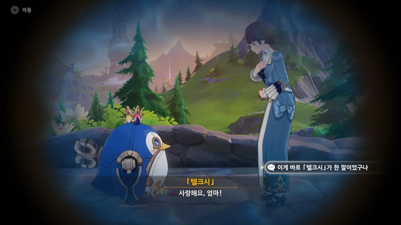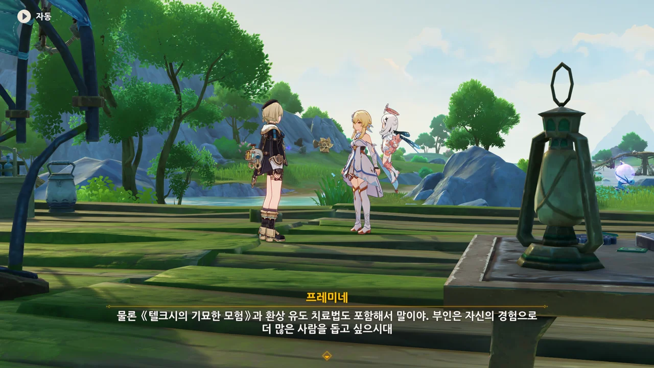 감격에 젖은 왕자는 무지개다리에 올라 지금까지 함께해 온 동료들을 둘러봤습니다. 여행자, 페이몬 여신, 프레미네, 그리고…