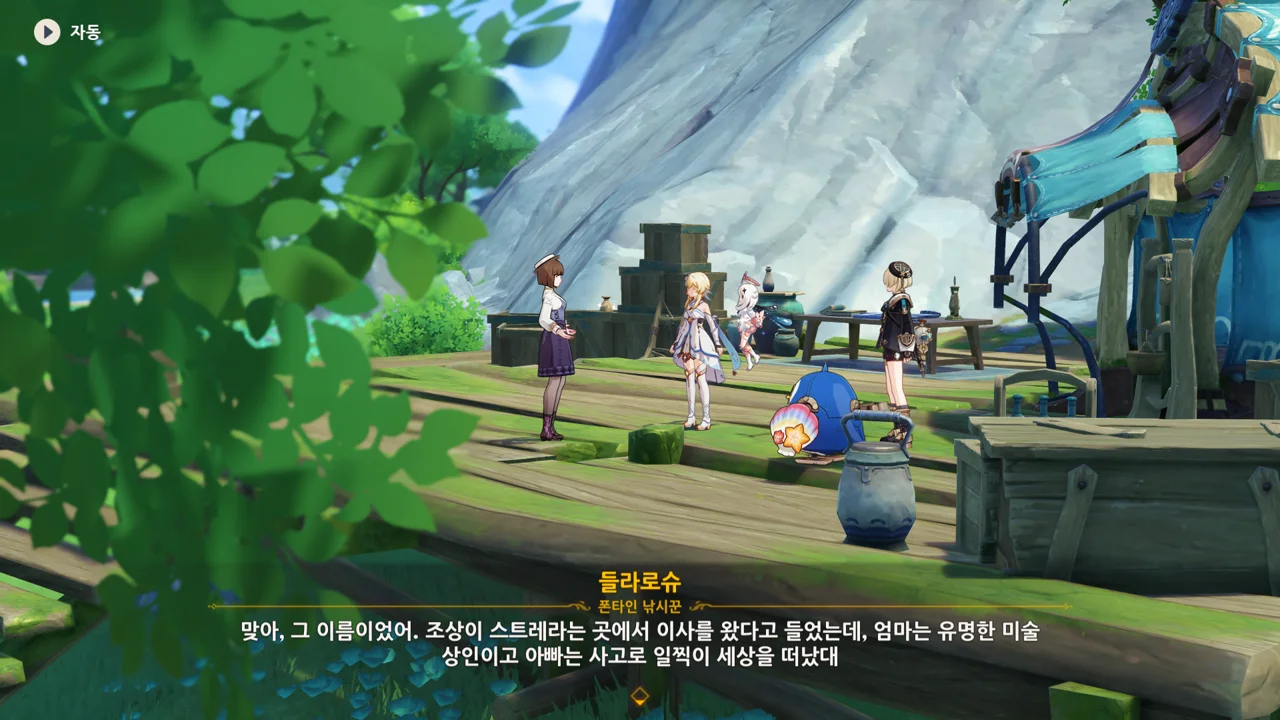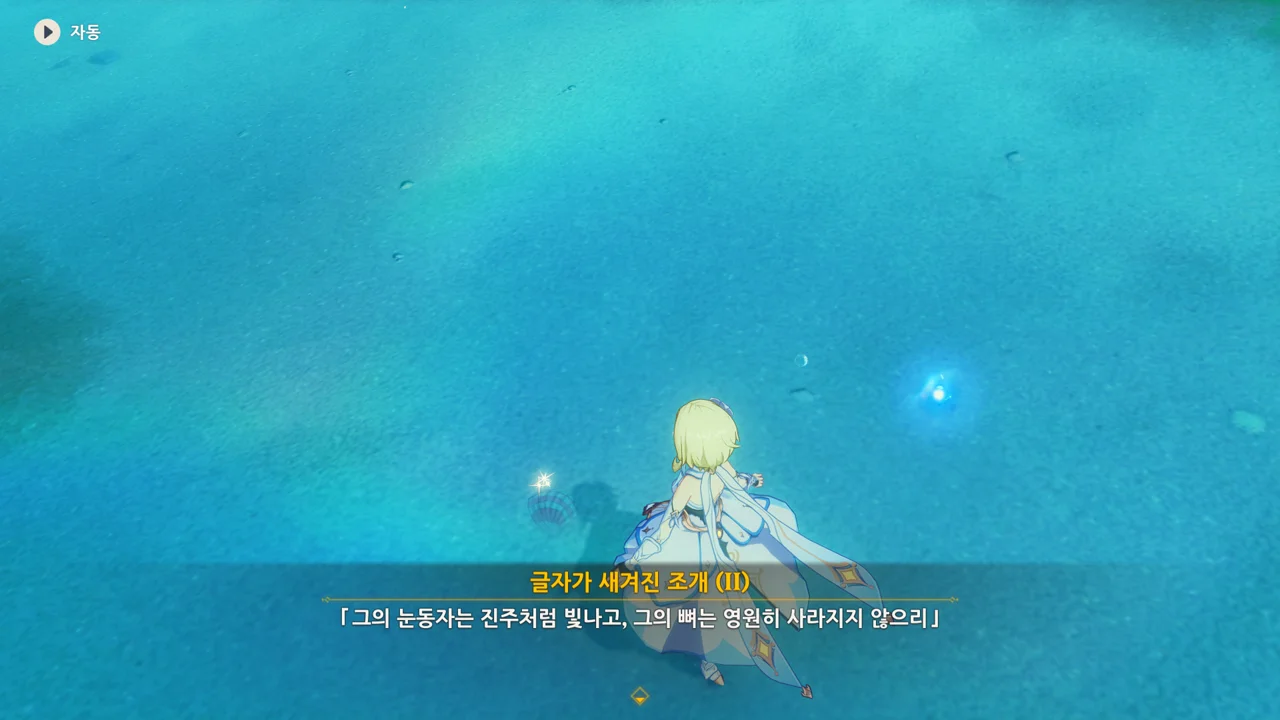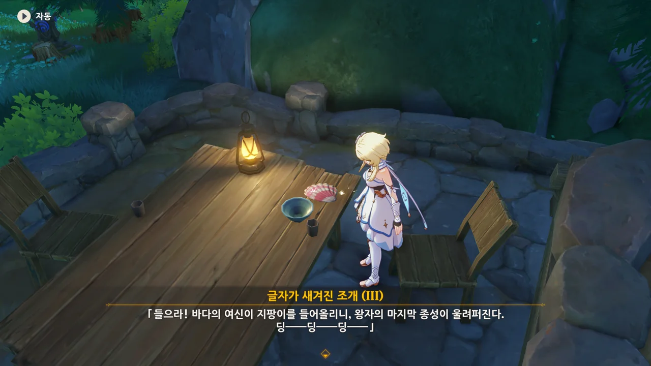 이벤트를 진행하며 곳곳에서 발견할 수 있었던 '글자가 새겨진 조개". 주리아의 집 앞에 있는 세 번째 조개에 적힌 내용을 읽고 나서야 그게 폰타인 월드 임무를 위한 것이 아니라 이번 이벤트를 위한 것임을 깨달았다.