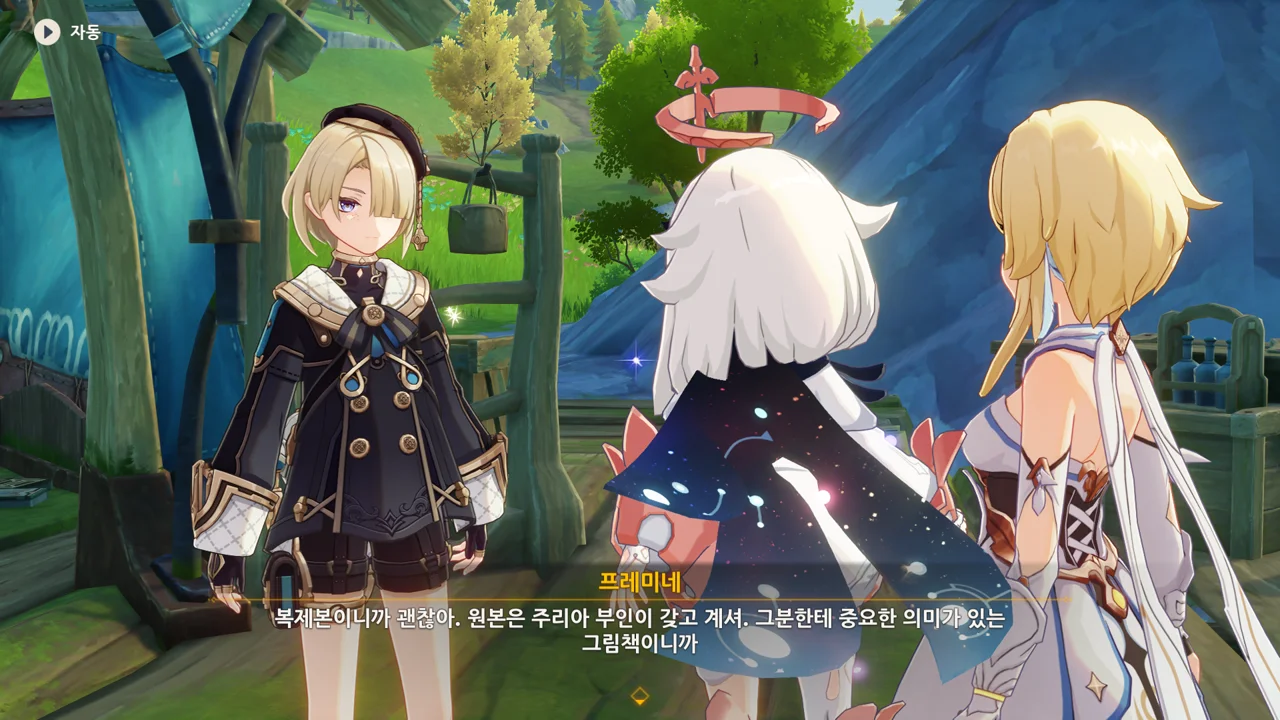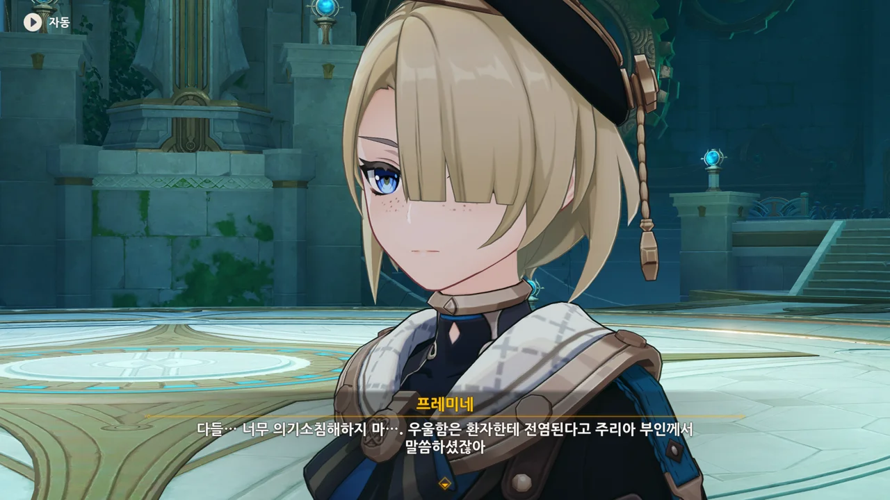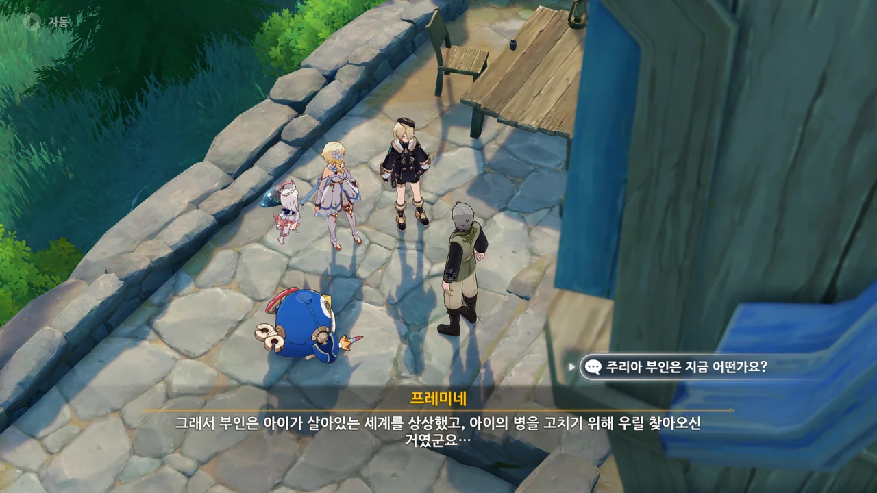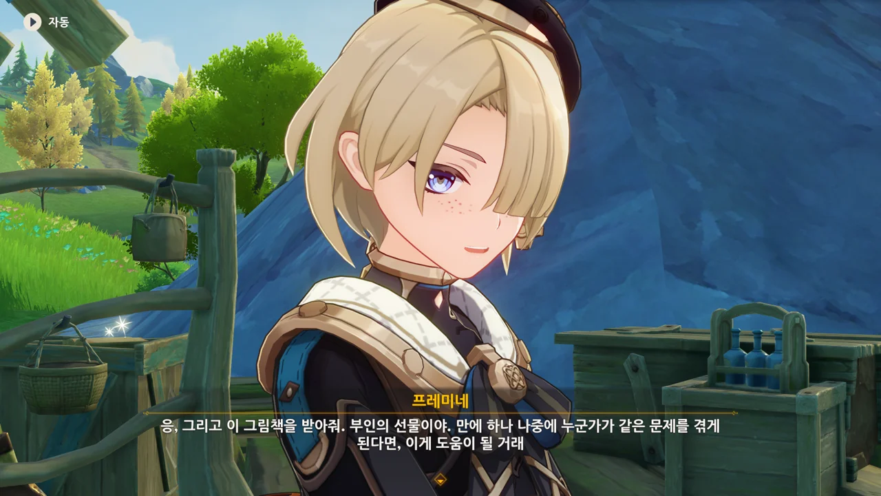 레스코를 위한 그림책을 만들며 주리아의 상태가 호전되었으니, 그림책을 완성하면 주리아의 상태가 좋아질 거라고 말하는 프레미네.