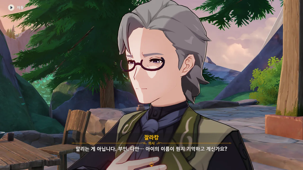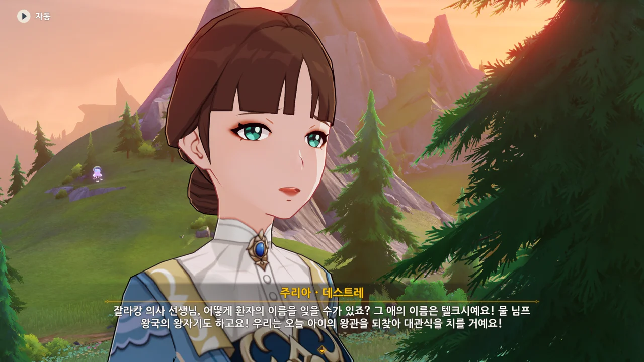 주치의 잘라캉이 확인차 아이의 이름을 묻자, 자신의 아이 이름이 텔크시이며 물 님프 왕국의 왕자라고 말하는 주리아.
