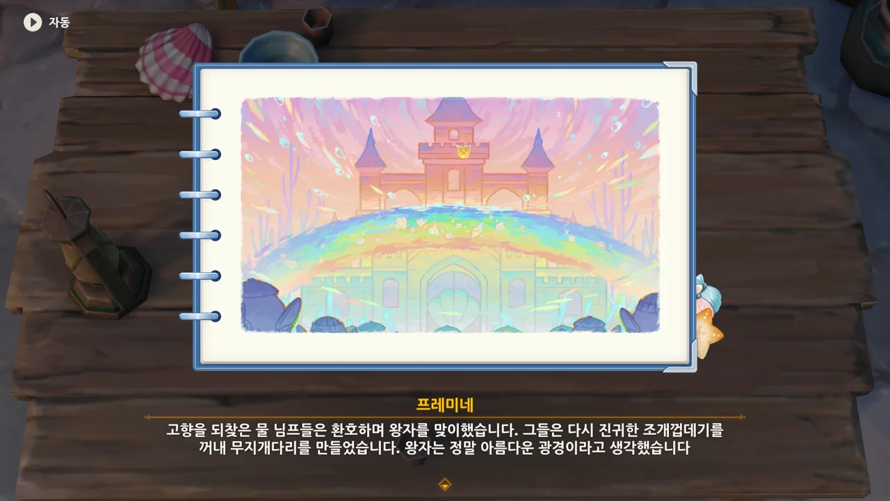 고향을 되찾은 물 님프들은 환호하며 왕자를 맞이했습니다. 그들은 다시 진귀한 조개껍데기를 꺼내 무지개다리를 만들었습니다. 왕자는 정말 아름다운 광경이라고 생각했습니다.