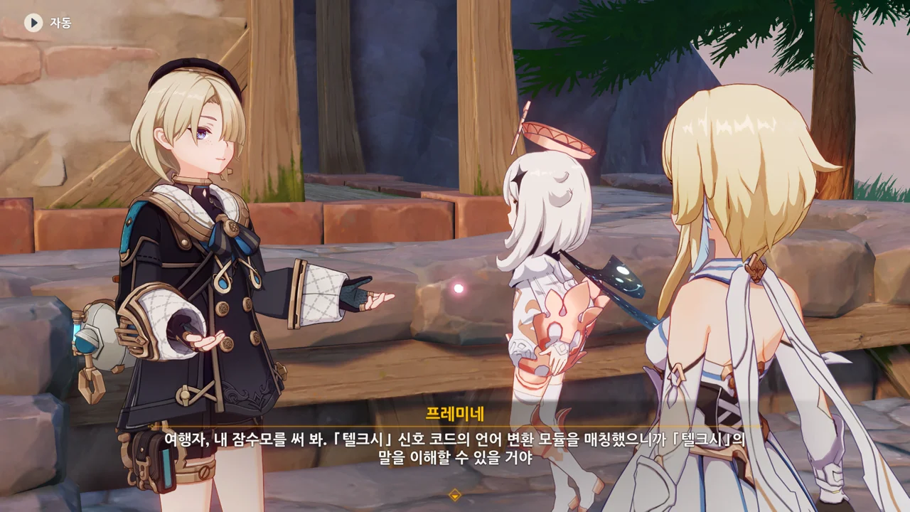 프레미네가 이걸 쓰면 텔크시의 말을 이해할 수 있을 거라며, 자신의 잠수모를 건네준다.
