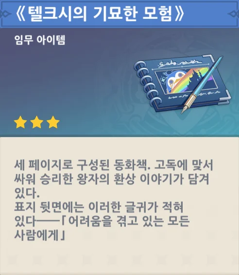 그리고 주리아는 프레미네를 통해 누군가 같은 문제를 겪게 된다면 《텔크시의 기묘한 모험》이 도움이 될 거라며, 그림책의 복제본을 여행자에게 건네주었다.