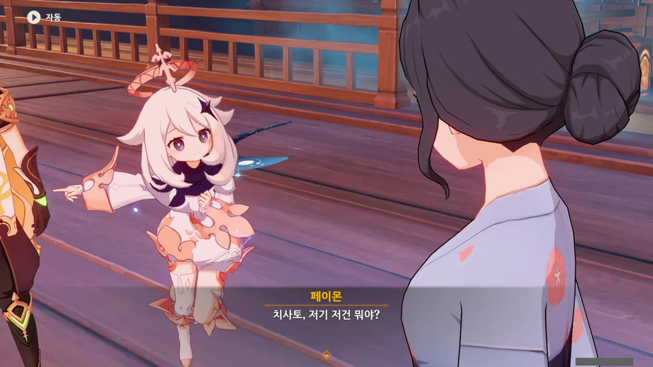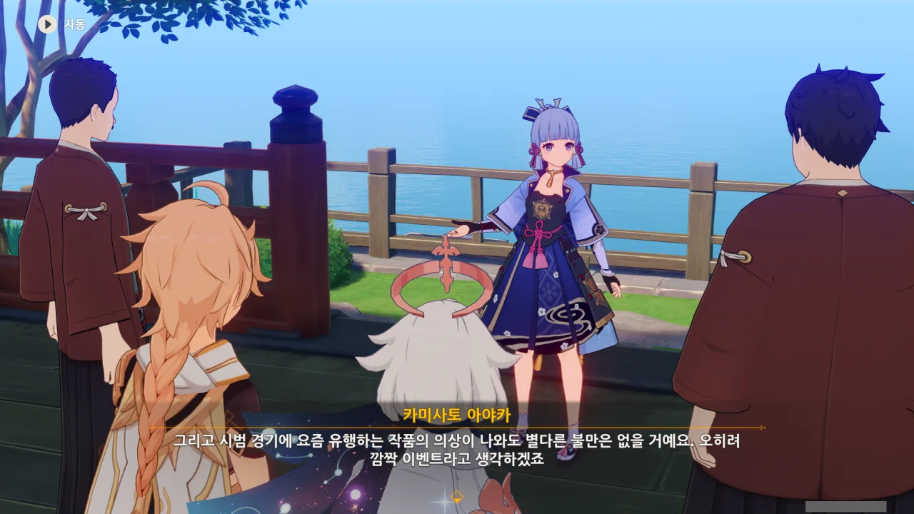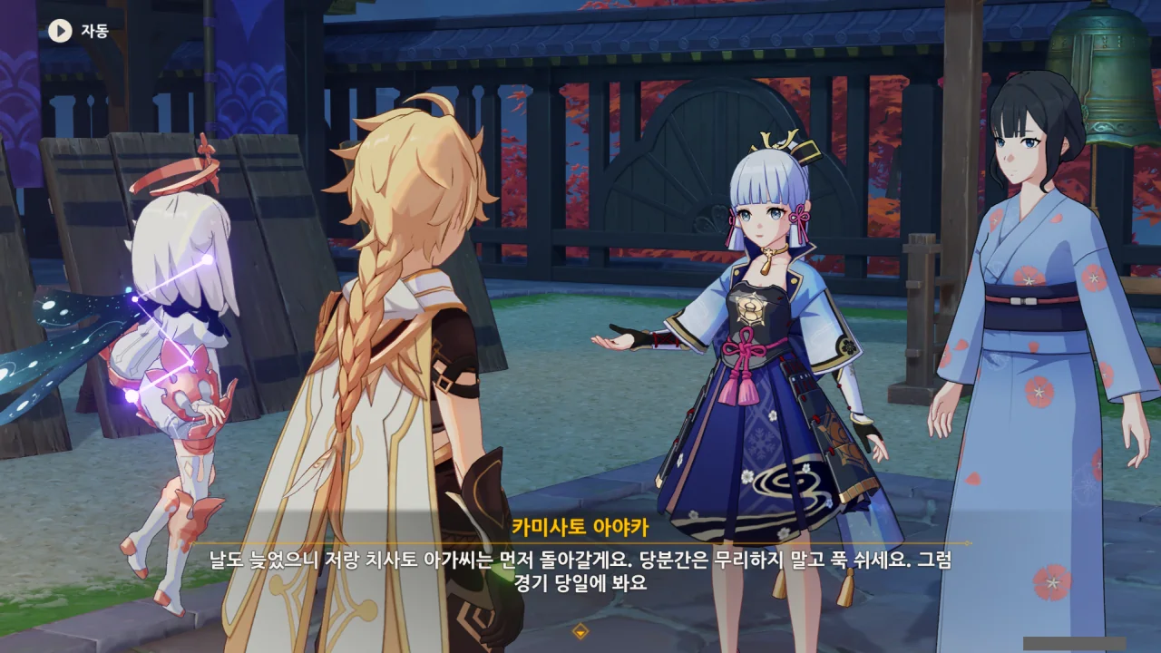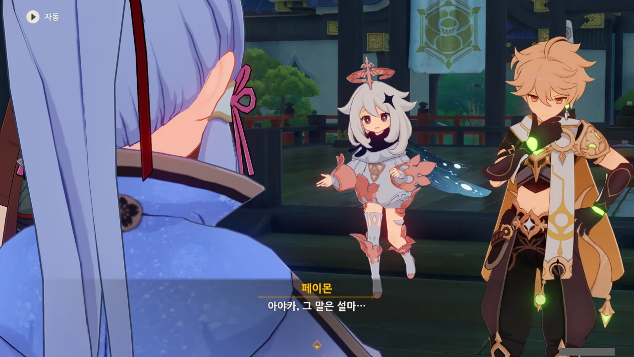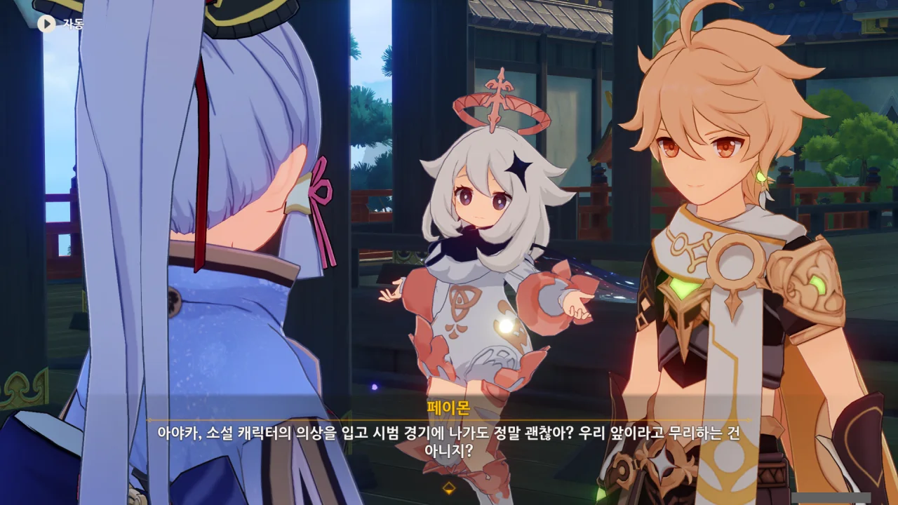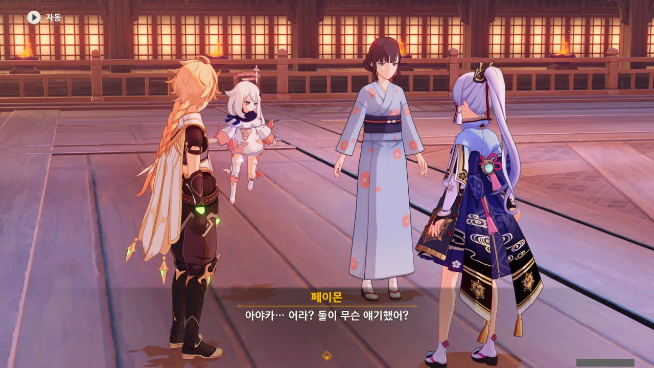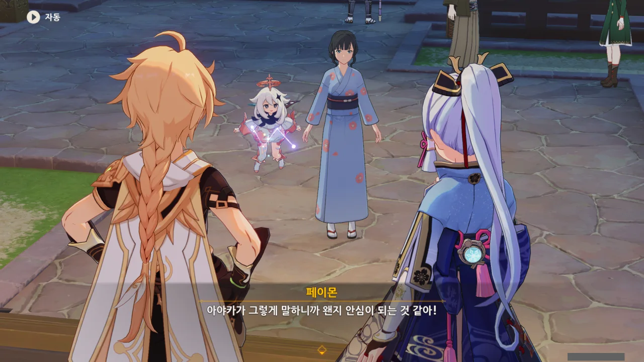 어느새 돌아온 페이몬이 무슨 이야기를 하고 있었느냐 물어보자, 아야카가 아까처럼 대충 얼버무린다.