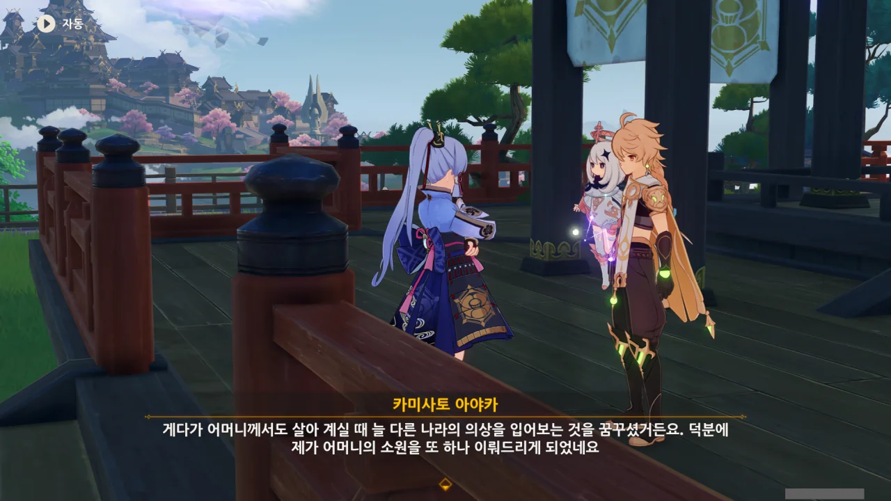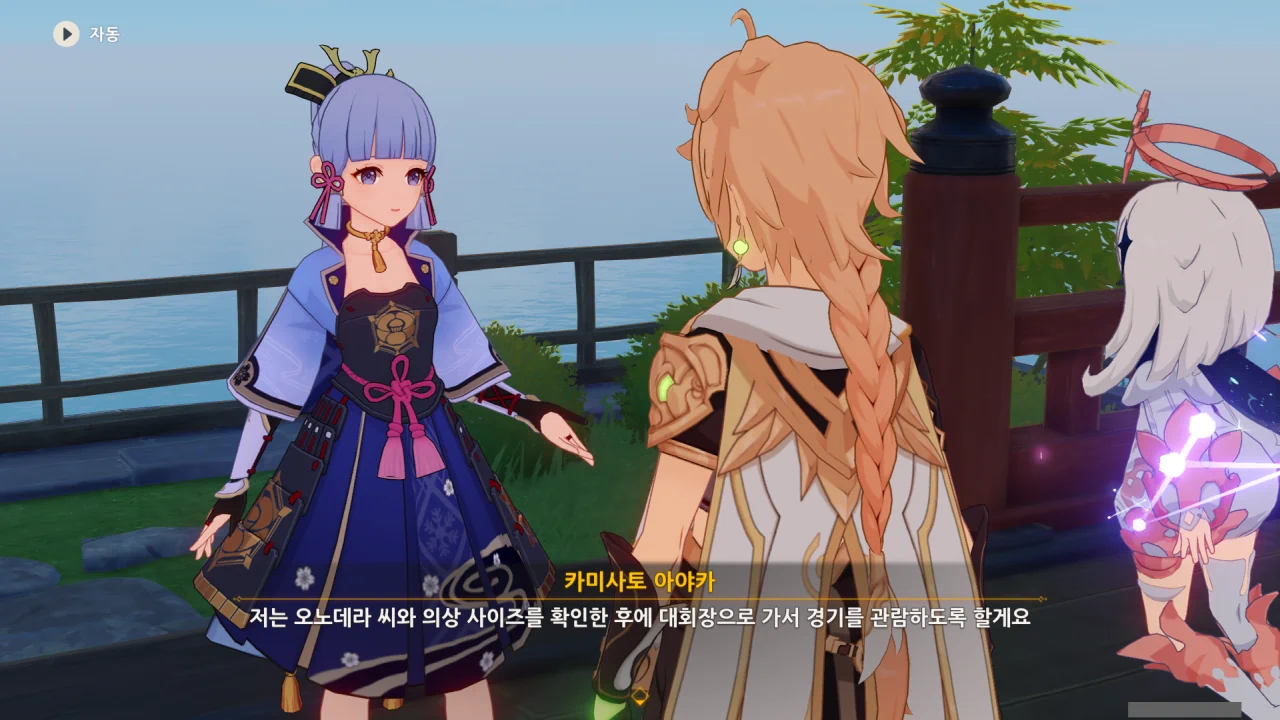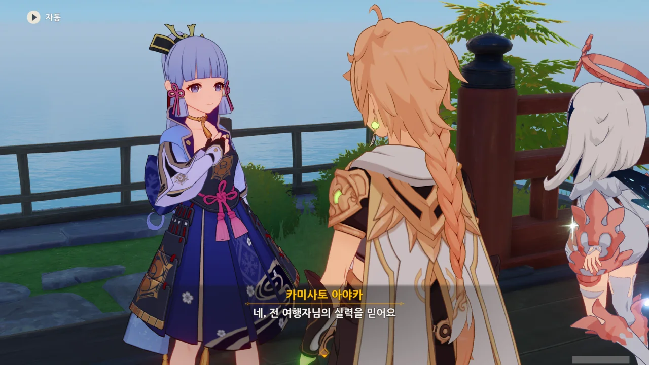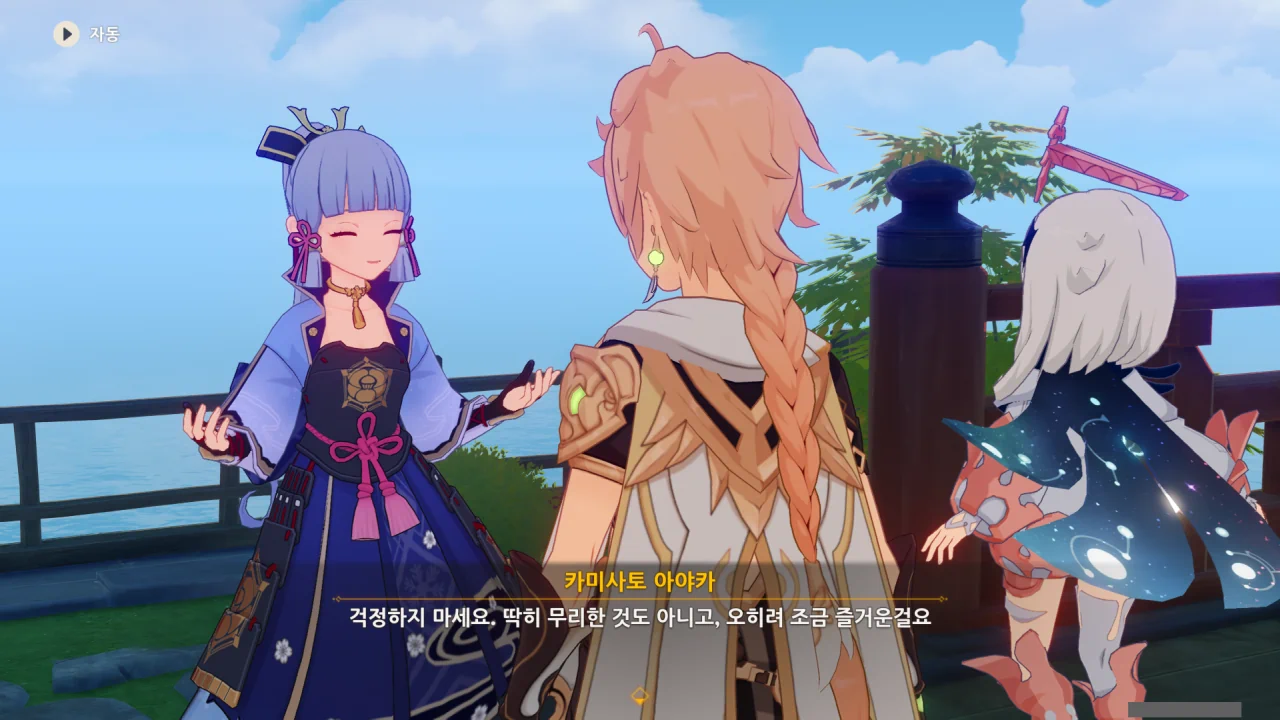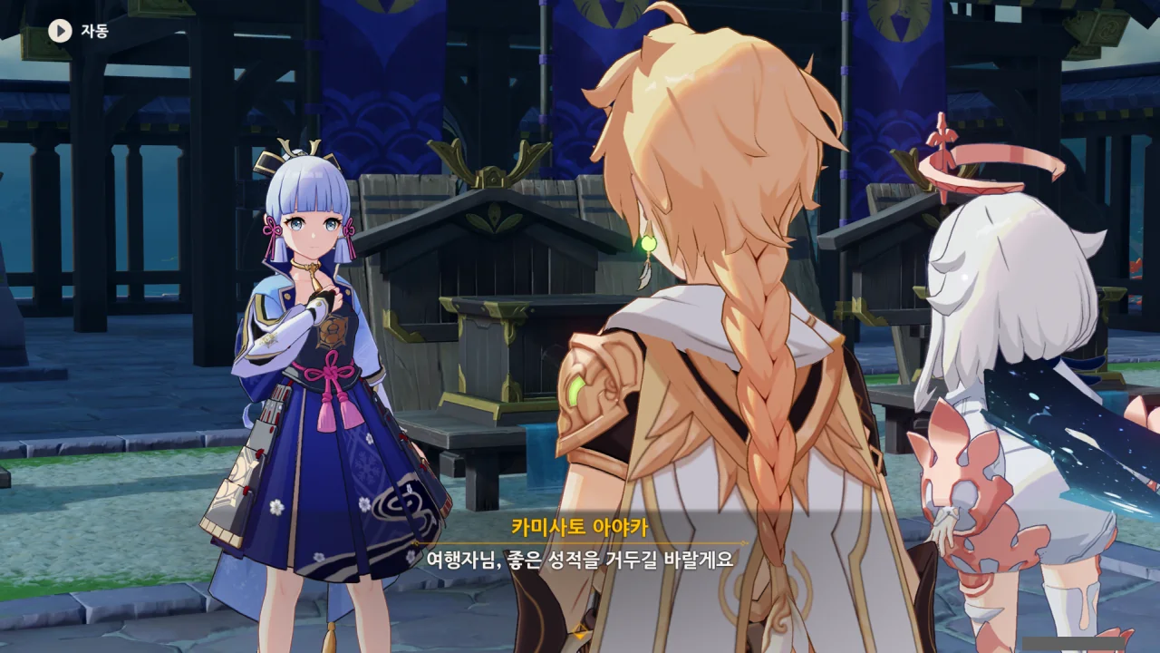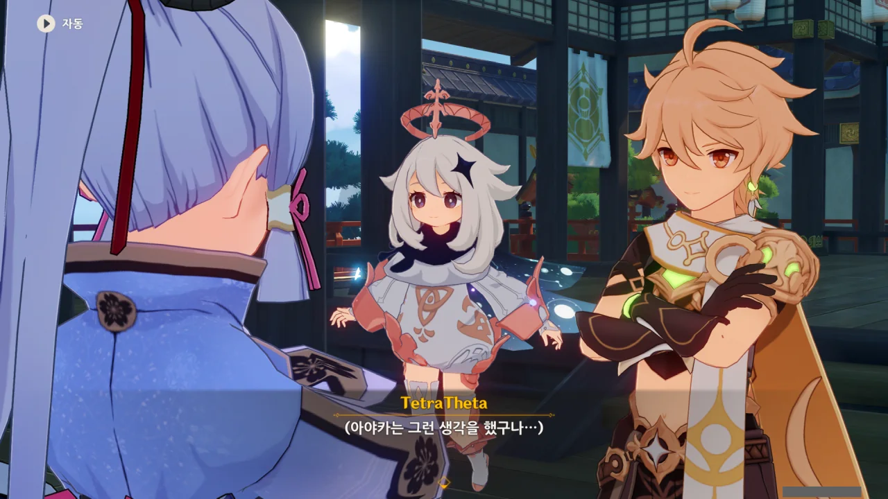 어느새 돌아온 페이몬이 무슨 이야기를 하고 있었느냐 물어보자, 아야카가 아까처럼 대충 얼버무린다.