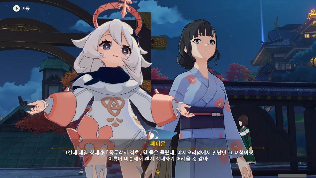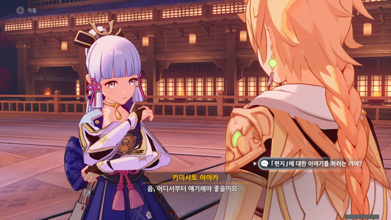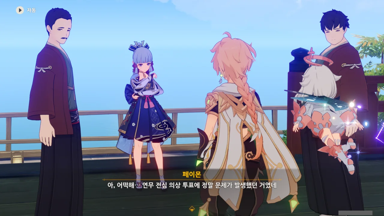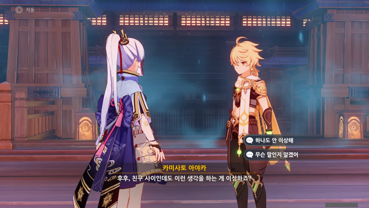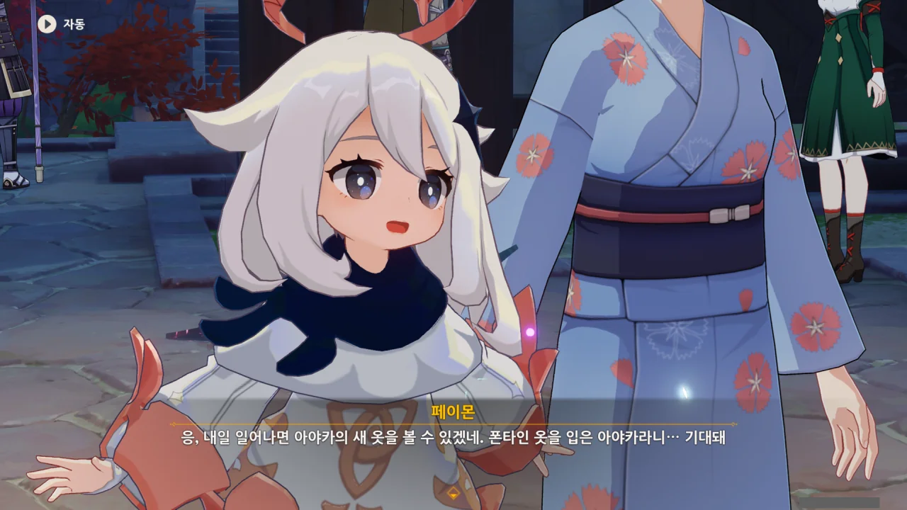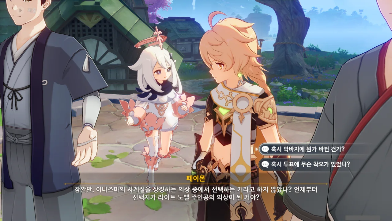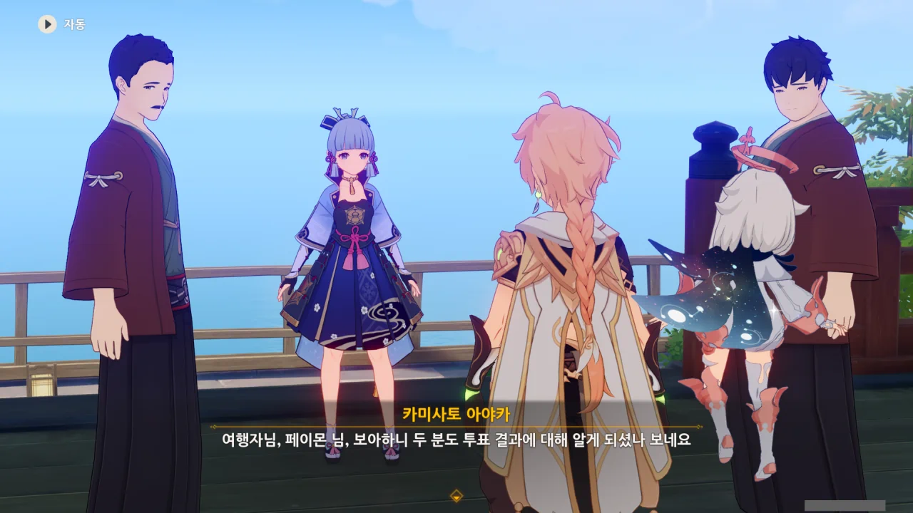 어느새 돌아온 페이몬이 무슨 이야기를 하고 있었느냐 물어보자, 아야카가 아까처럼 대충 얼버무린다.