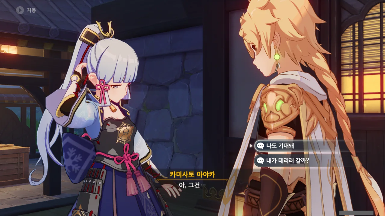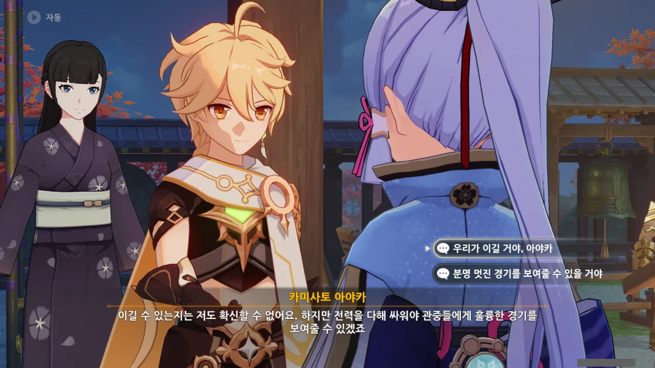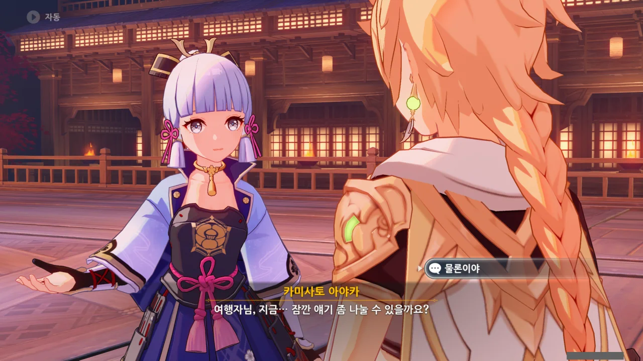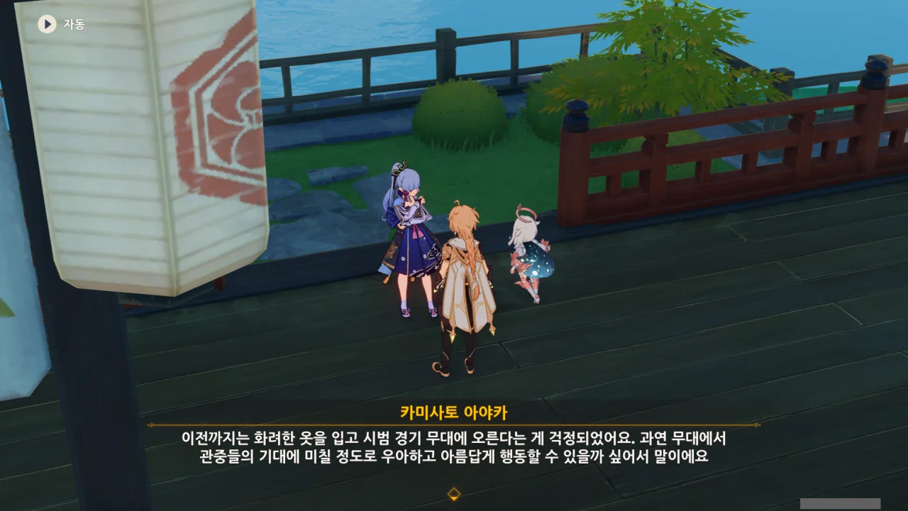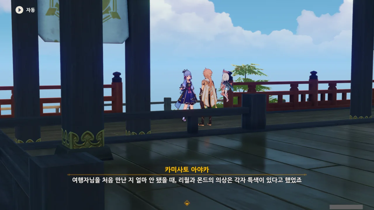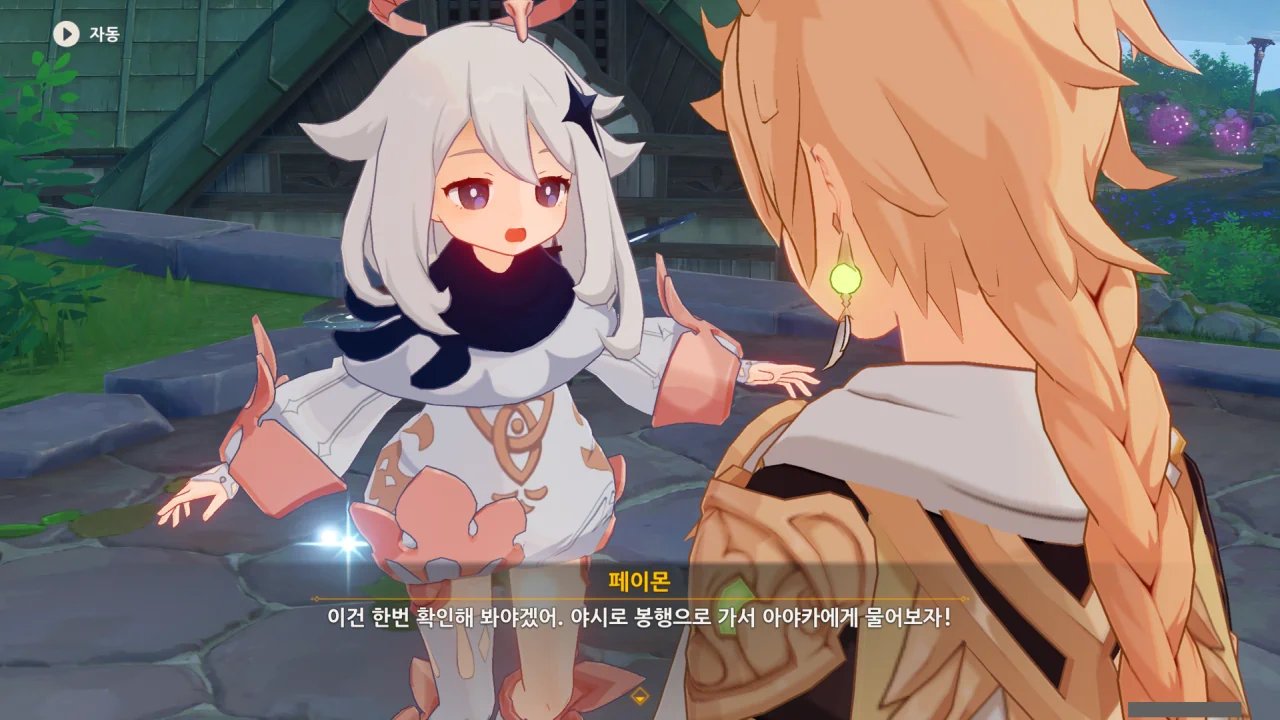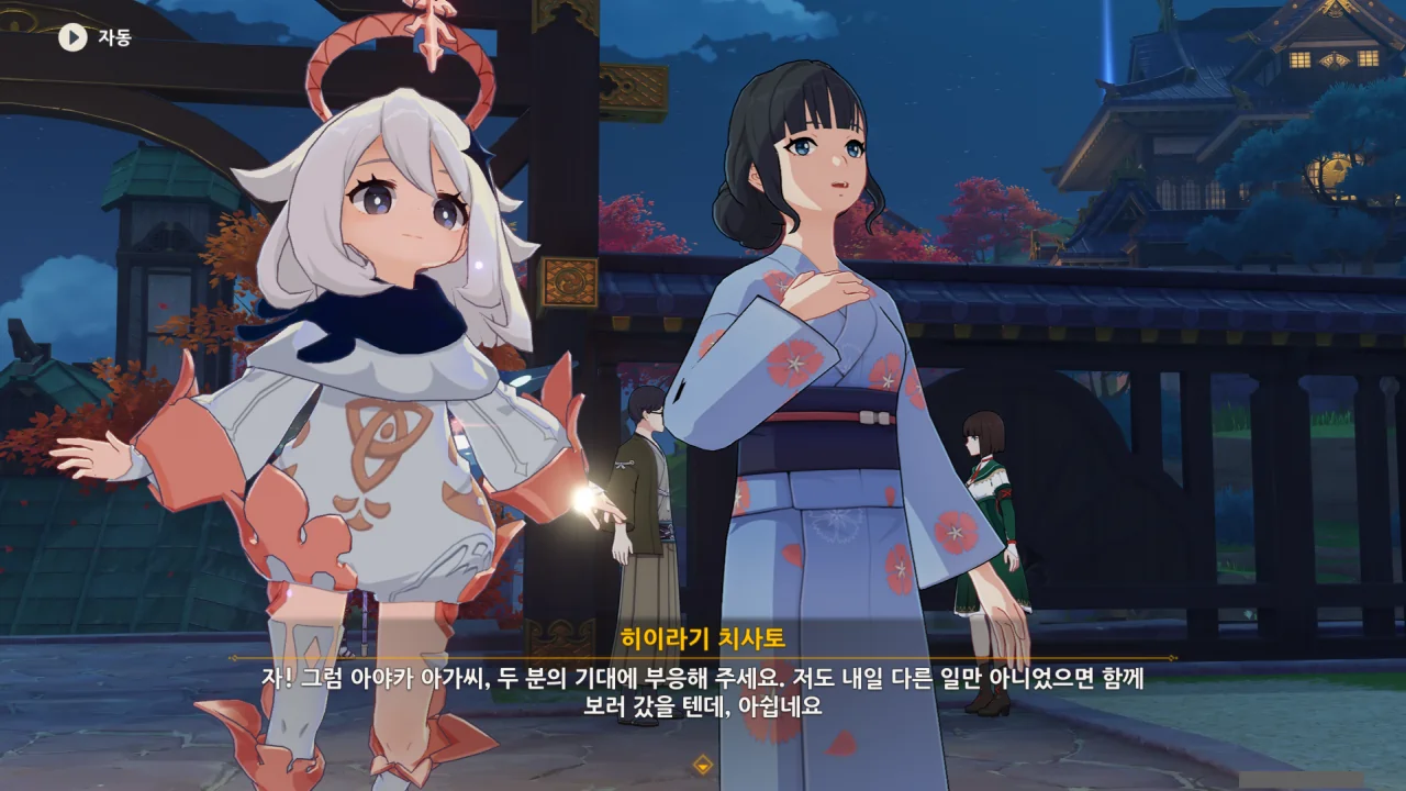 어느새 돌아온 페이몬이 무슨 이야기를 하고 있었느냐 물어보자, 아야카가 아까처럼 대충 얼버무린다.