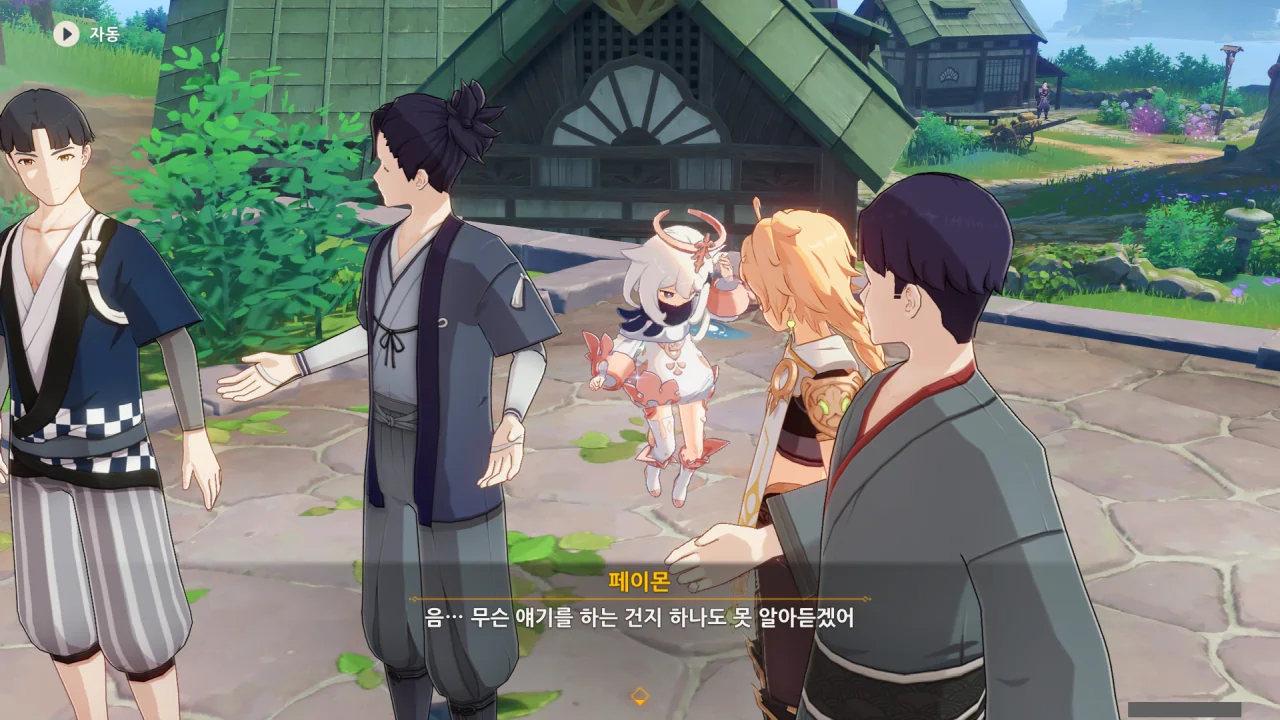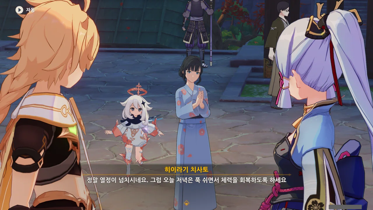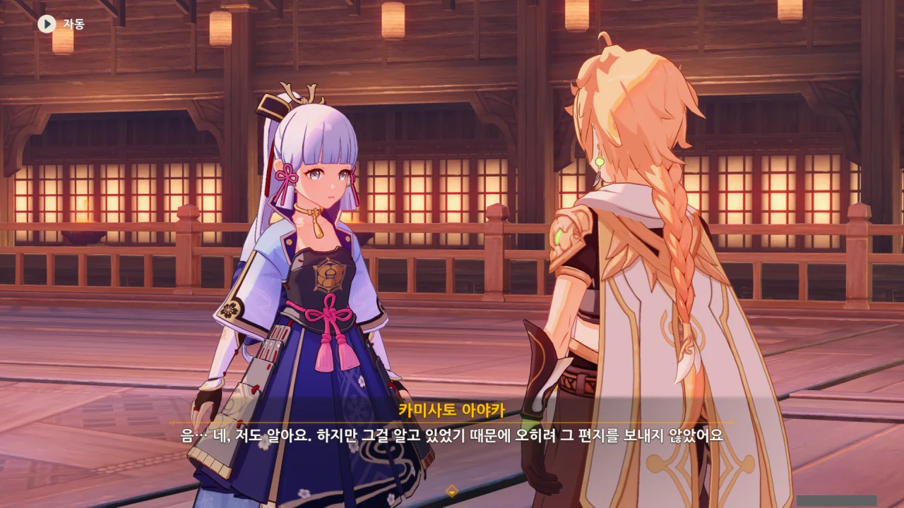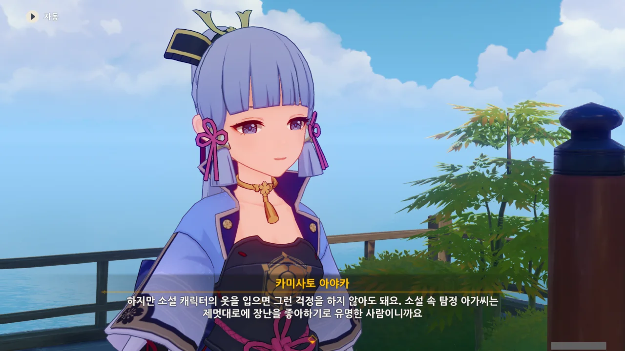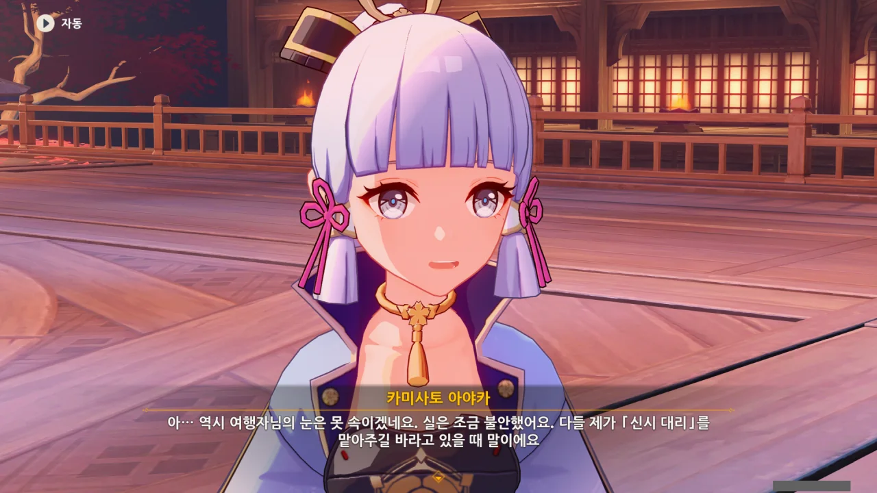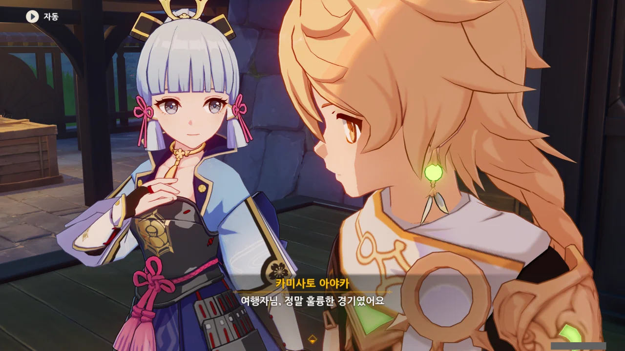 어느새 돌아온 페이몬이 무슨 이야기를 하고 있었느냐 물어보자, 아야카가 아까처럼 대충 얼버무린다.