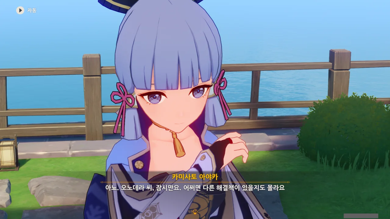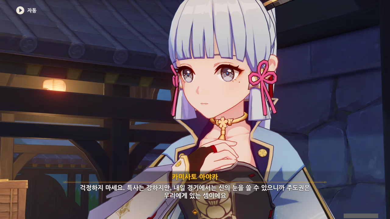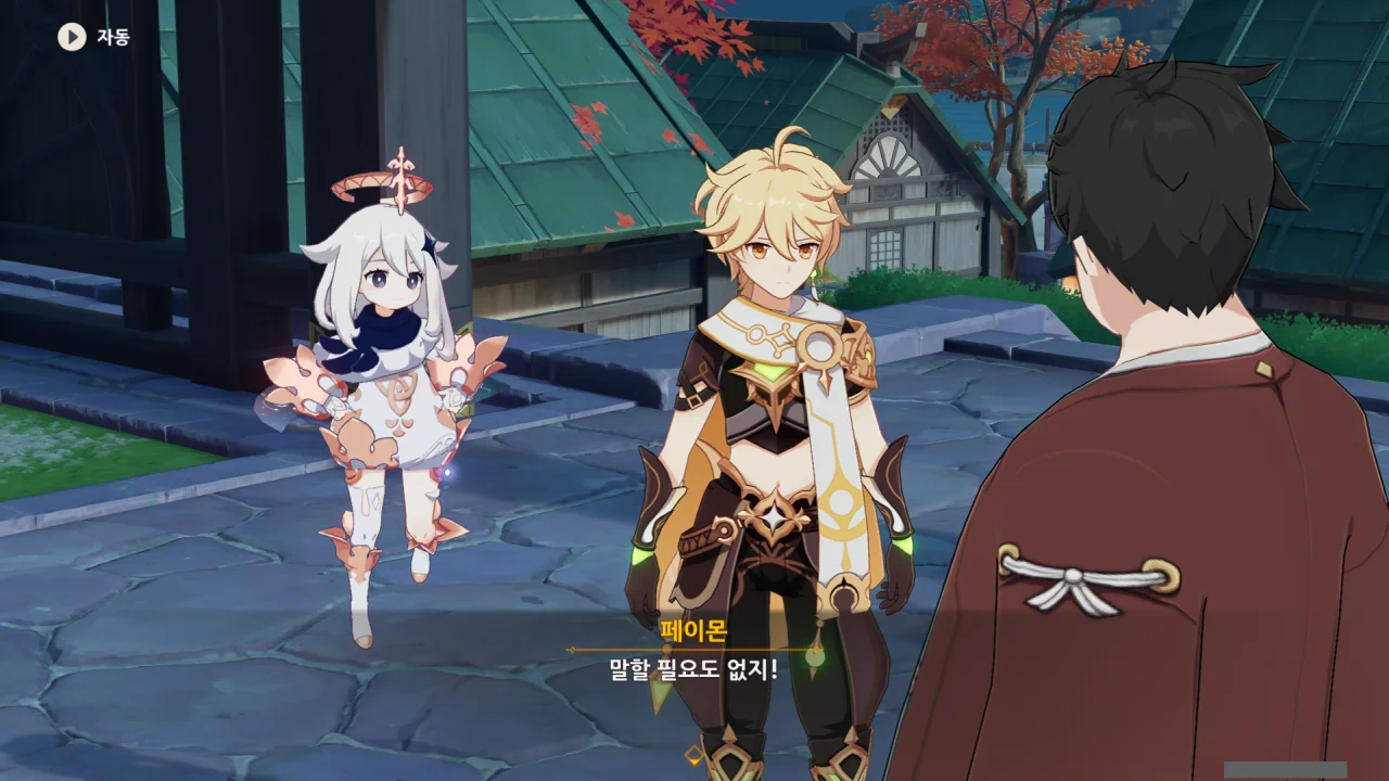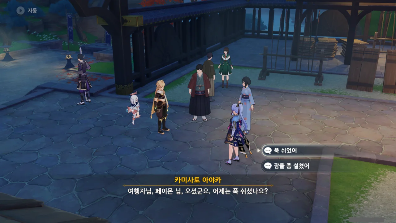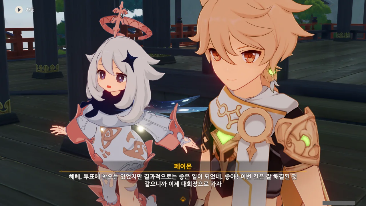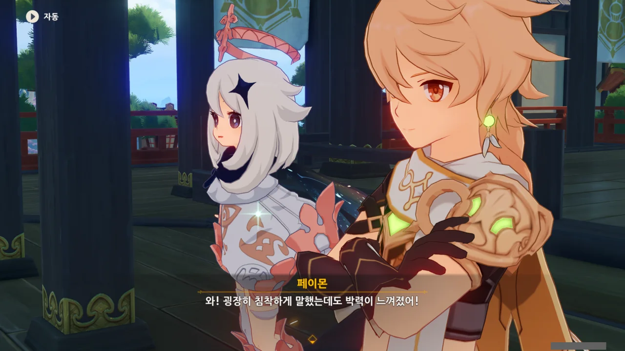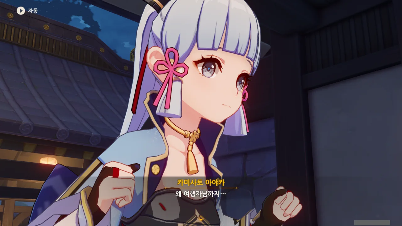 어느새 돌아온 페이몬이 무슨 이야기를 하고 있었느냐 물어보자, 아야카가 아까처럼 대충 얼버무린다.