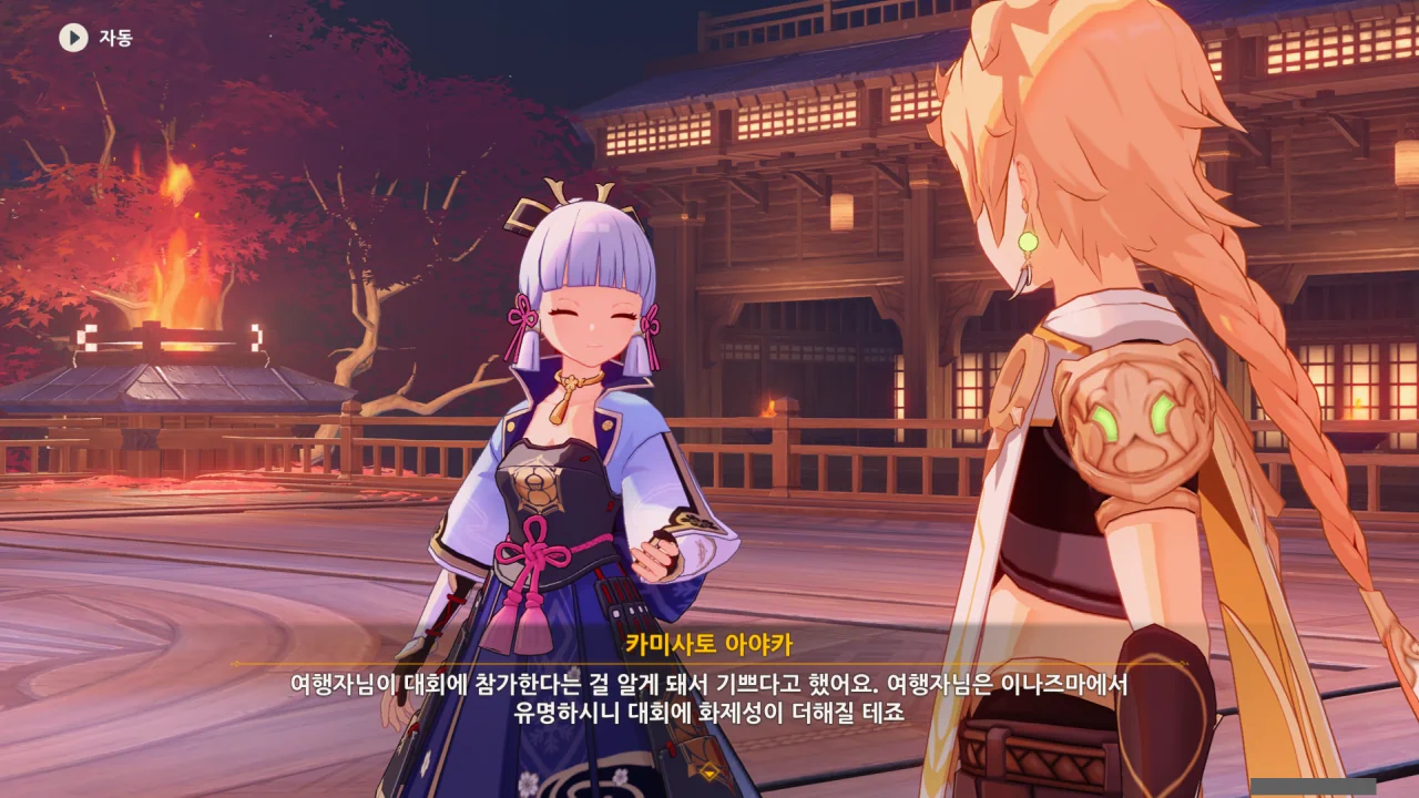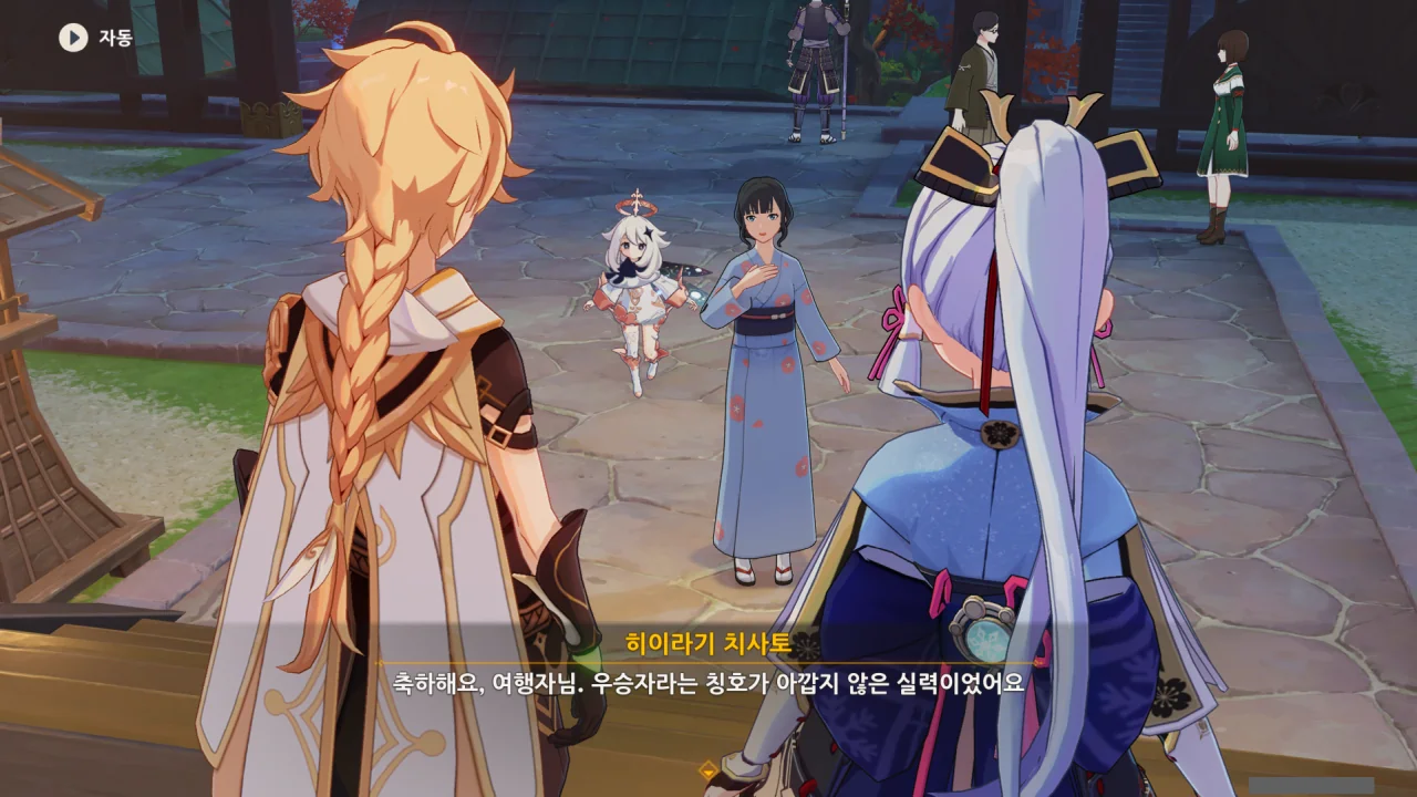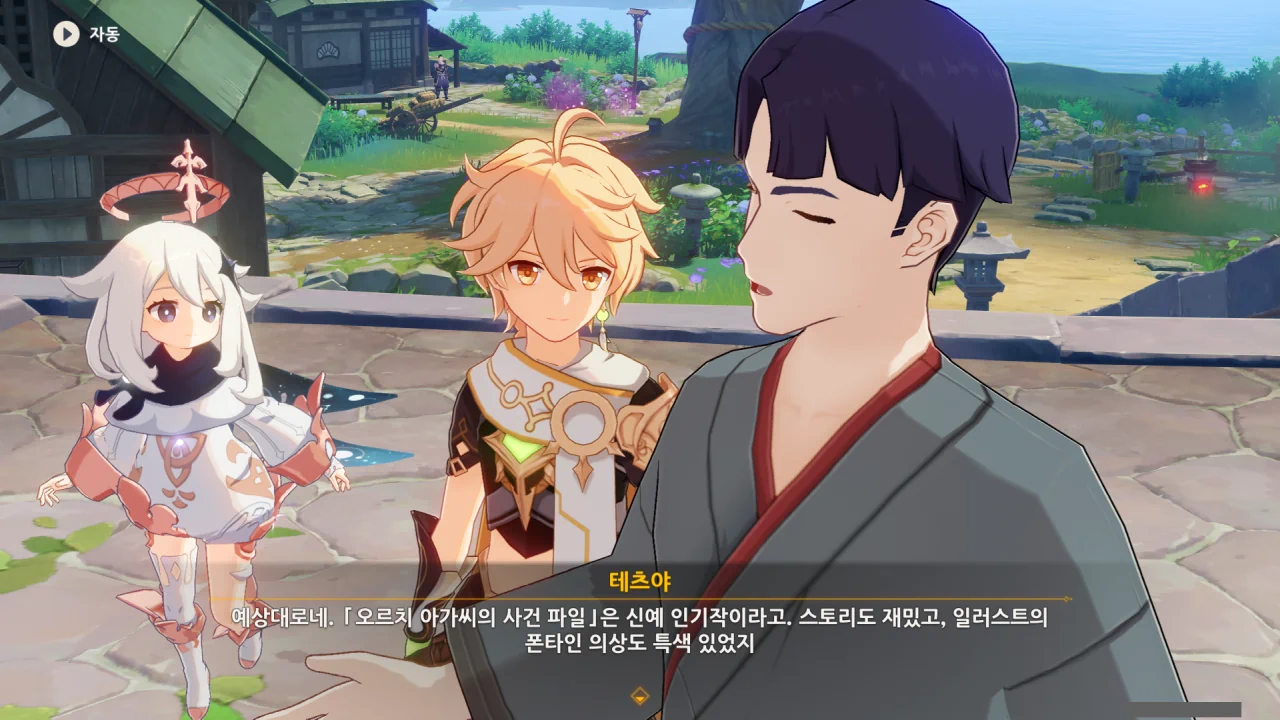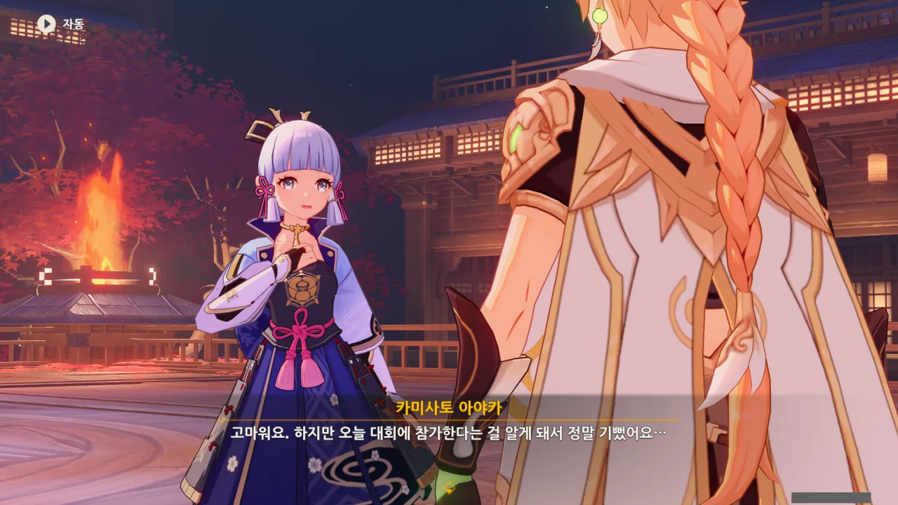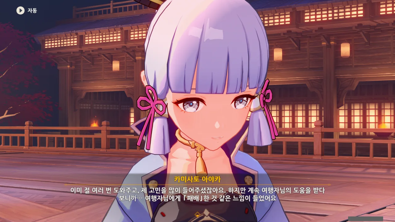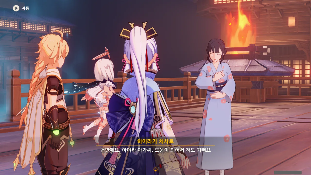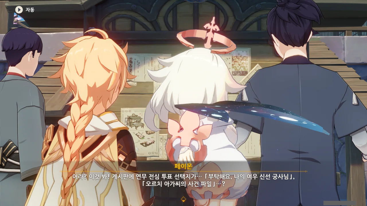 어느새 돌아온 페이몬이 무슨 이야기를 하고 있었느냐 물어보자, 아야카가 아까처럼 대충 얼버무린다.