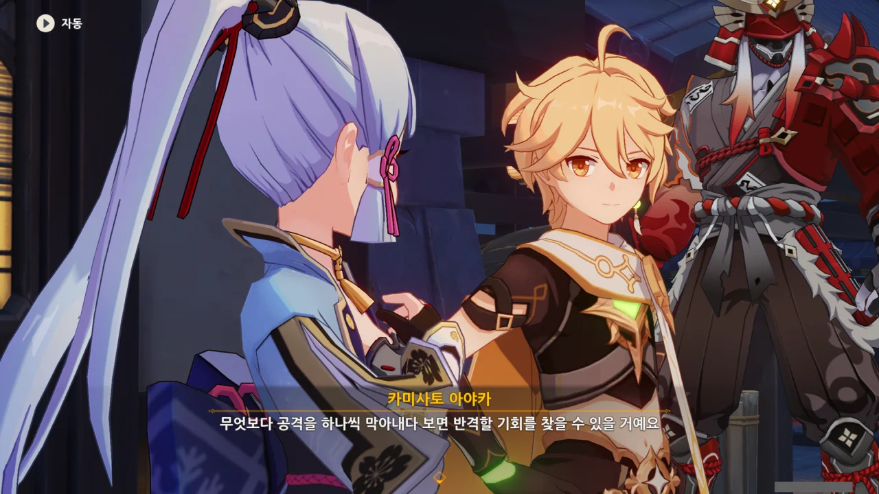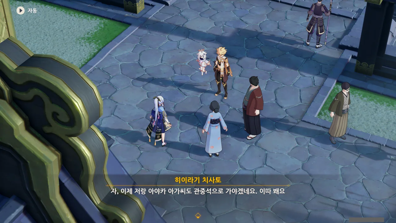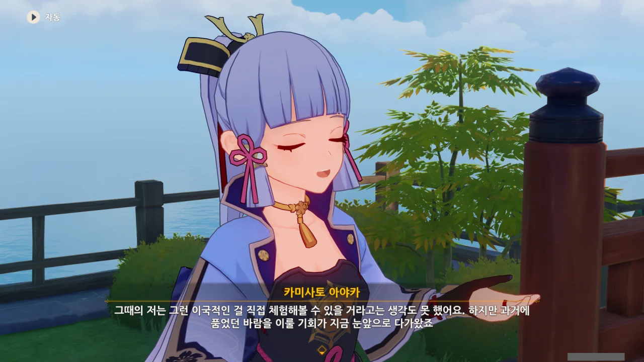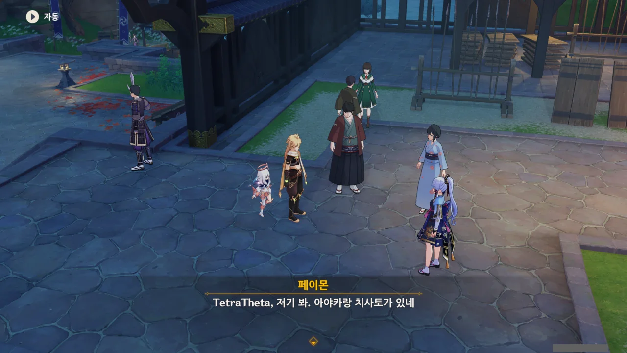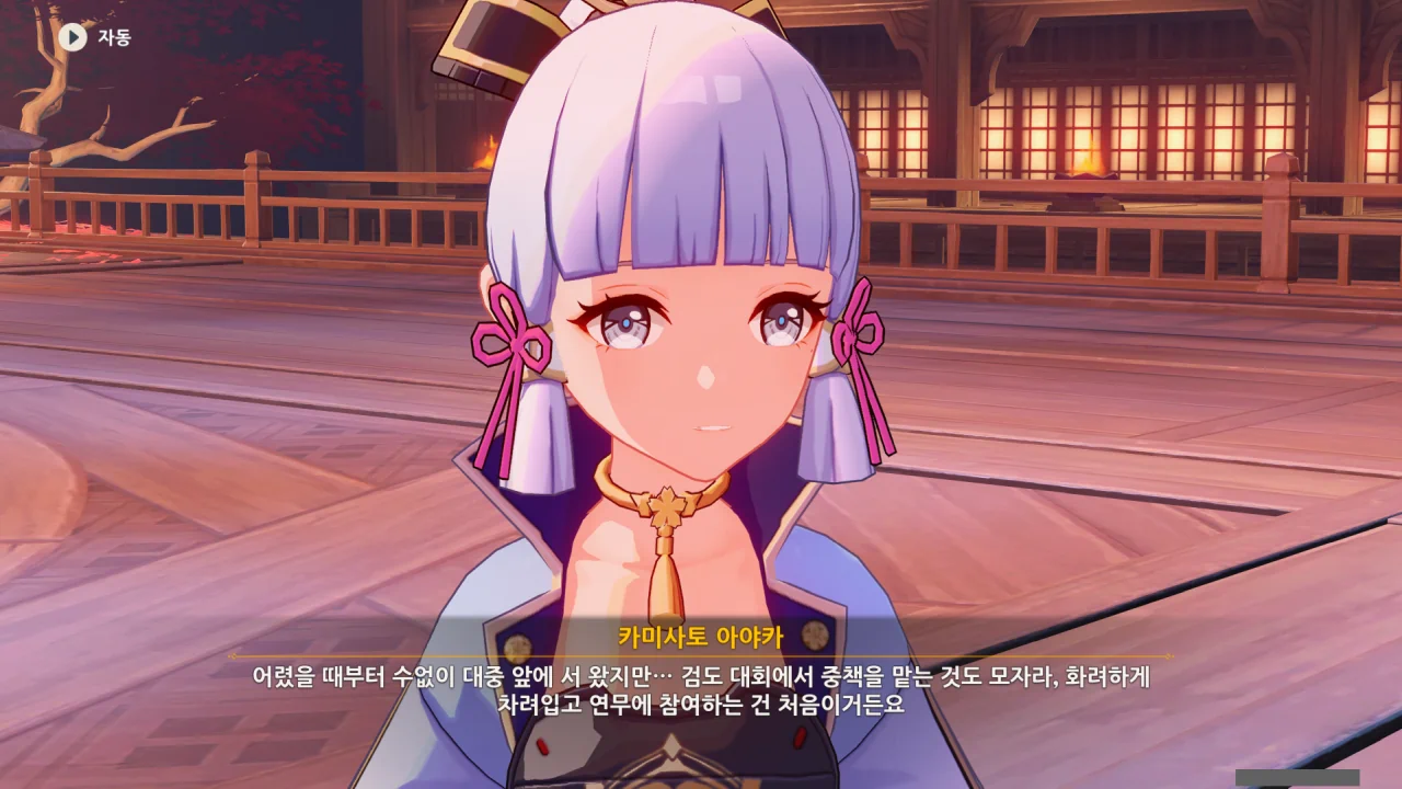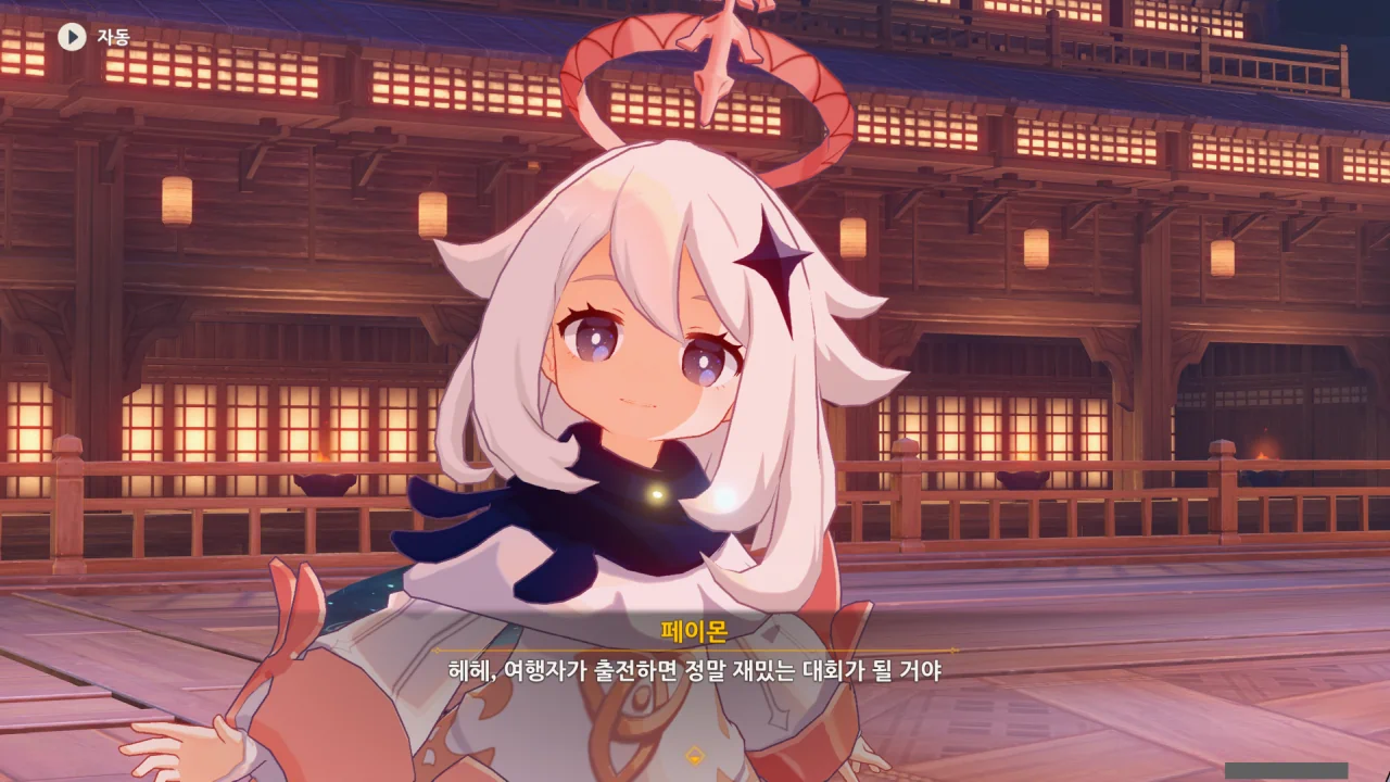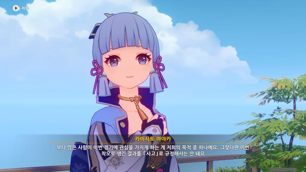 어느새 돌아온 페이몬이 무슨 이야기를 하고 있었느냐 물어보자, 아야카가 아까처럼 대충 얼버무린다.