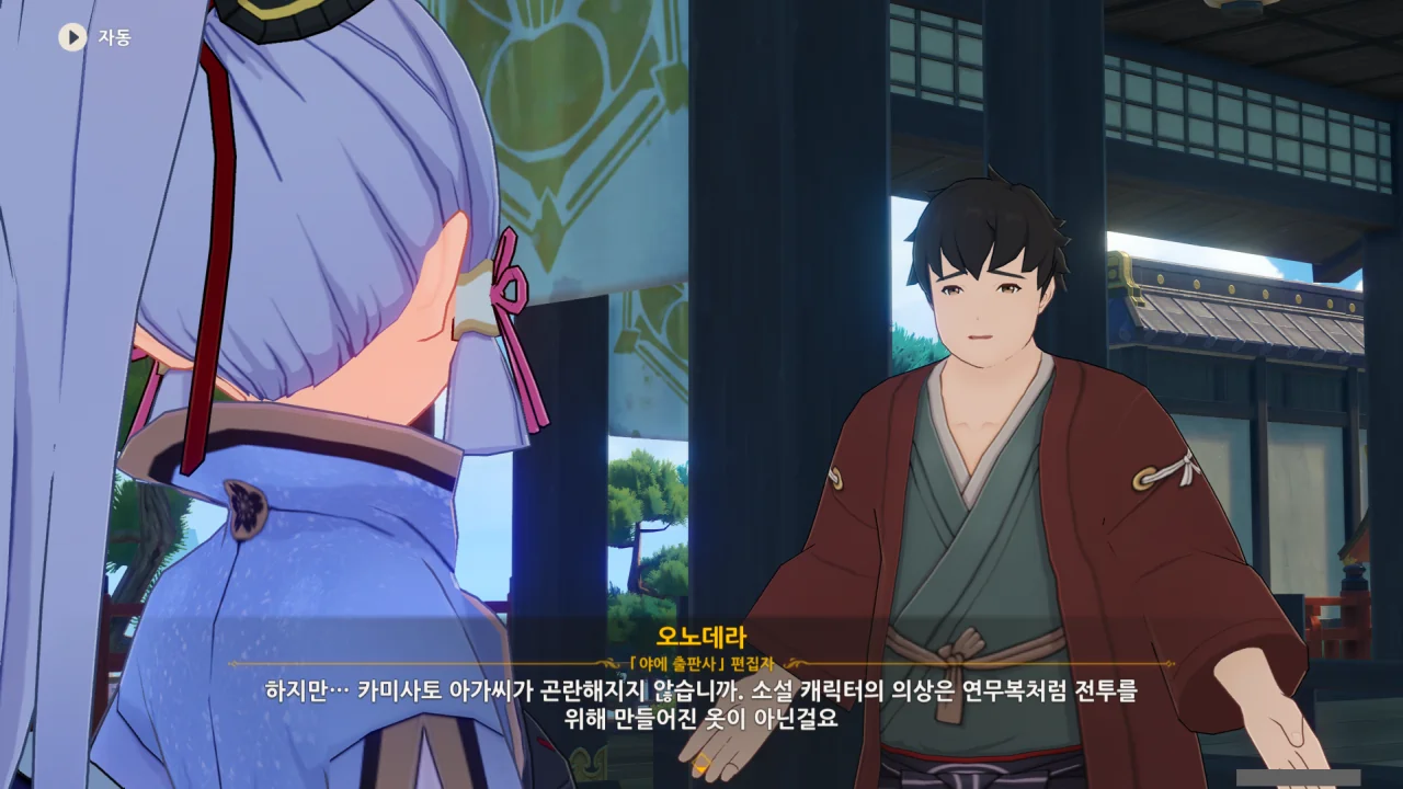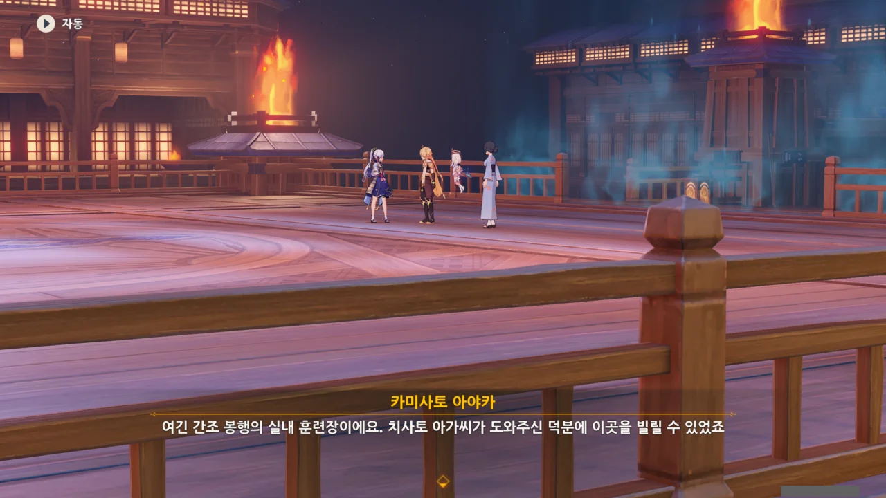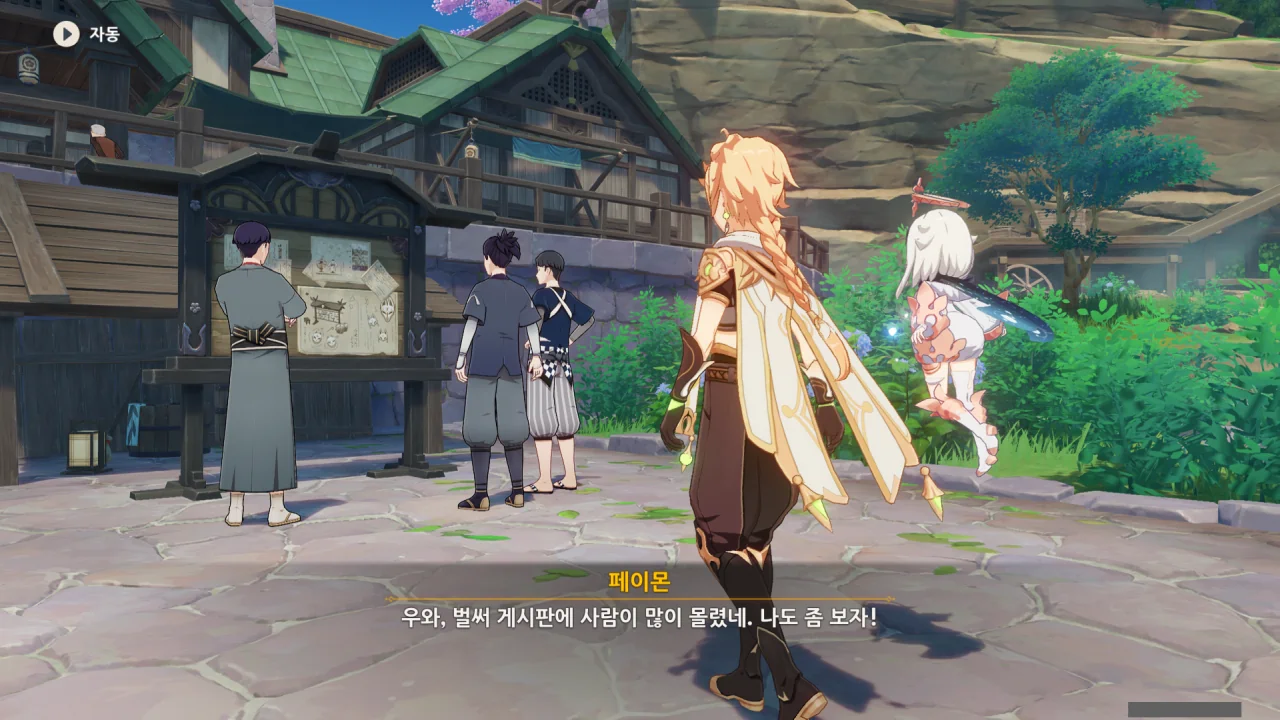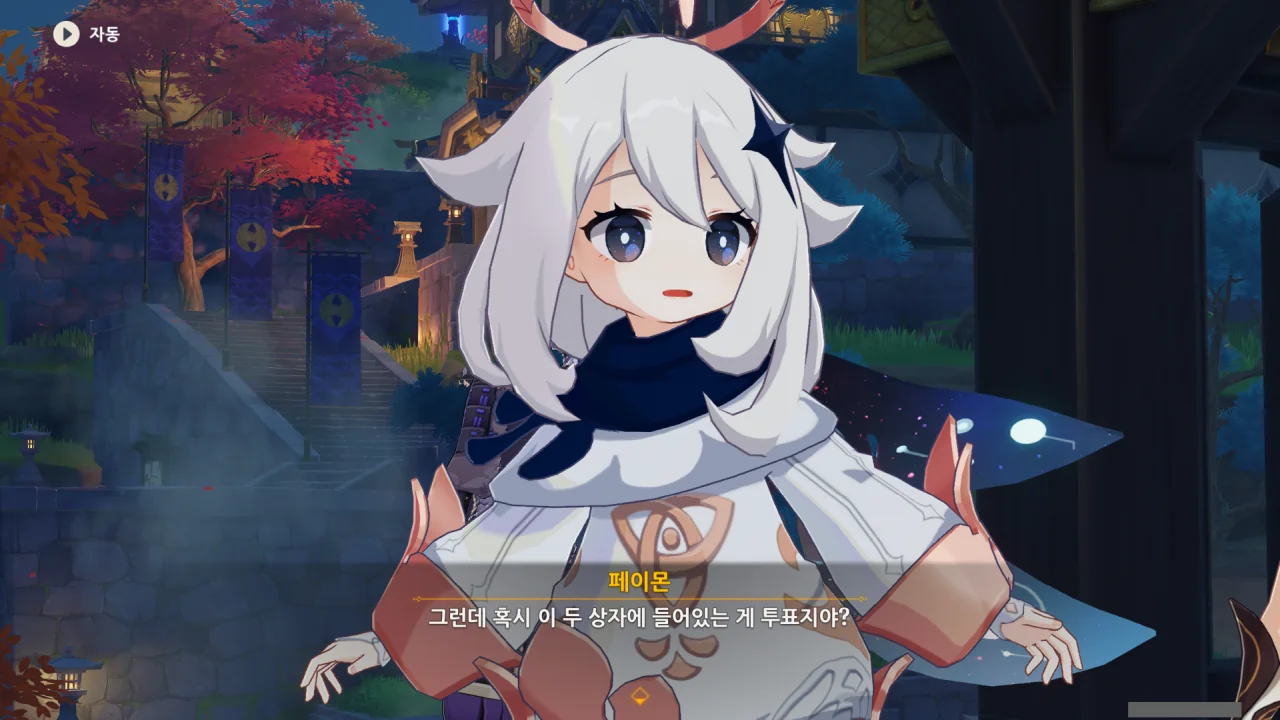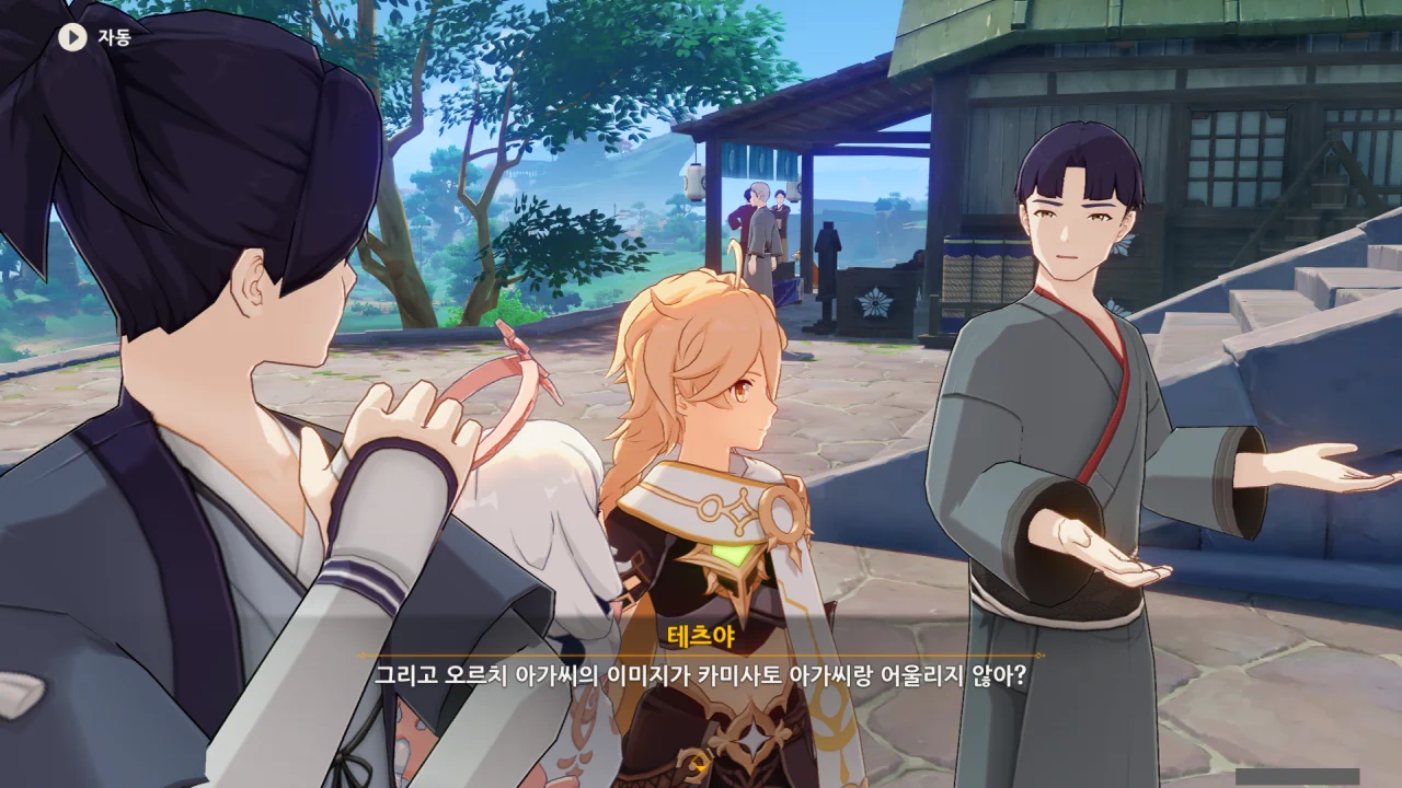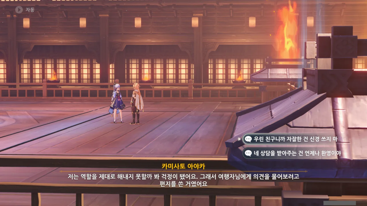어느새 돌아온 페이몬이 무슨 이야기를 하고 있었느냐 물어보자, 아야카가 아까처럼 대충 얼버무린다.