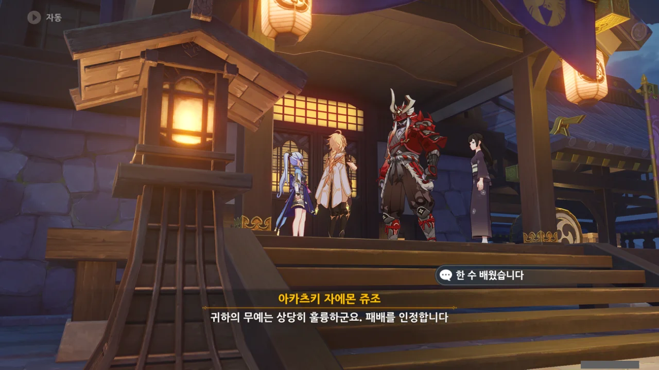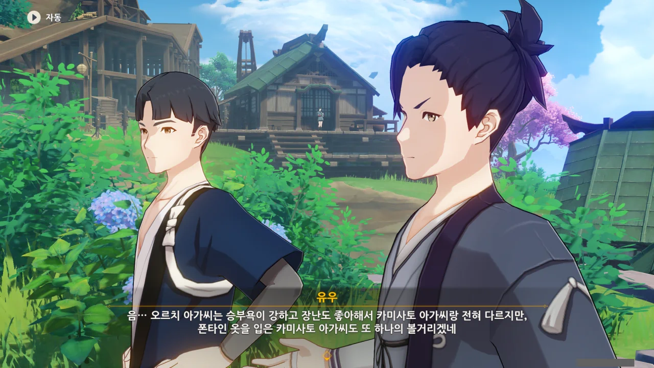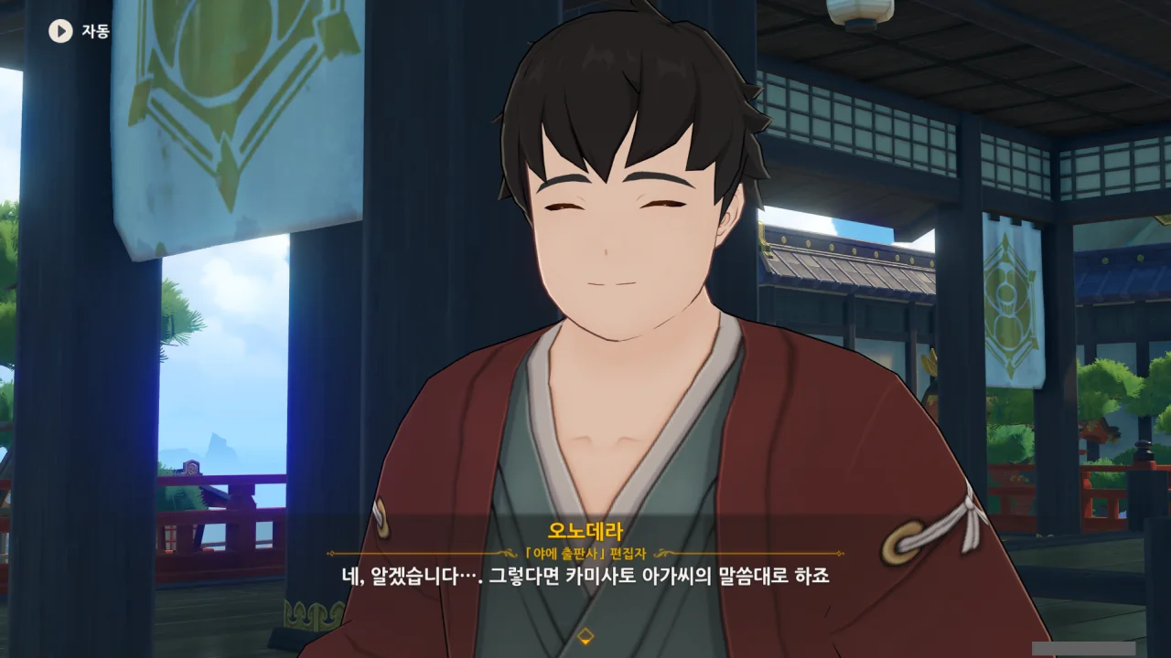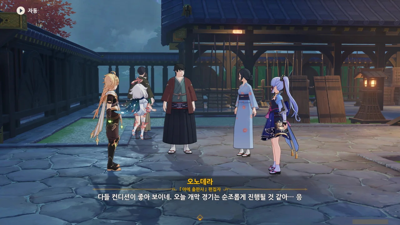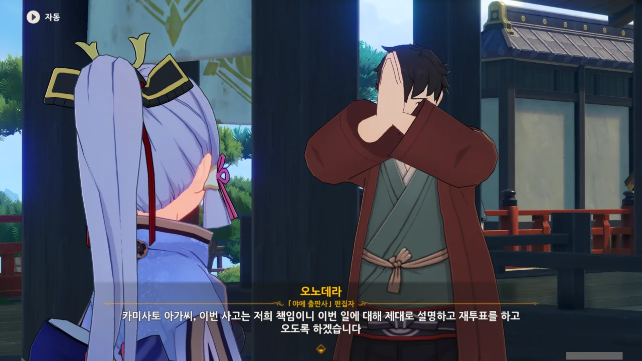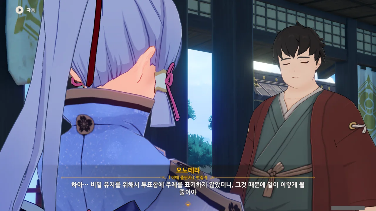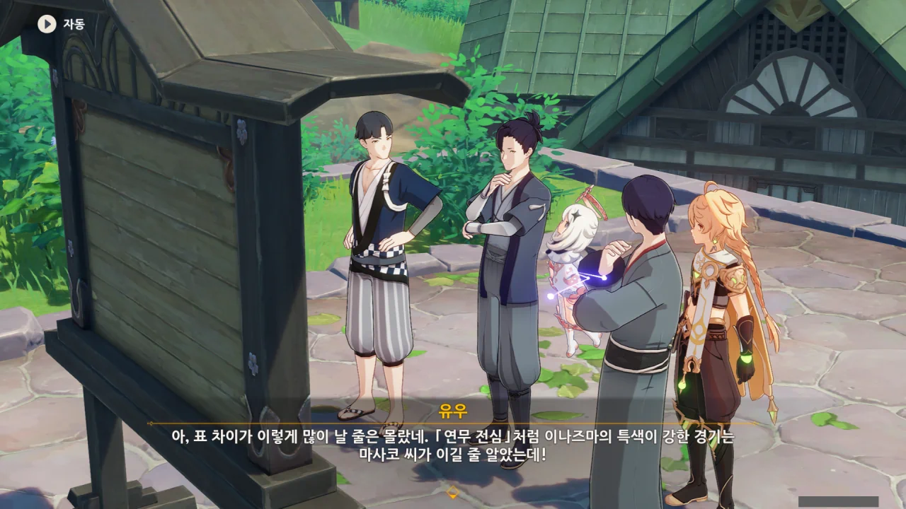 어느새 돌아온 페이몬이 무슨 이야기를 하고 있었느냐 물어보자, 아야카가 아까처럼 대충 얼버무린다.