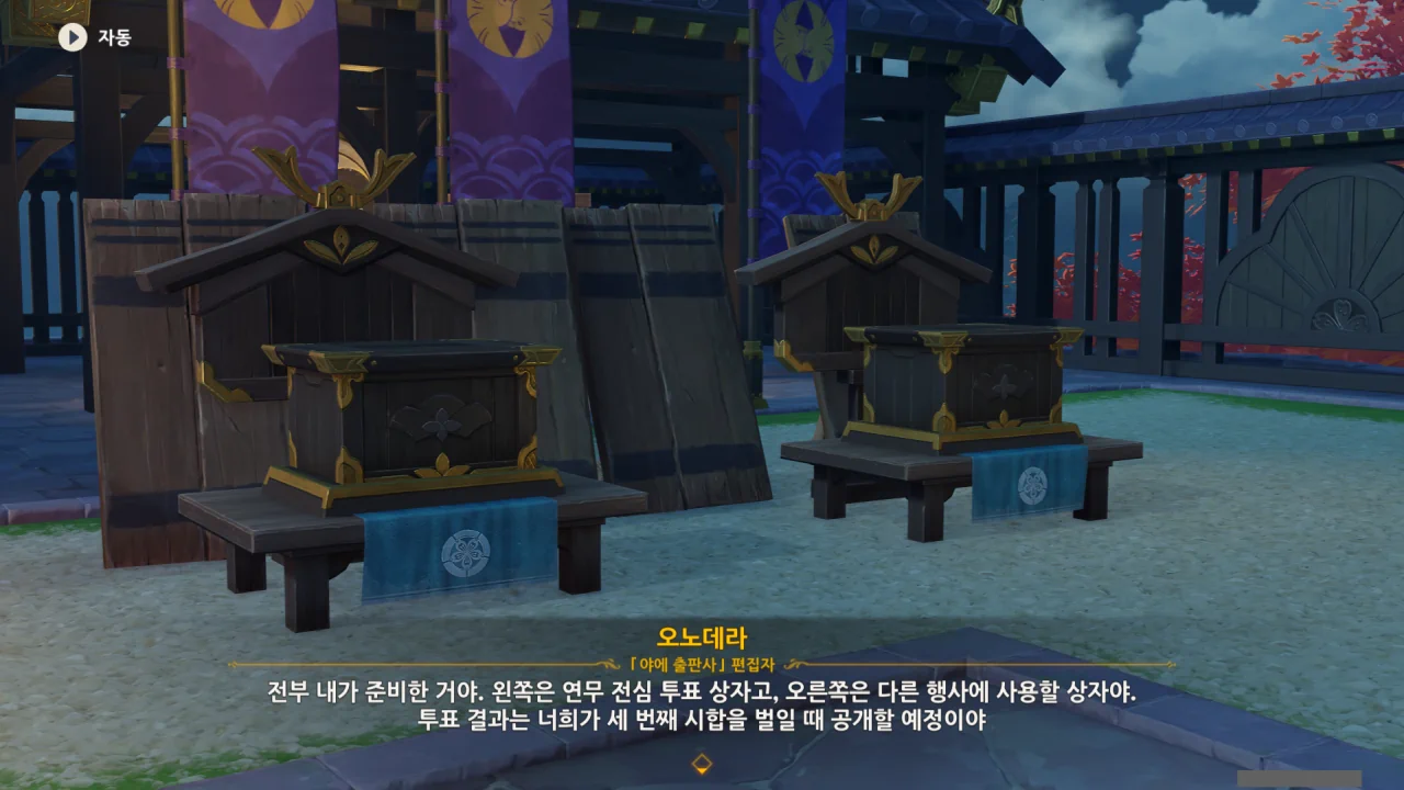 왼쪽은 연무 전심 투표 상자, 오른쪽은 다른 행사에 쓸 상자라고 한다. 오른쪽 상자의 투표 결과는 세 번째 시합 때 공개된다고 한다.