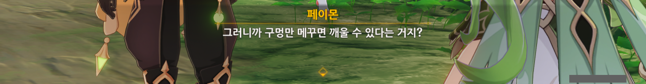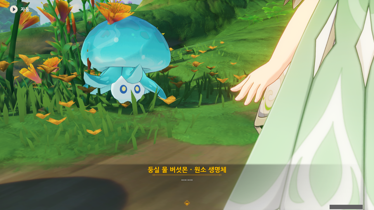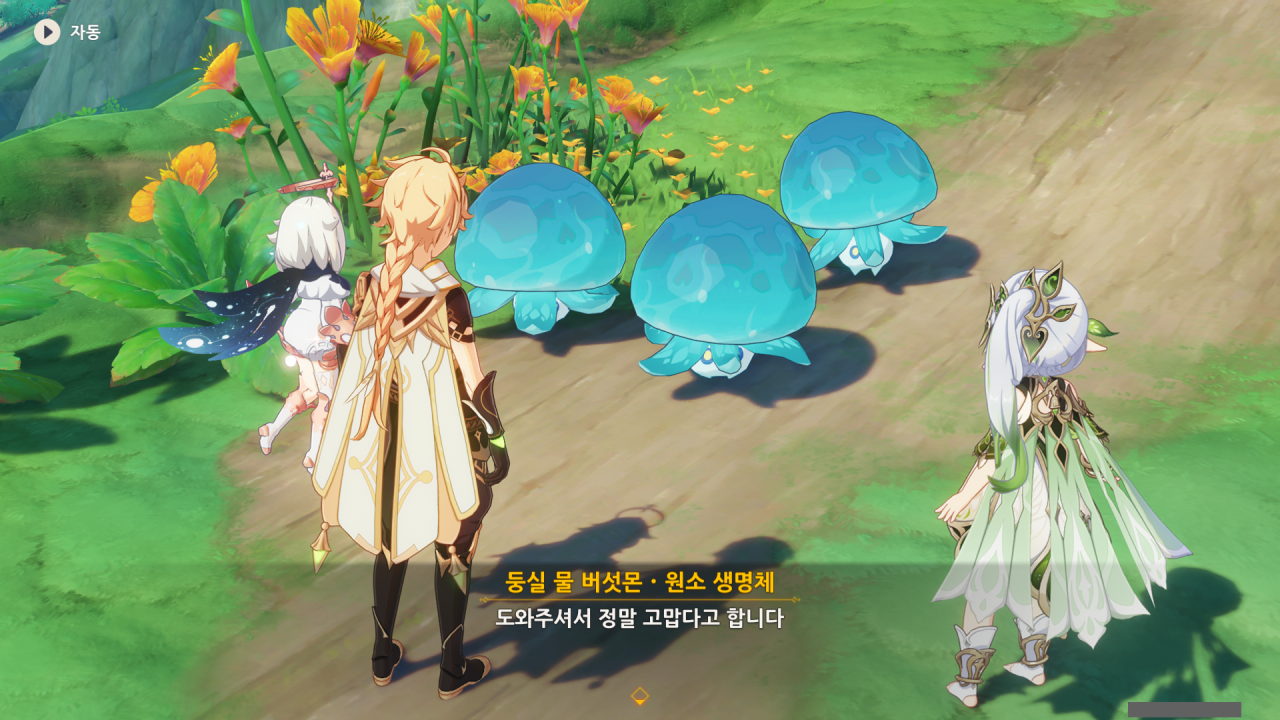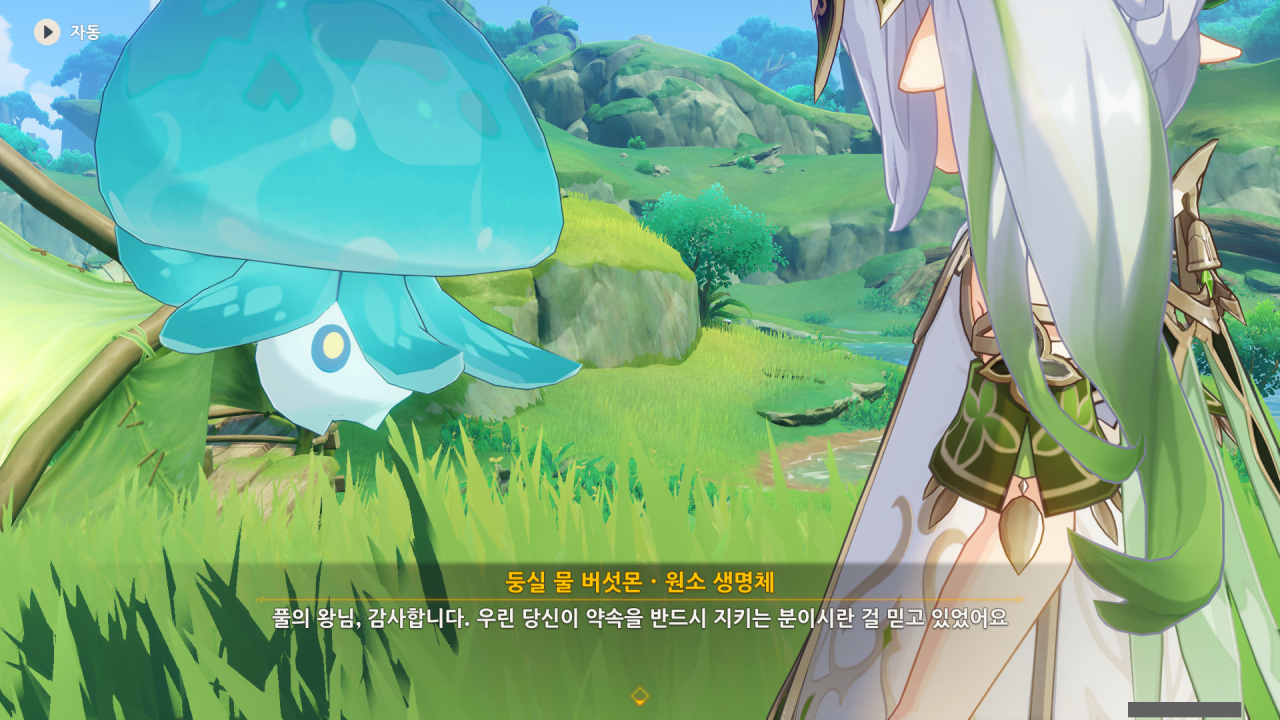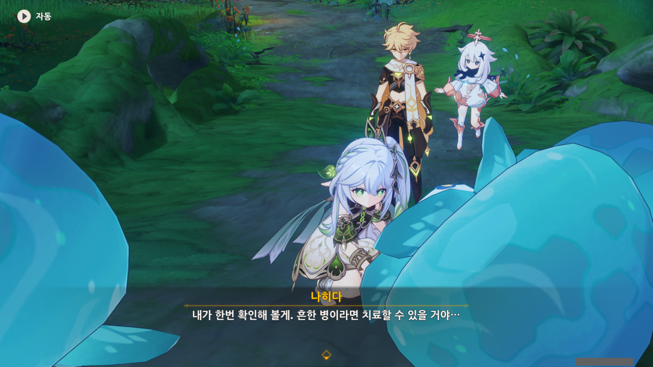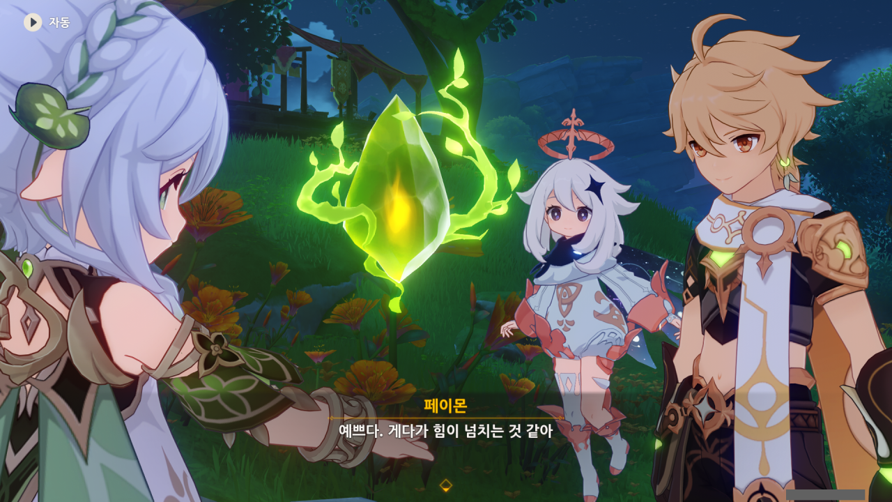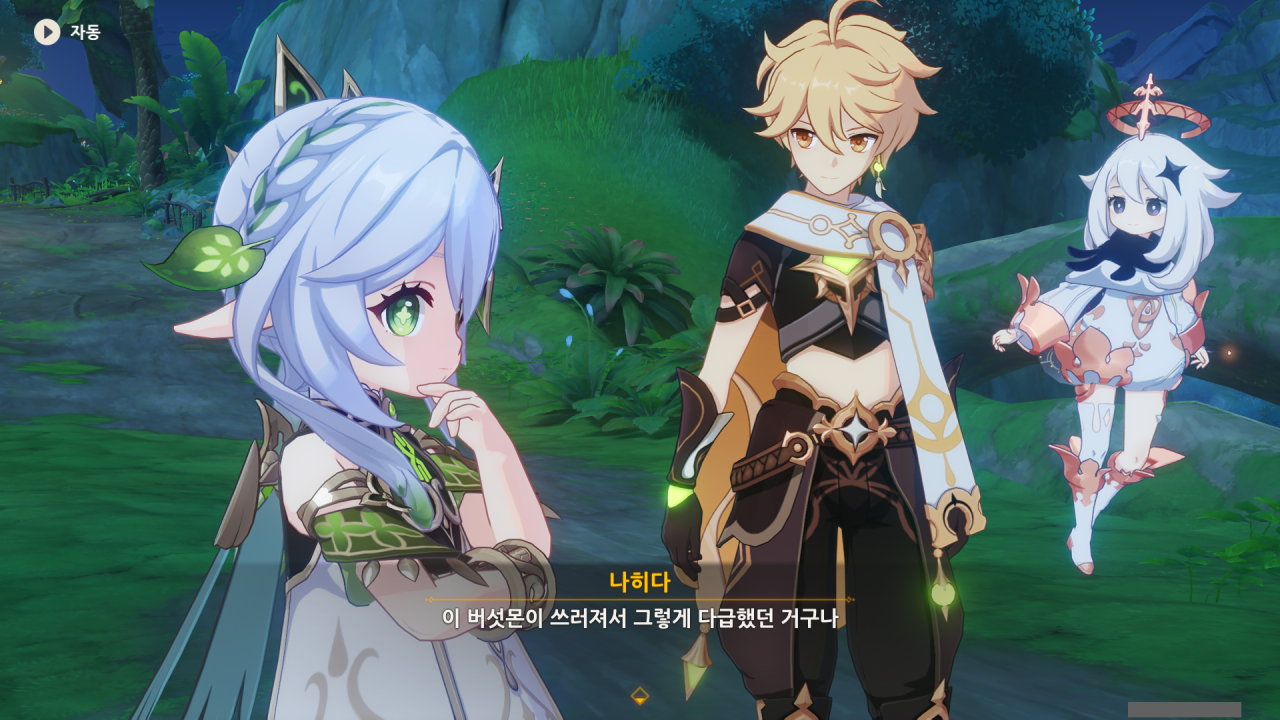 나히다가 힘을 쓰는 걸 아까와는 다른 형태로 보여줄 줄 알았는데, 버섯몬을 치유할 때와 동일하게 손 끝에서 초록색 무언가가 사르륵 나오고 끝났다.