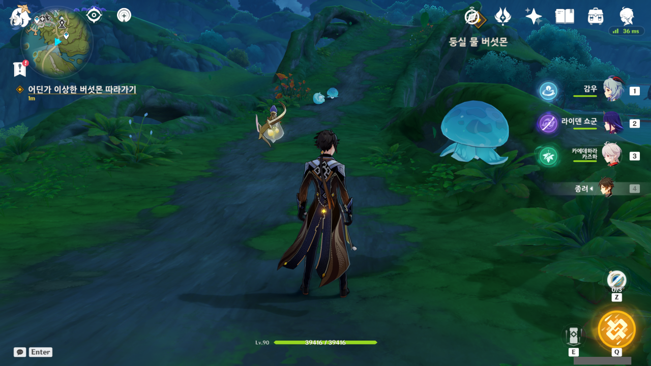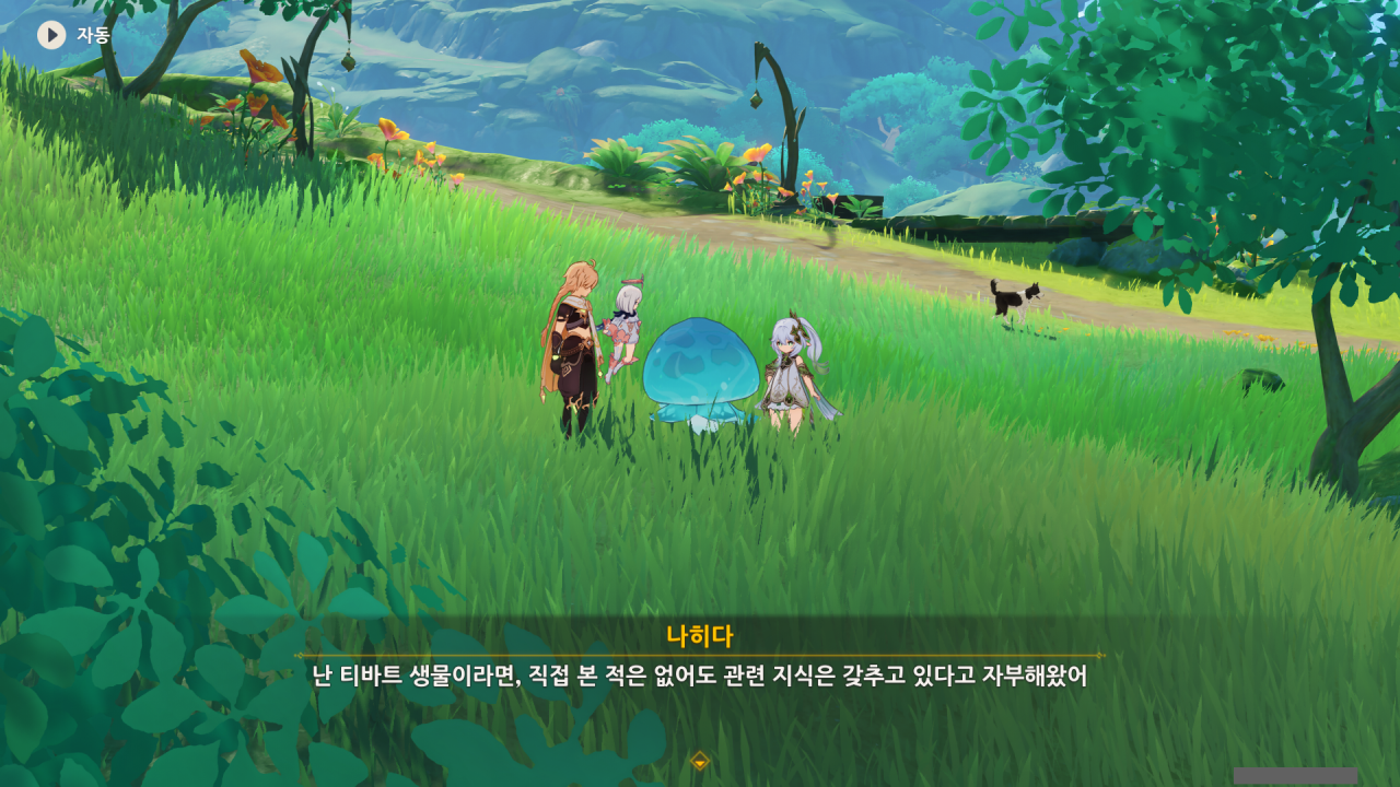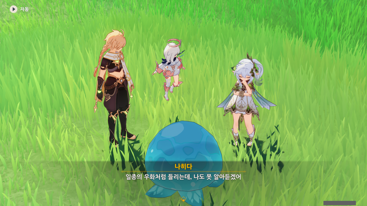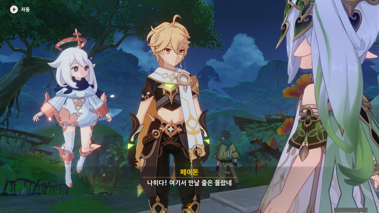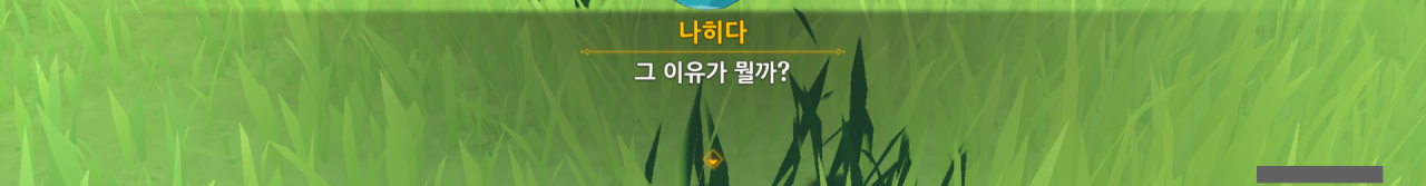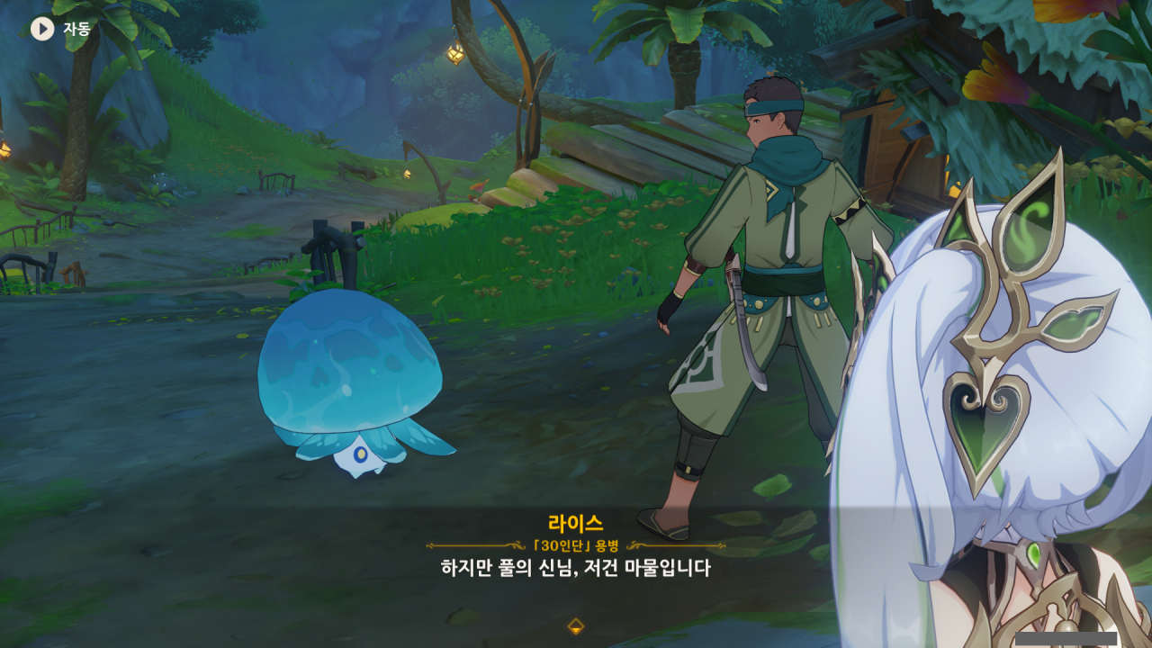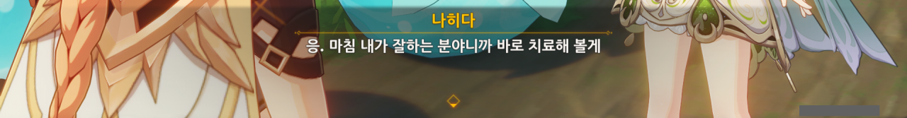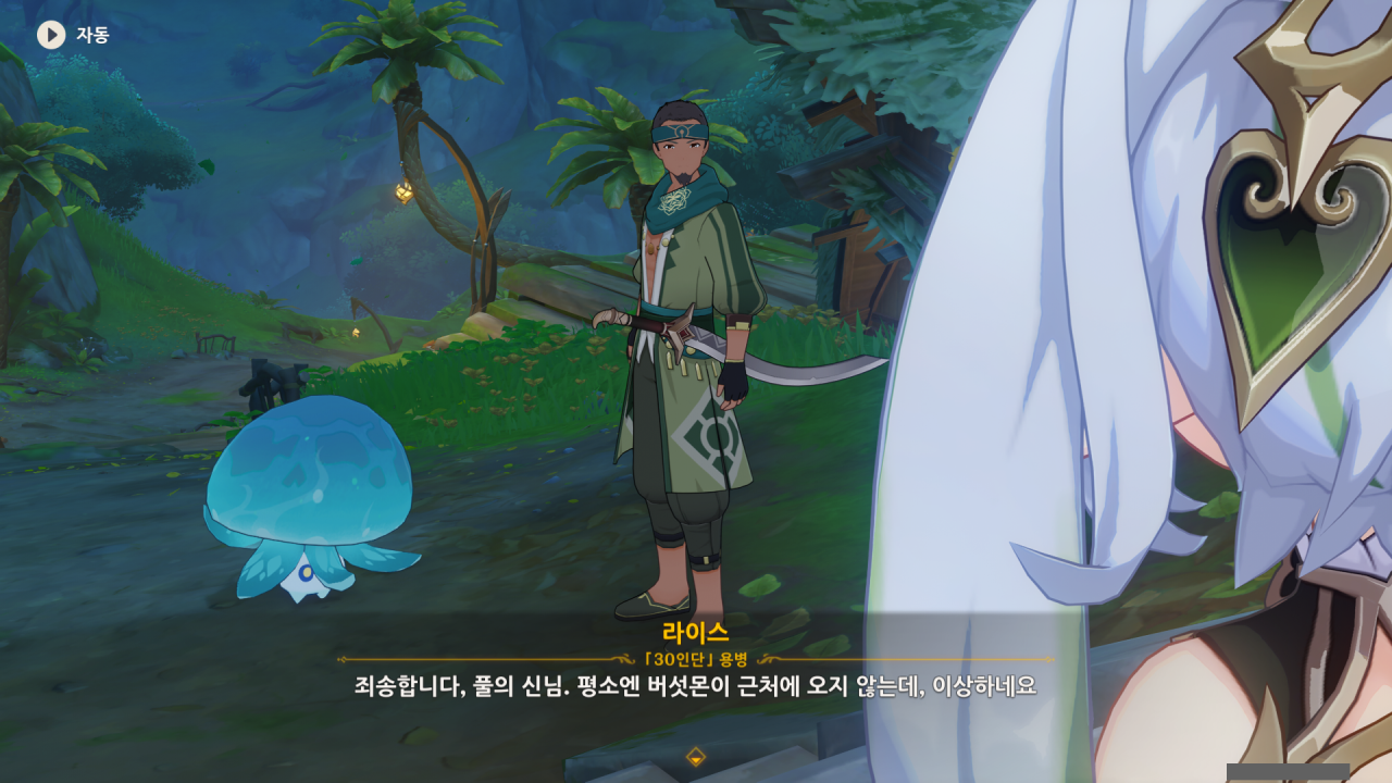 나히다가 힘을 쓰는 걸 아까와는 다른 형태로 보여줄 줄 알았는데, 버섯몬을 치유할 때와 동일하게 손 끝에서 초록색 무언가가 사르륵 나오고 끝났다.