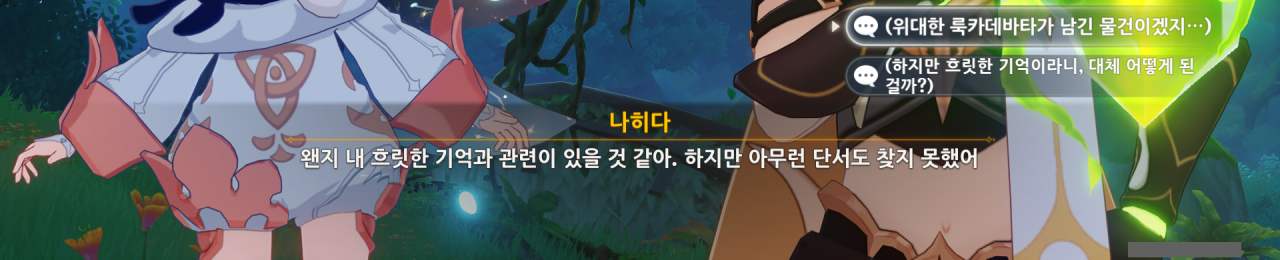 나히다의 기억이 룩카데바타의 것을 포함해 온전했더라면 그게 정말 약속이었는지 단순한 예언일 뿐이었는지 알 수 있겠지만, 룩카데바타에 대한 기억은 세계수를 정화하며 날아가 버렸으니, 지금은 그냥 그런가 보다 하며 넘길 수밖에 없다.