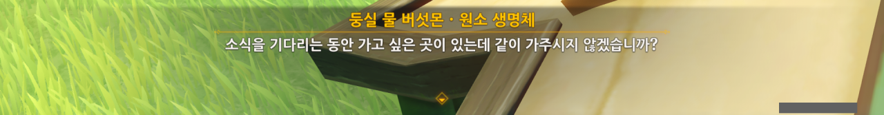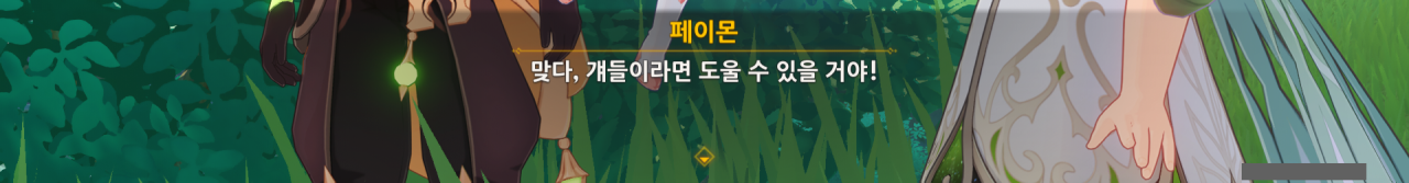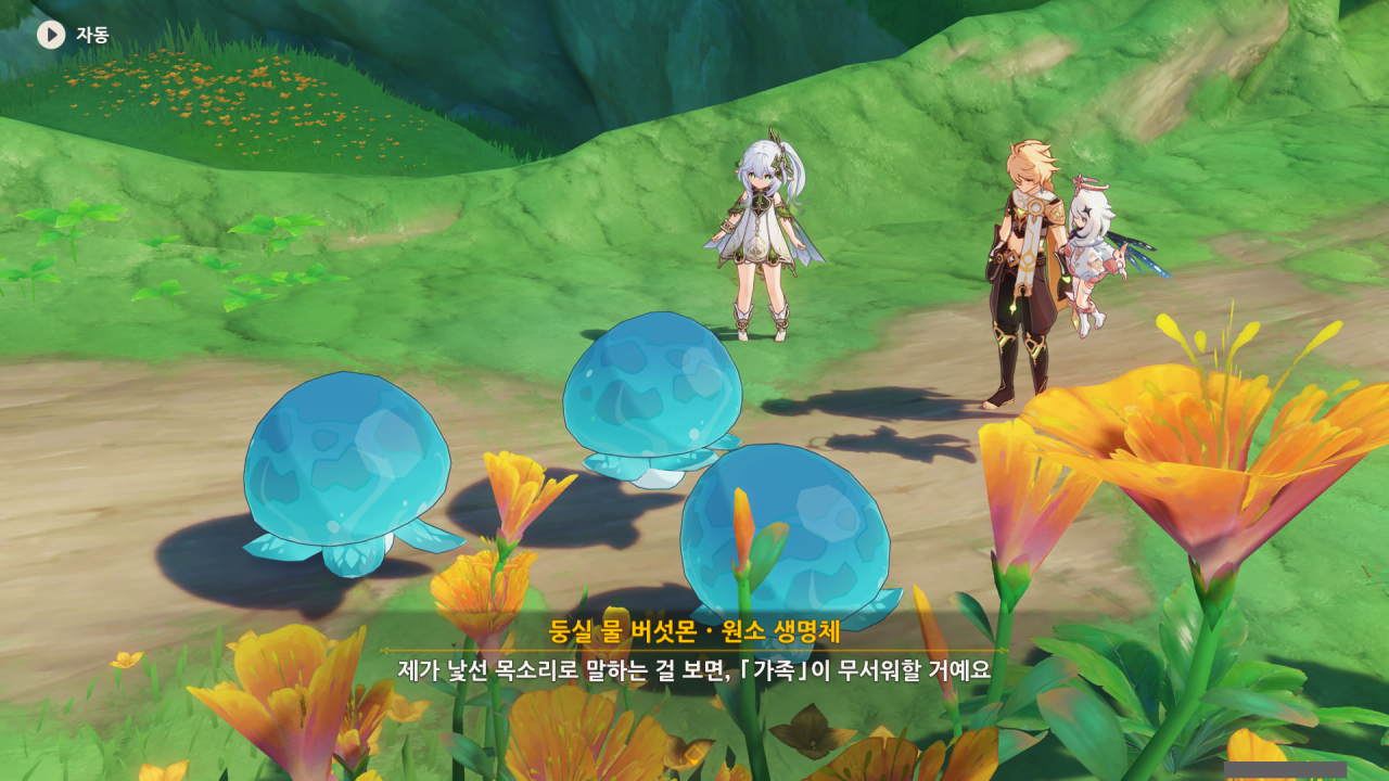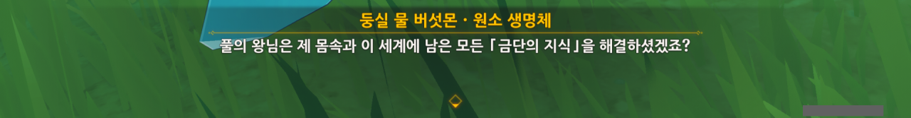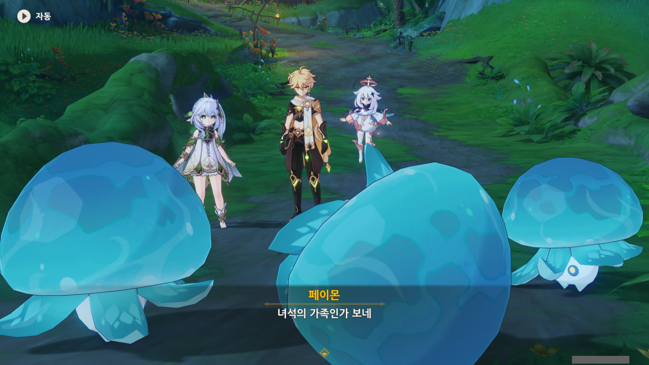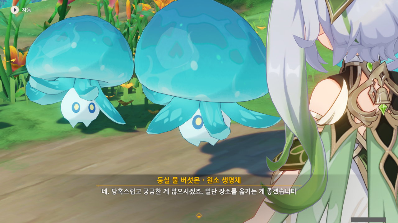 버섯몬의 시선이 여행자와 나히다에게 향한 것으로 보아, 버섯몬은 여행자 혹은 나히다에게 뭔가 할 말이 있는 것 같다.