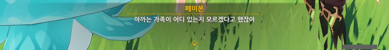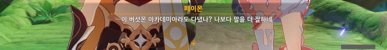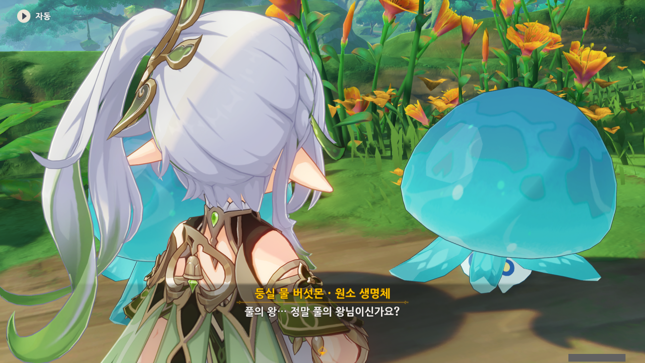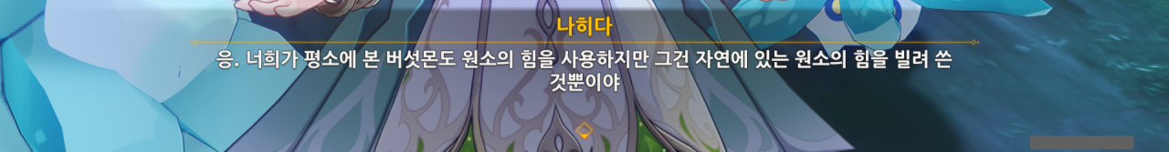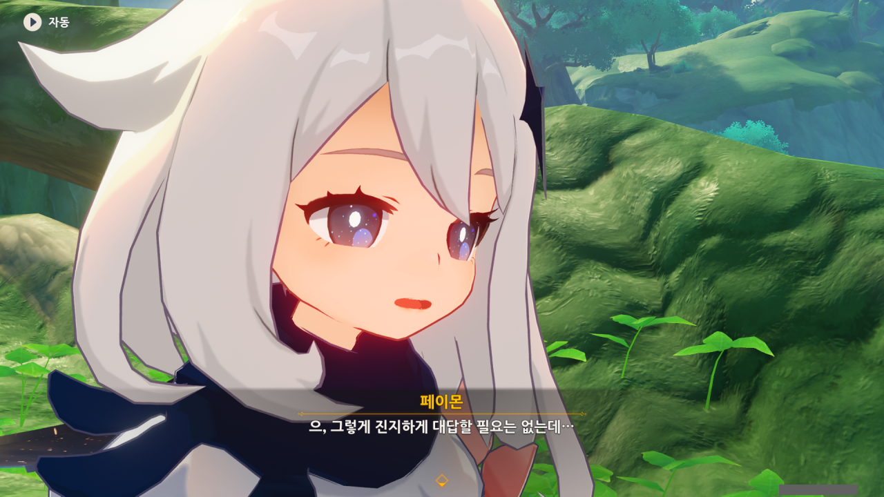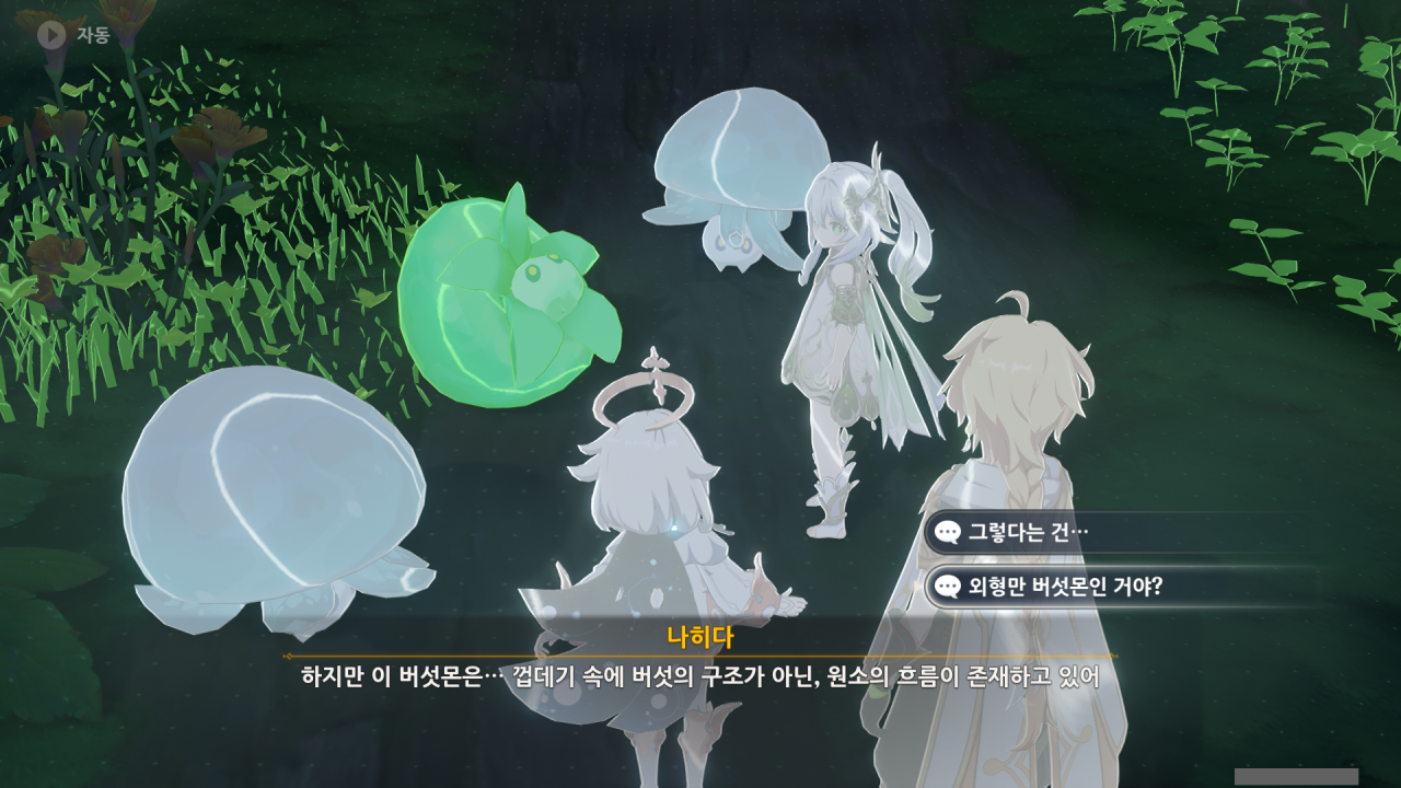 원소 생명체 버섯몬의 정체를 묻는 나히다. 아까 나히다가 "역시 넌 버섯몬이 아니구나?"라고 말한 것의 연장일 것이다.