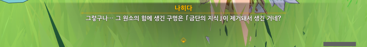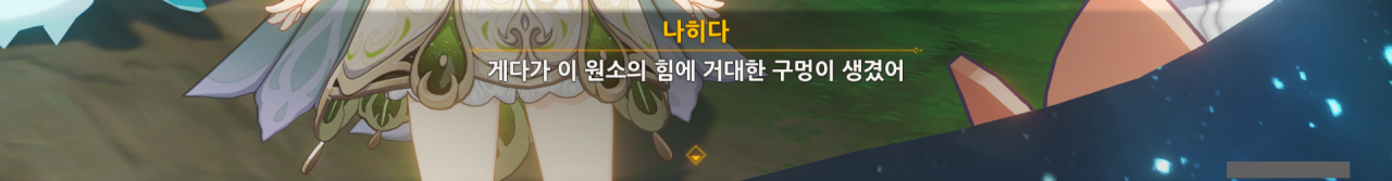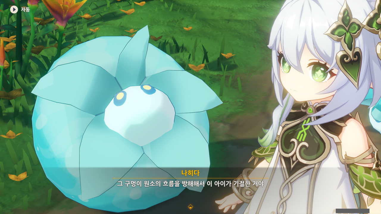 원소의 힘에 거대한 구멍이 생겨 원소의 흐름을 방해했기에 이 원소 생명체가 아프게 되었다고 말하는 나히다.