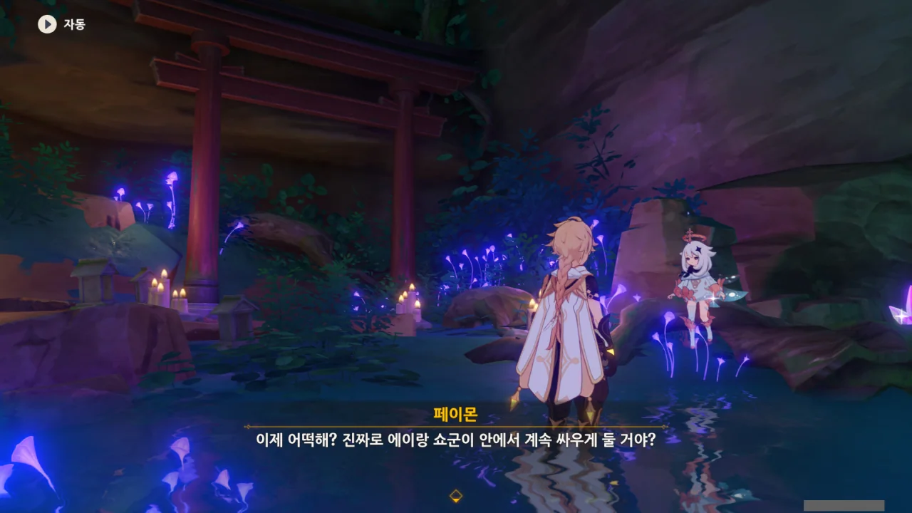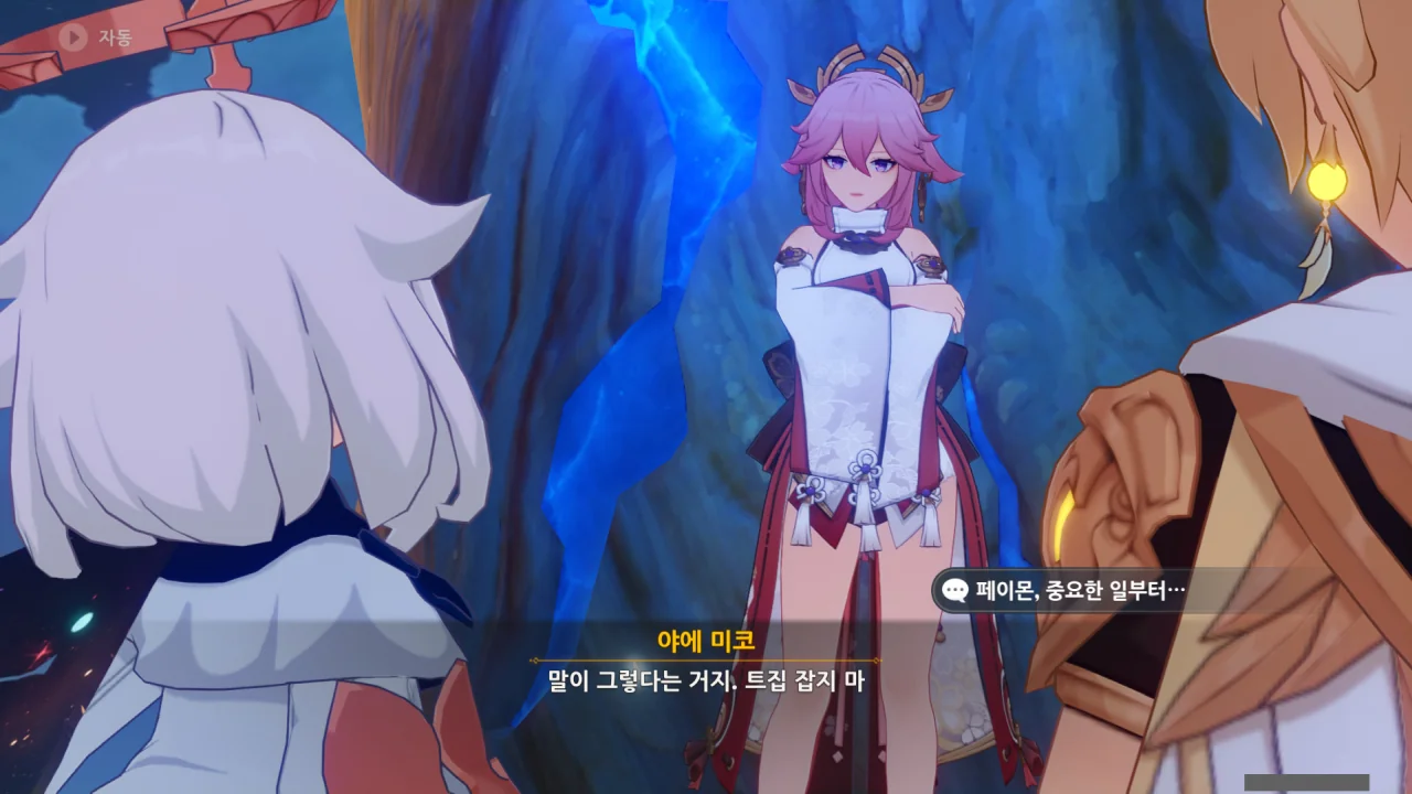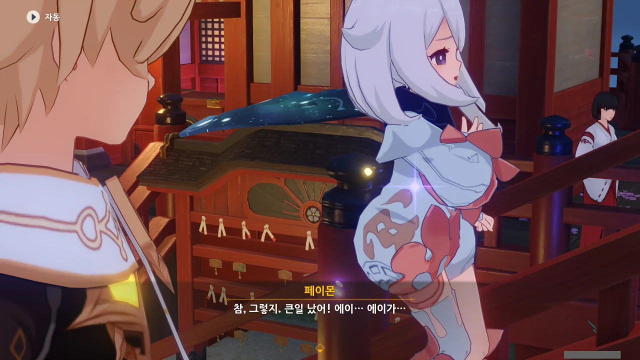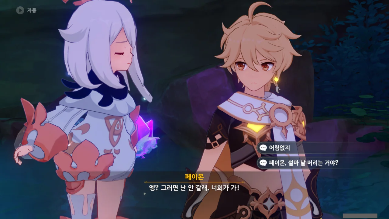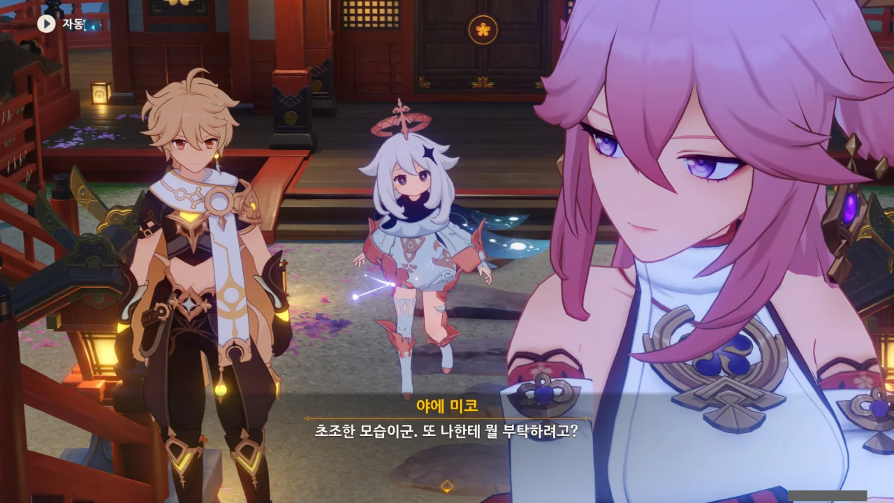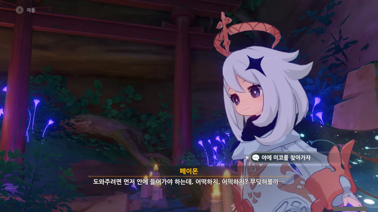 페이몬이 혼자 빼려고 하자, 여행자와 야에 미코가 쌍으로 페이몬에게 '그래서 안 갈 거야?'라고 한다.