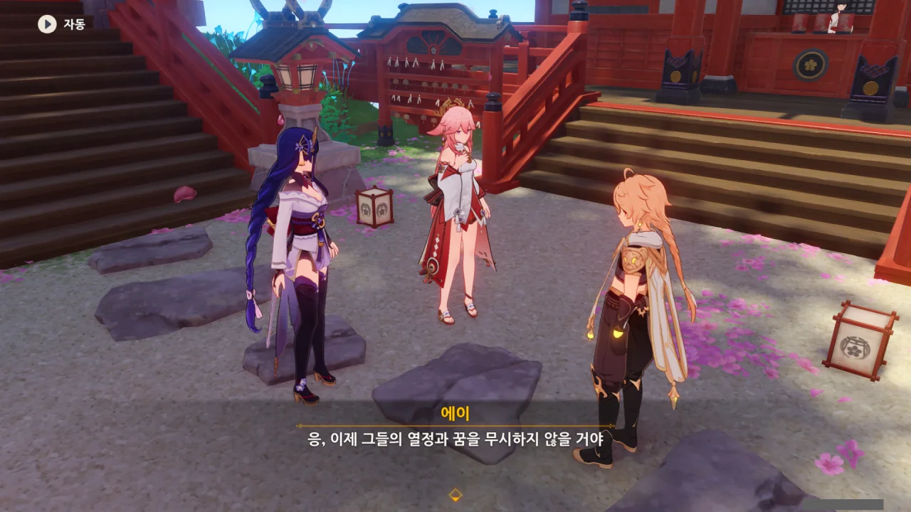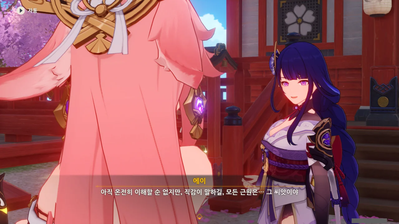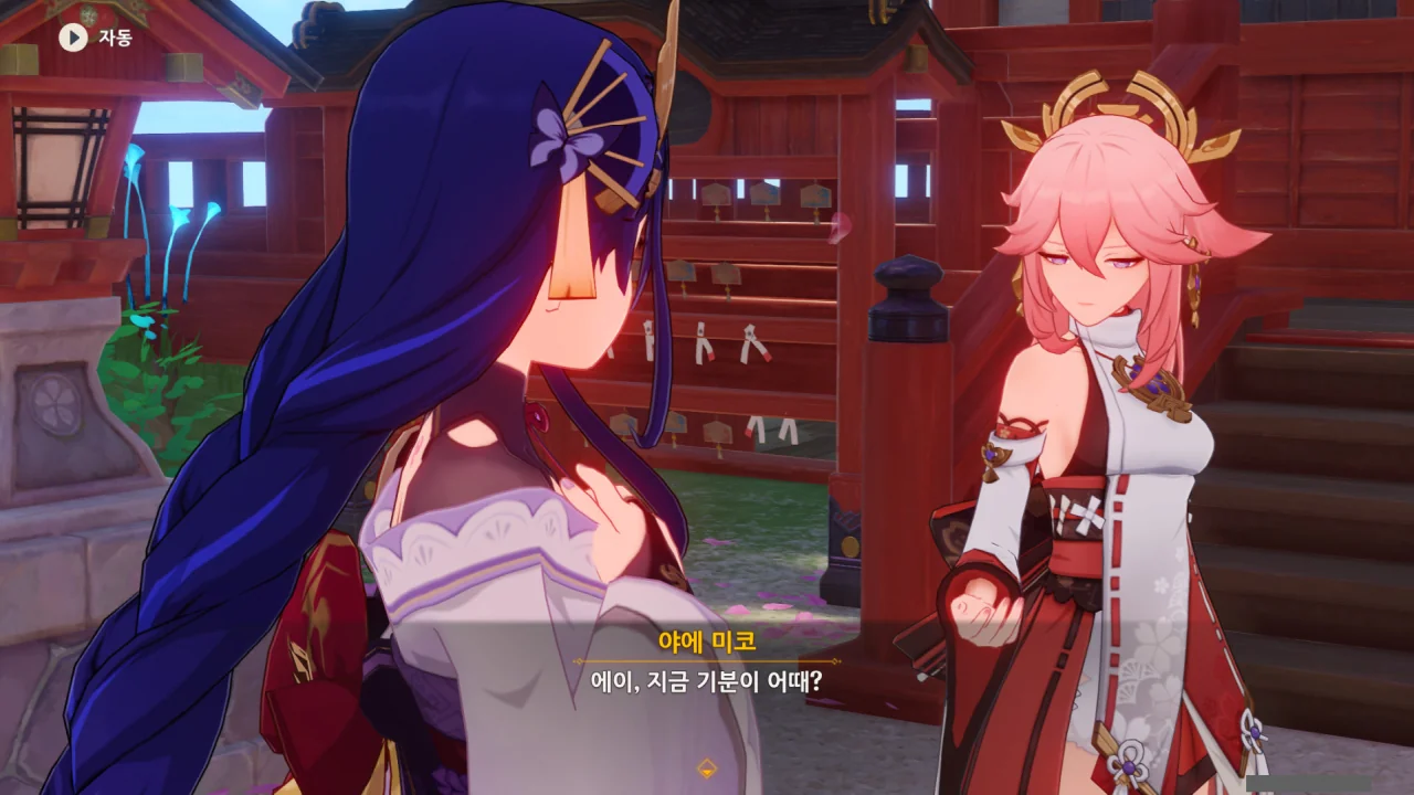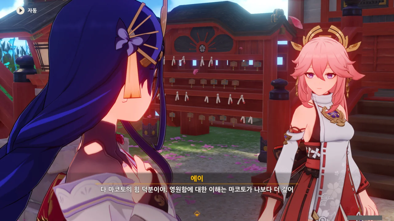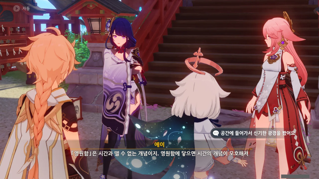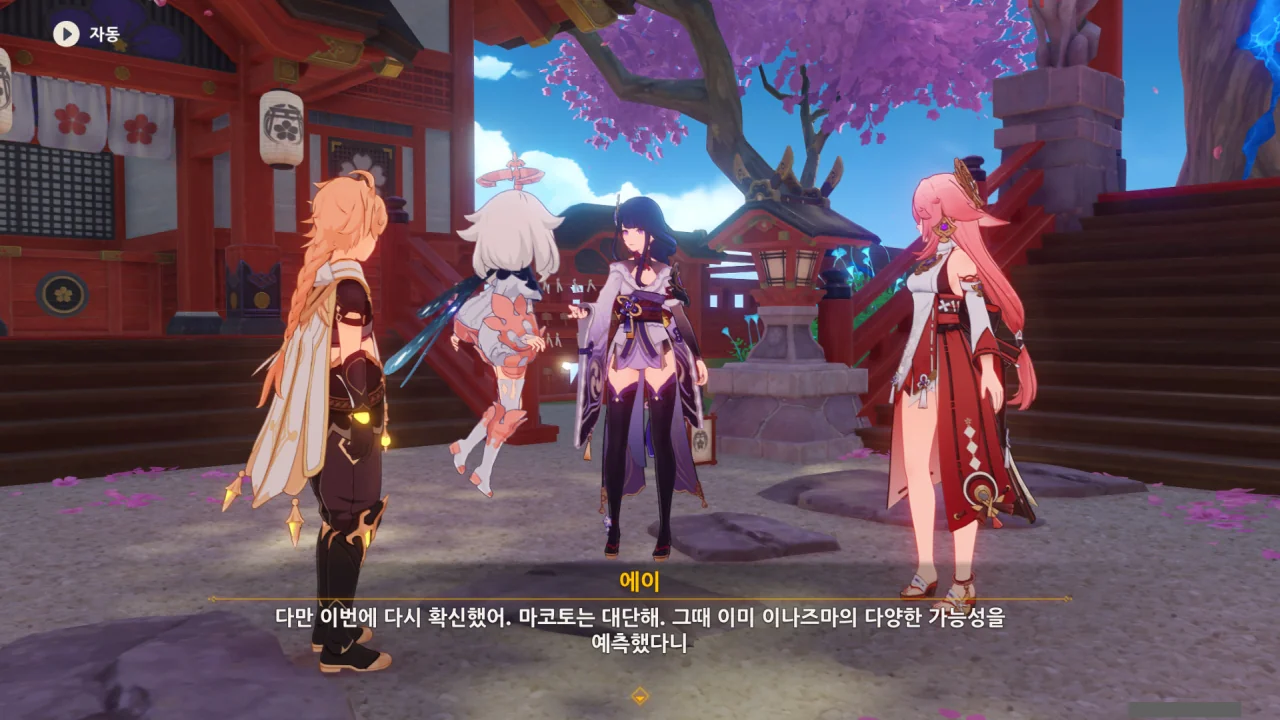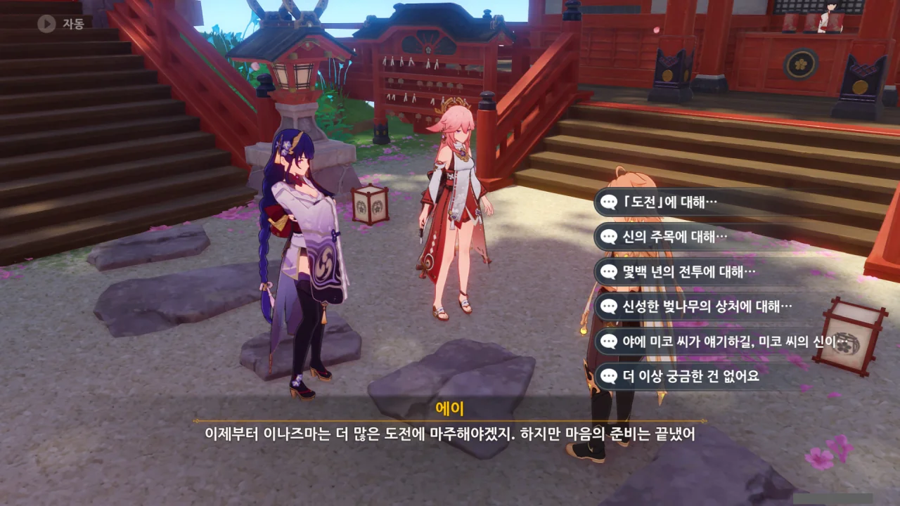 아직 라이덴 에이와 야에 미코가 사라지지 않고 있기에 말을 걸어보니 추가적인 대화 내용이 나타난다.