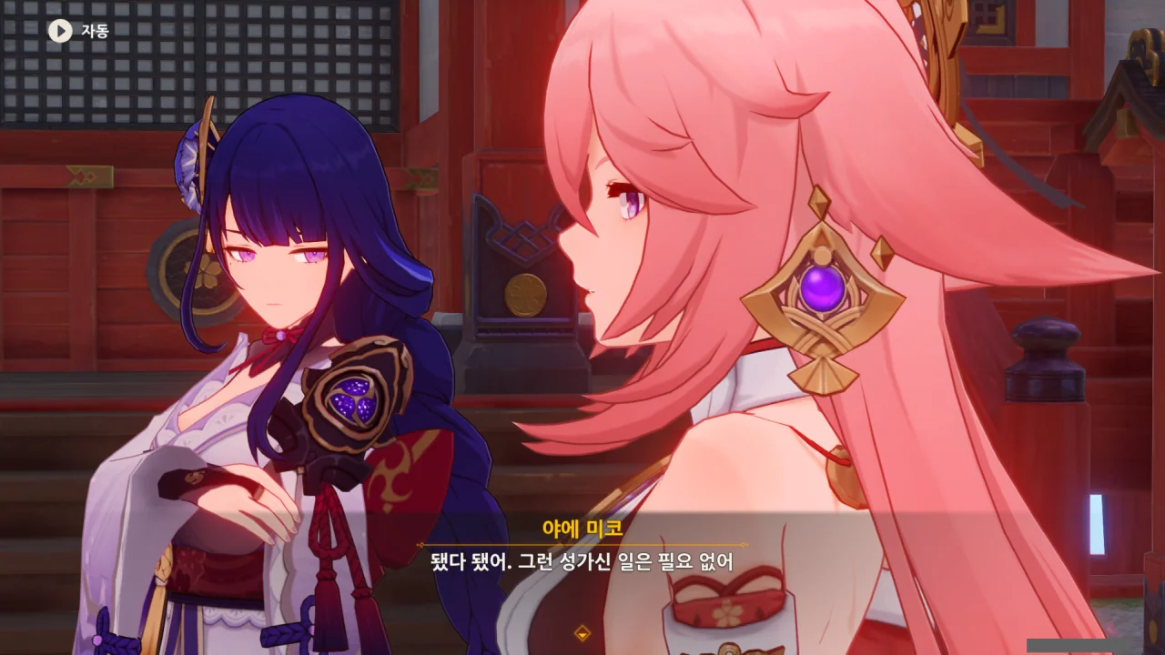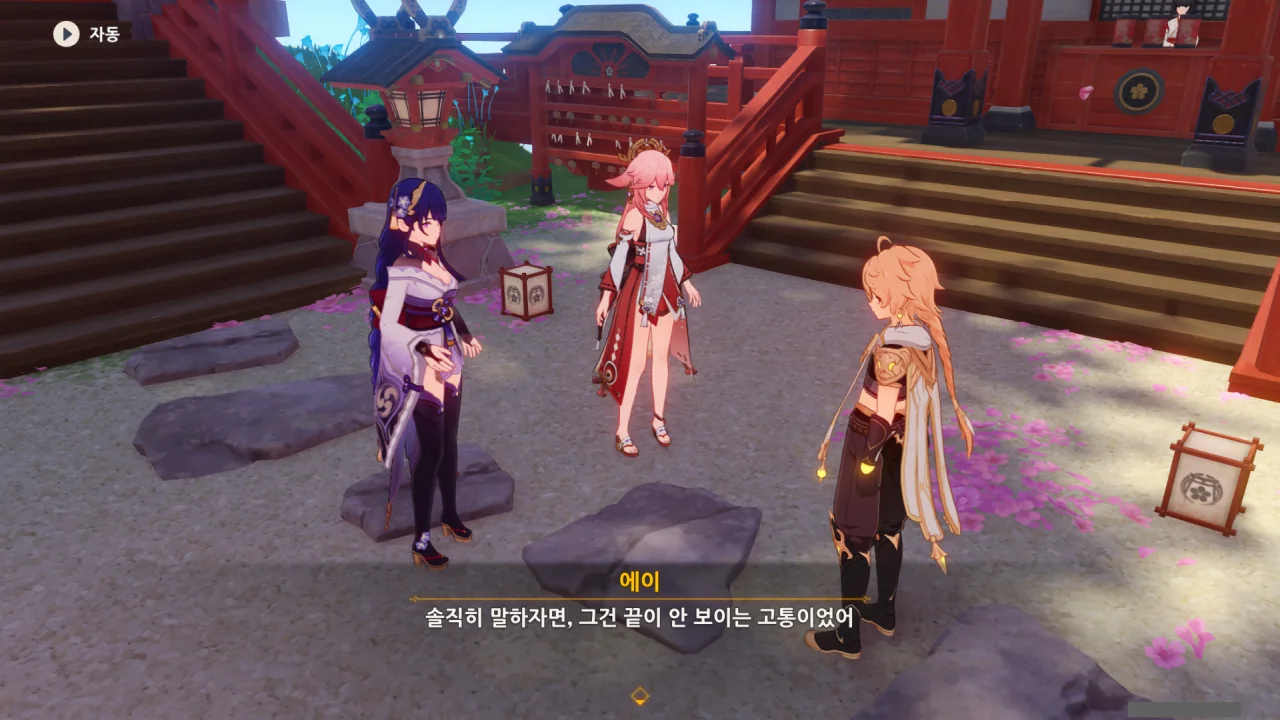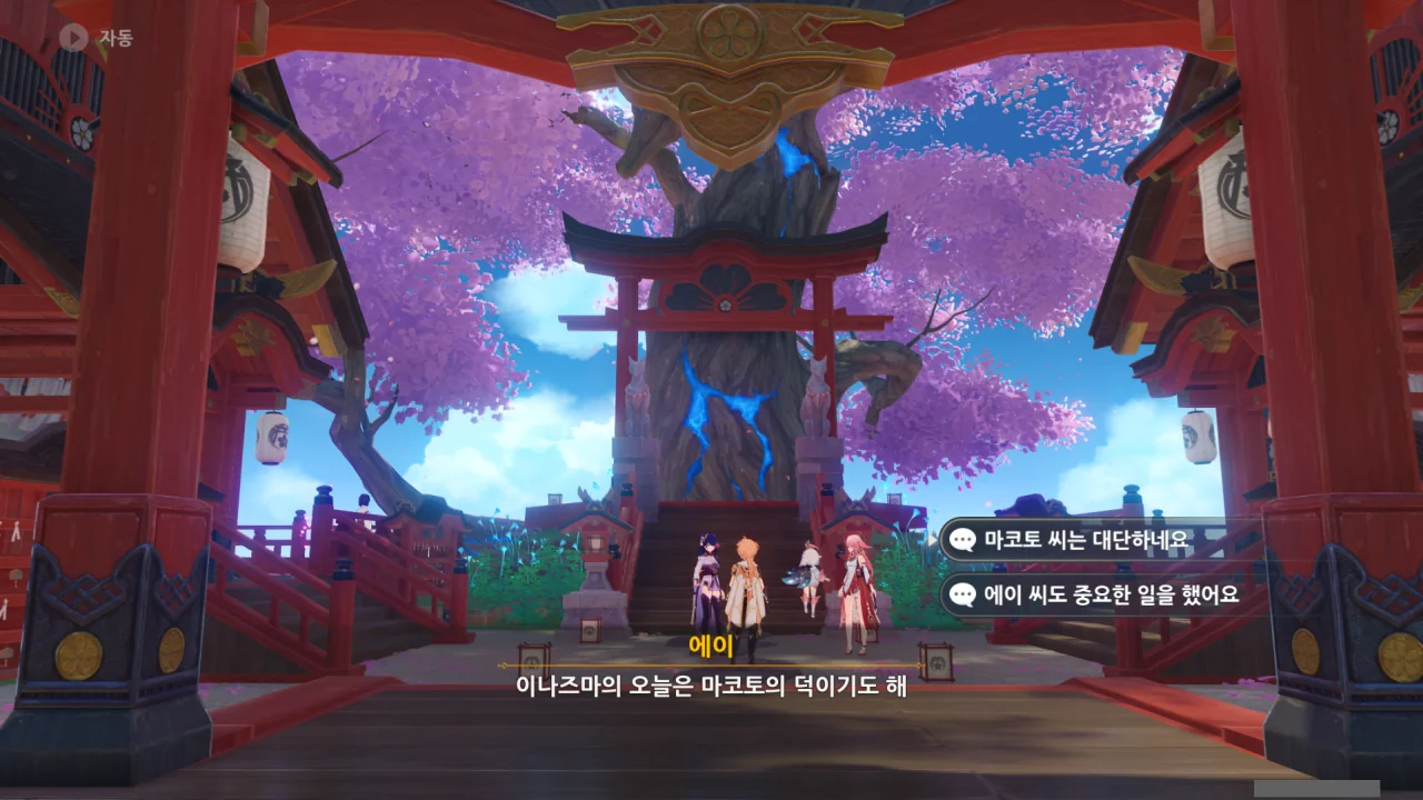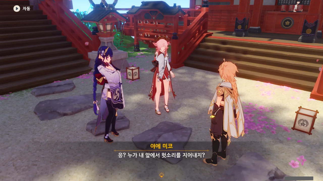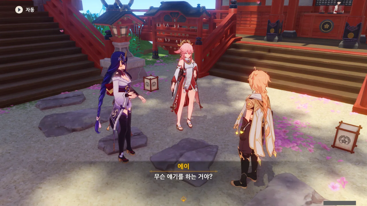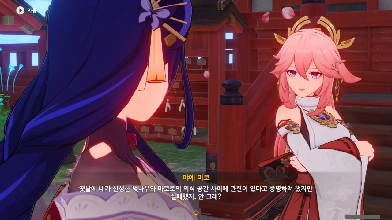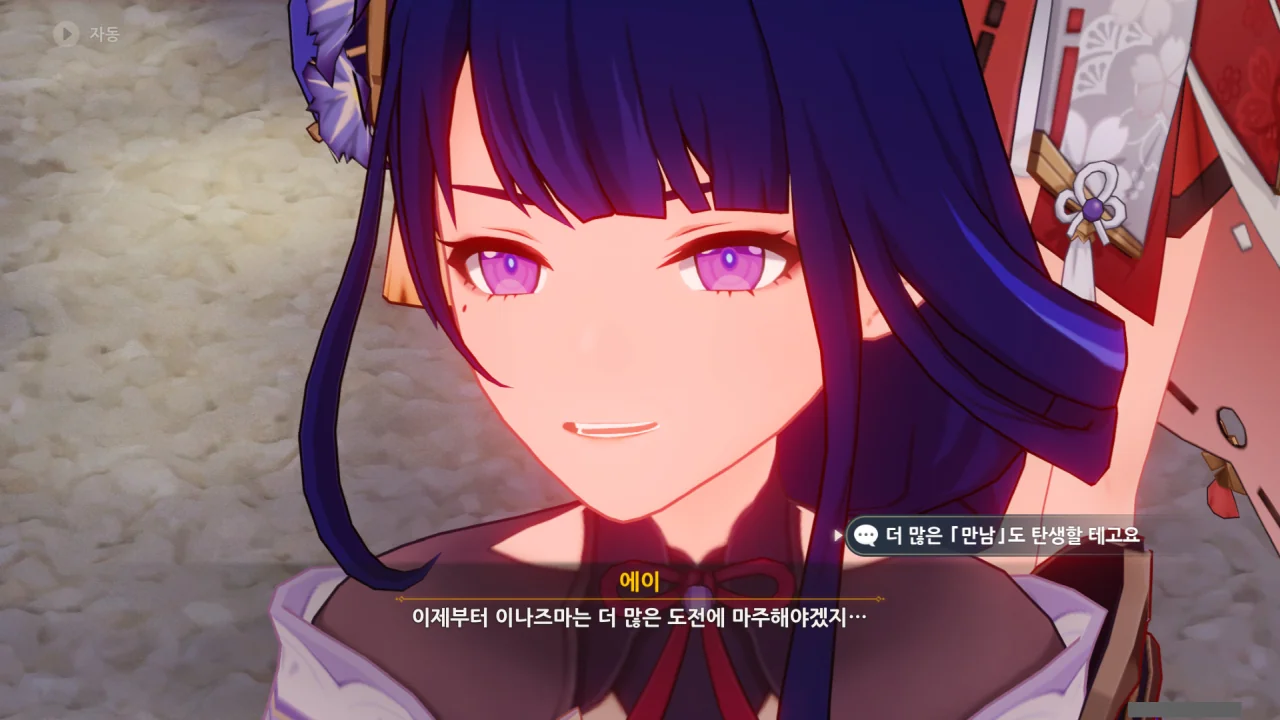 아직 라이덴 에이와 야에 미코가 사라지지 않고 있기에 말을 걸어보니 추가적인 대화 내용이 나타난다.