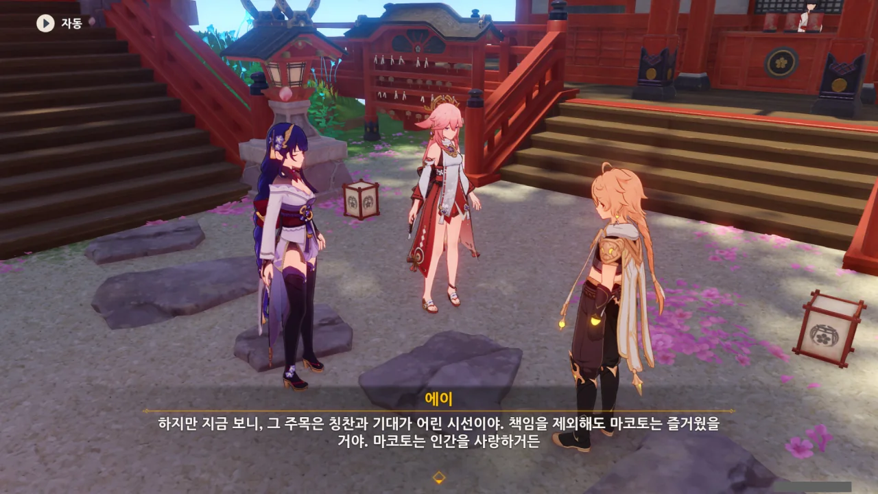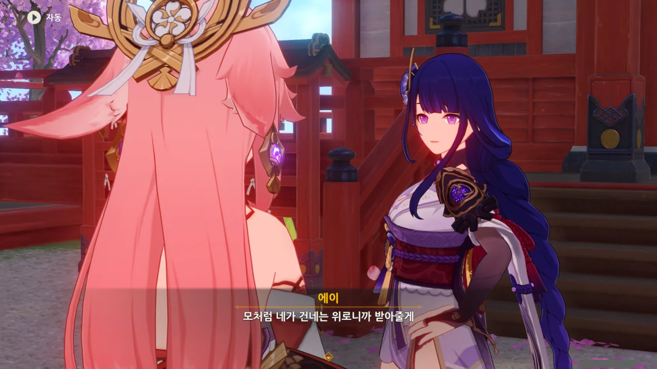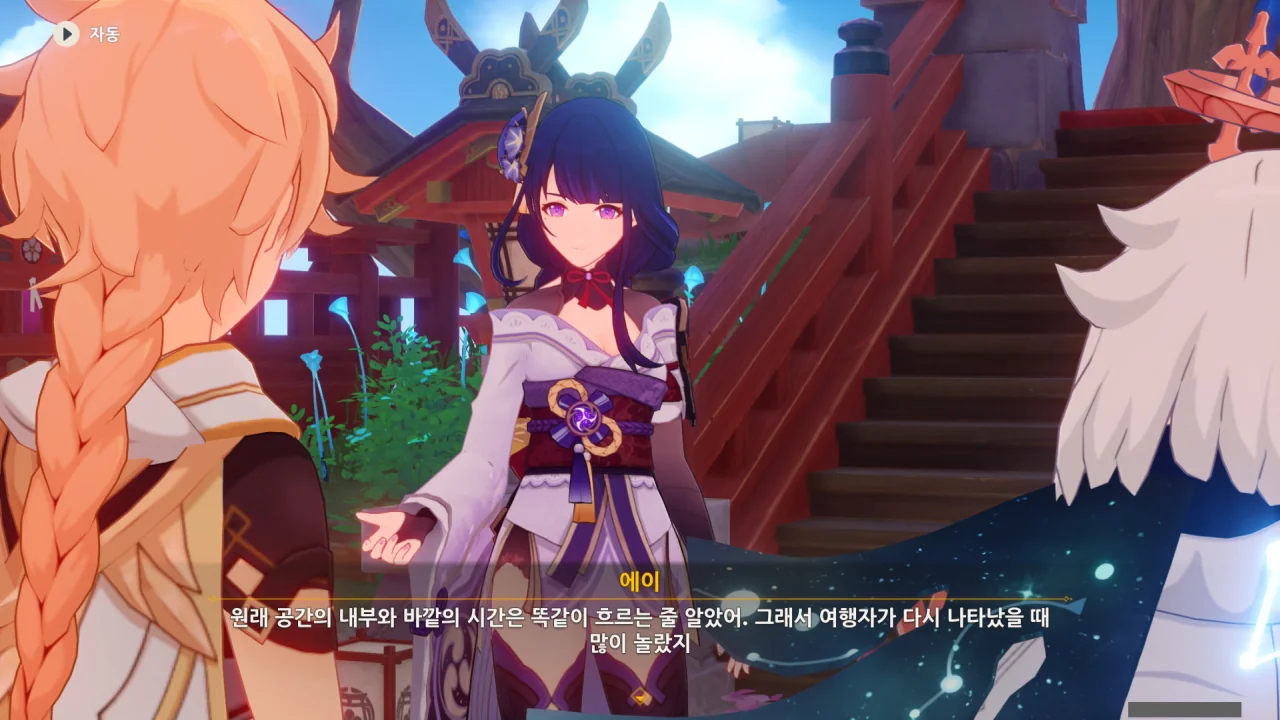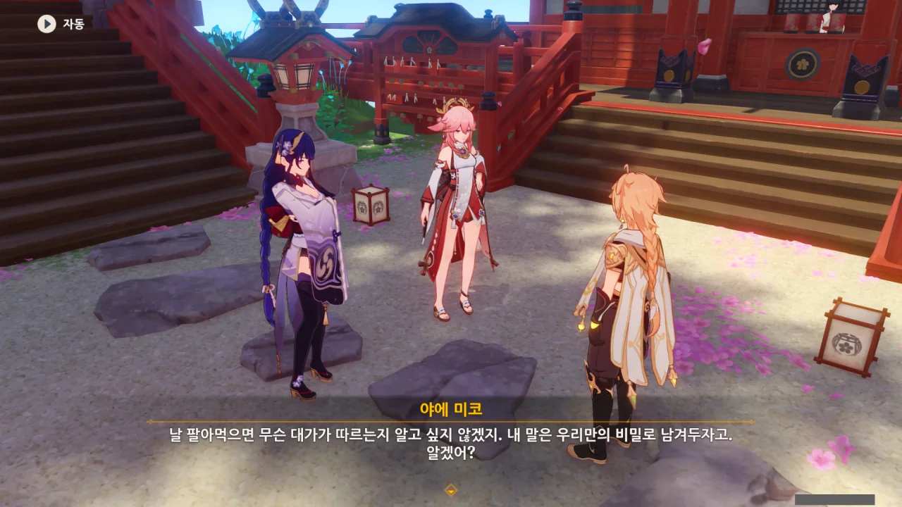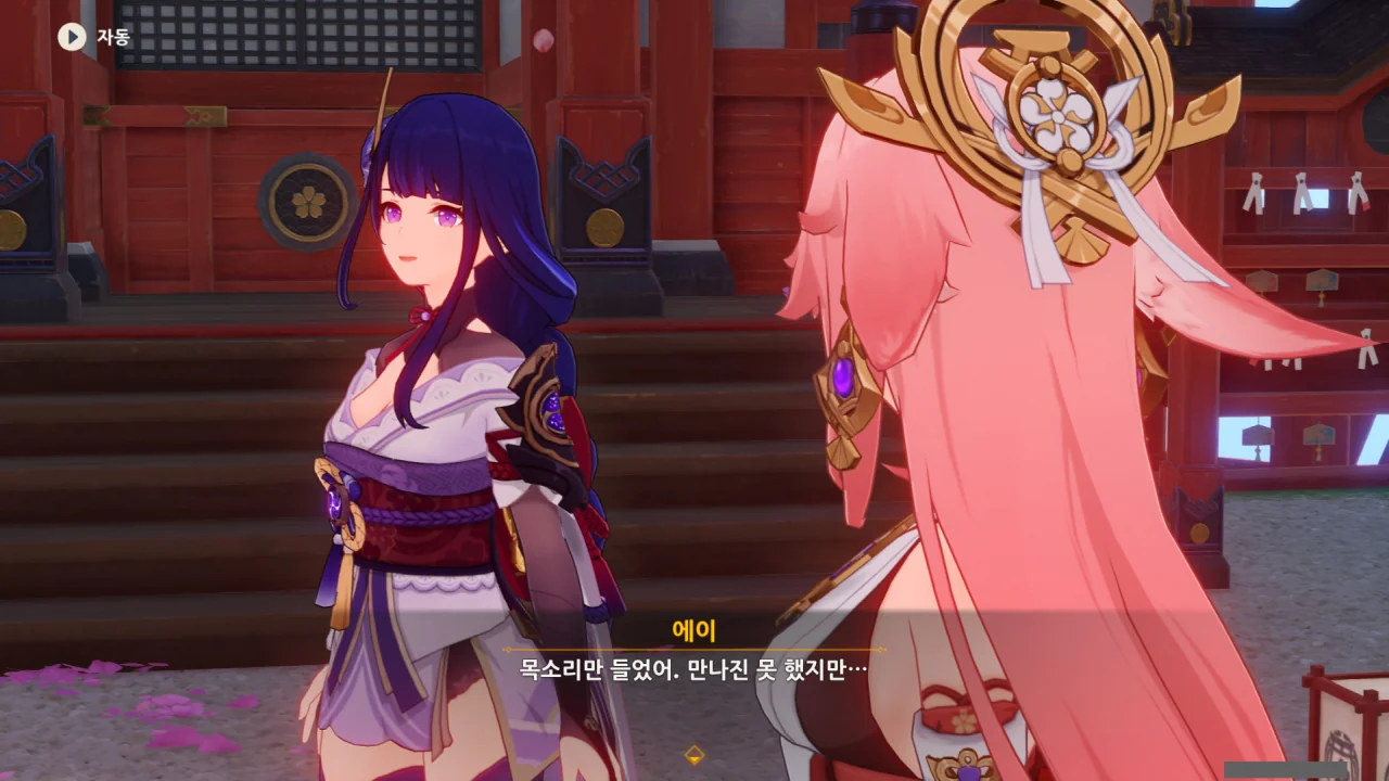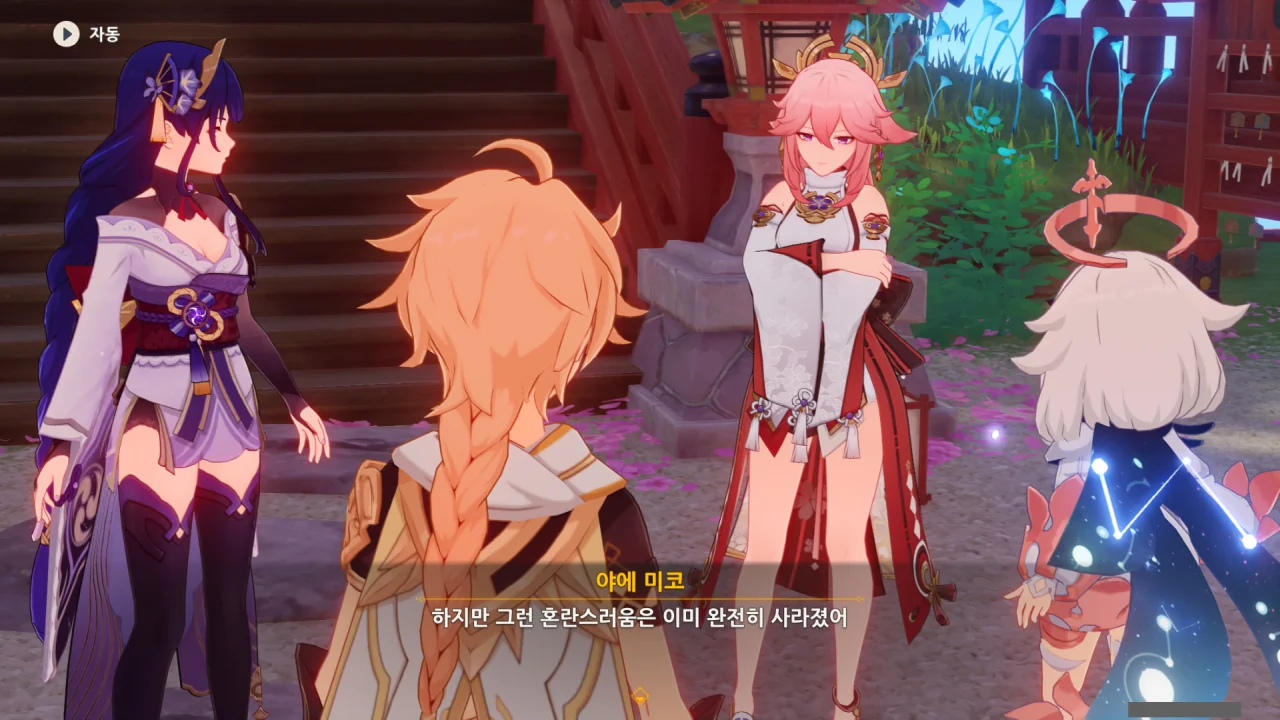 아직 라이덴 에이와 야에 미코가 사라지지 않고 있기에 말을 걸어보니 추가적인 대화 내용이 나타난다.