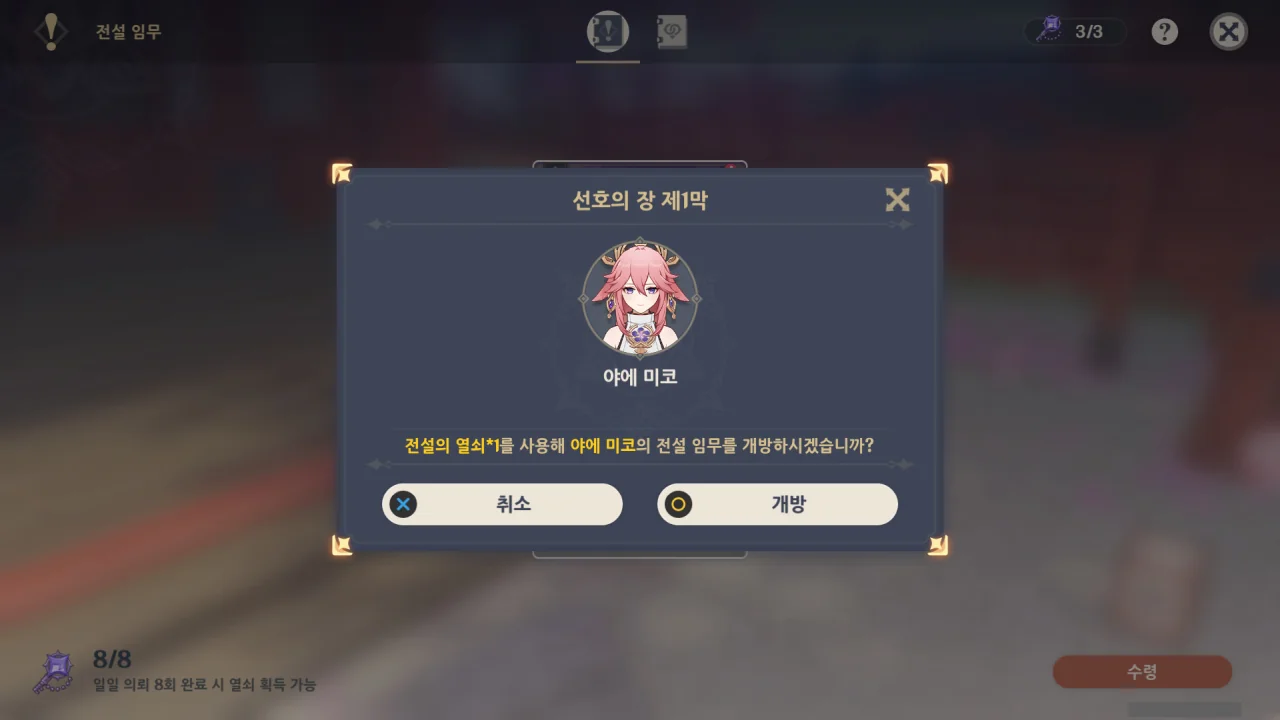 다음 전설 임무가 야에 미코 전설 임무였기에, 미리 열어두었다.