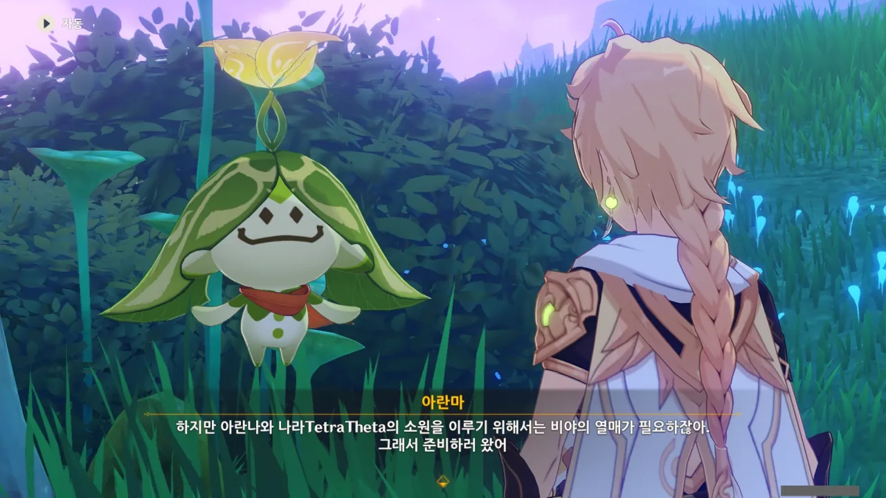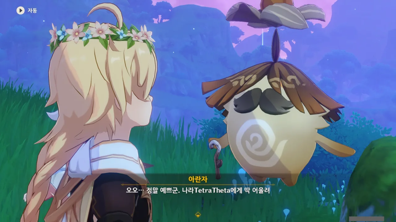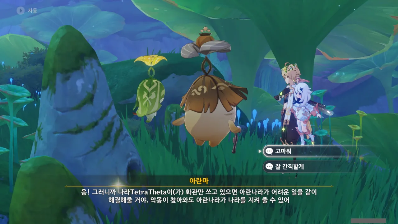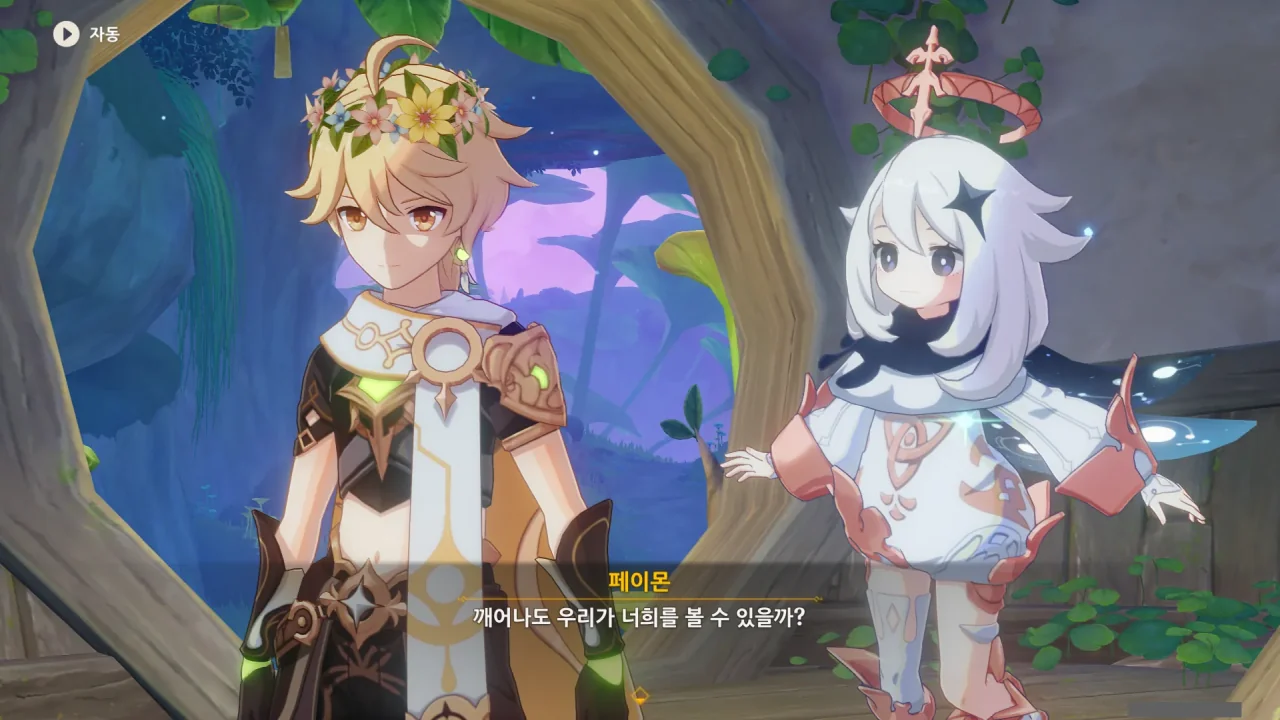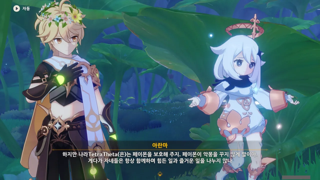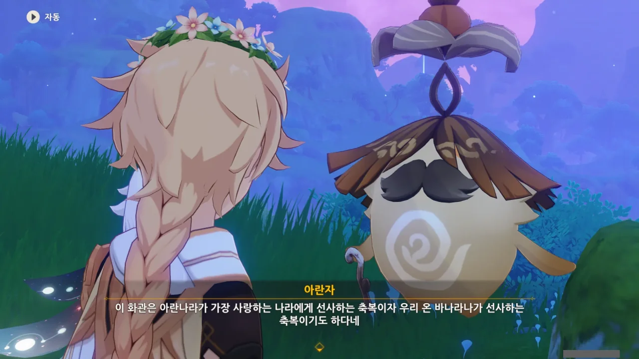 페이몬은 왜 내겐 화관을 주지 않냐 묻자, 아란마가 '넌 이미 여행자가 지켜주고 있잖아'라고 대답한다.