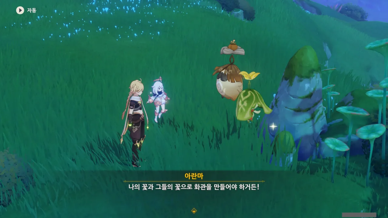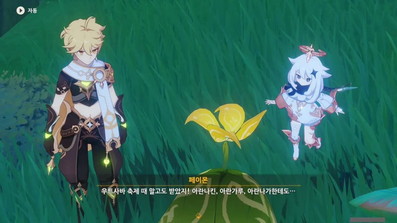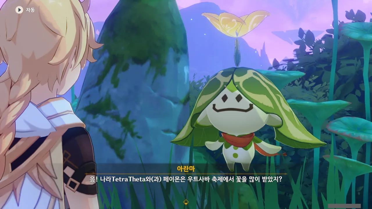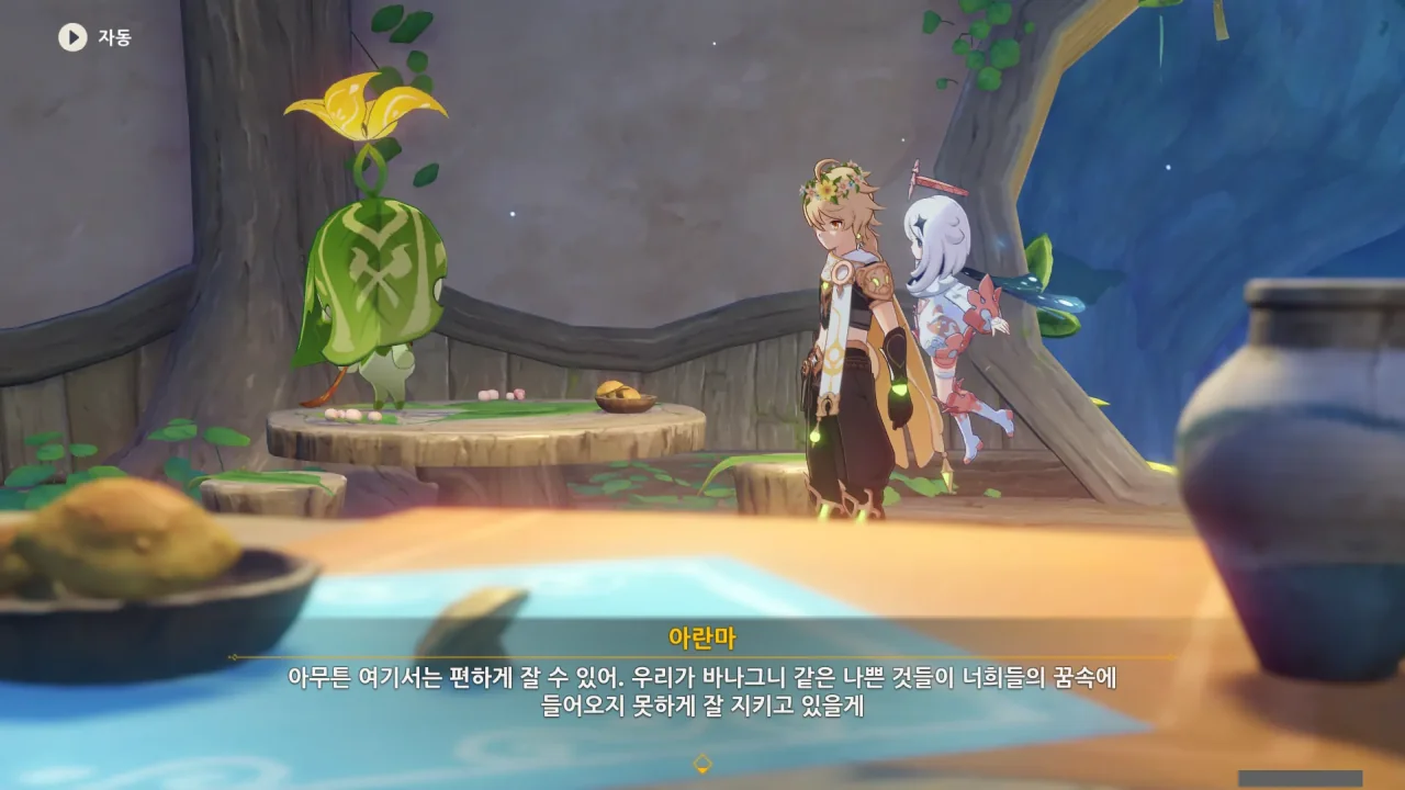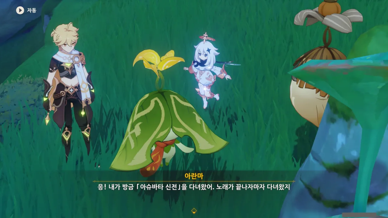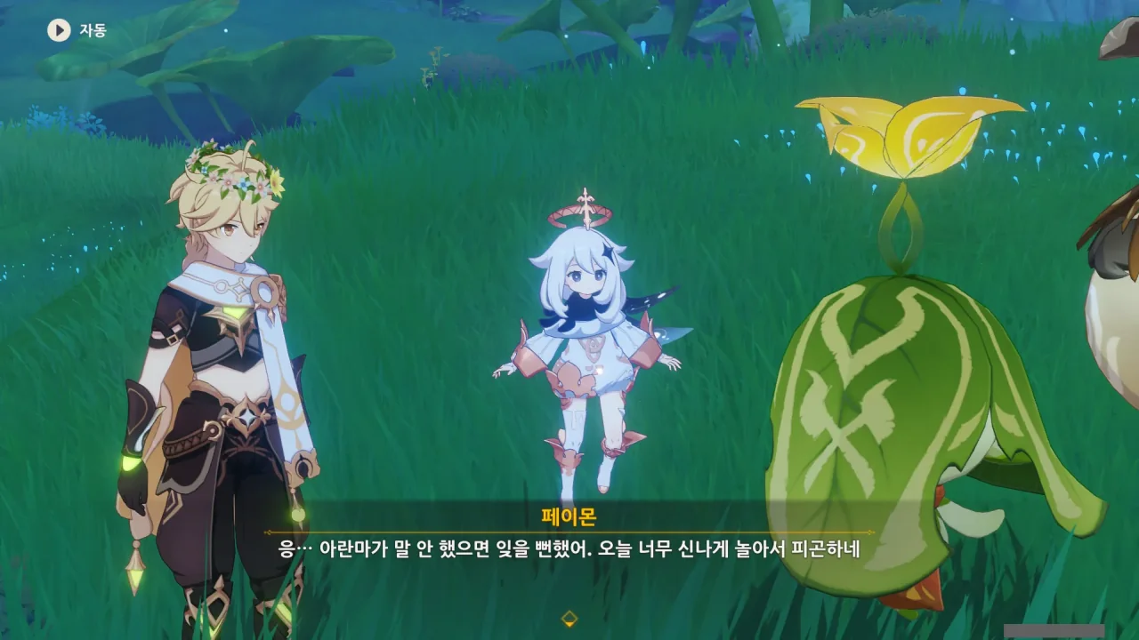 페이몬은 왜 내겐 화관을 주지 않냐 묻자, 아란마가 '넌 이미 여행자가 지켜주고 있잖아'라고 대답한다.