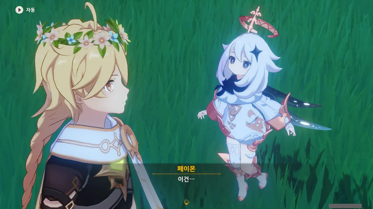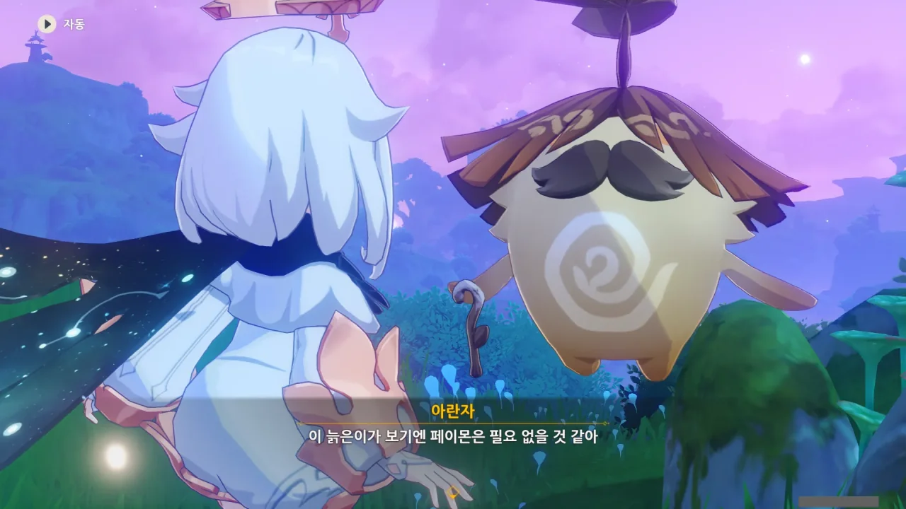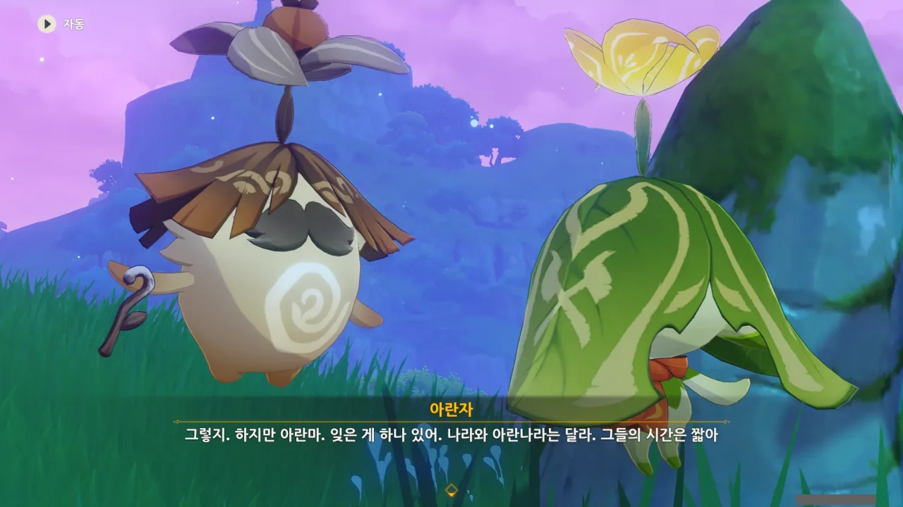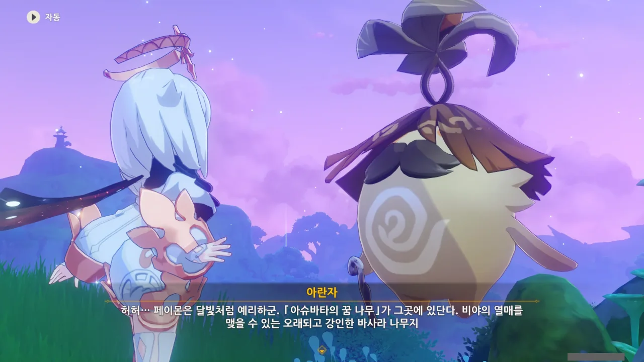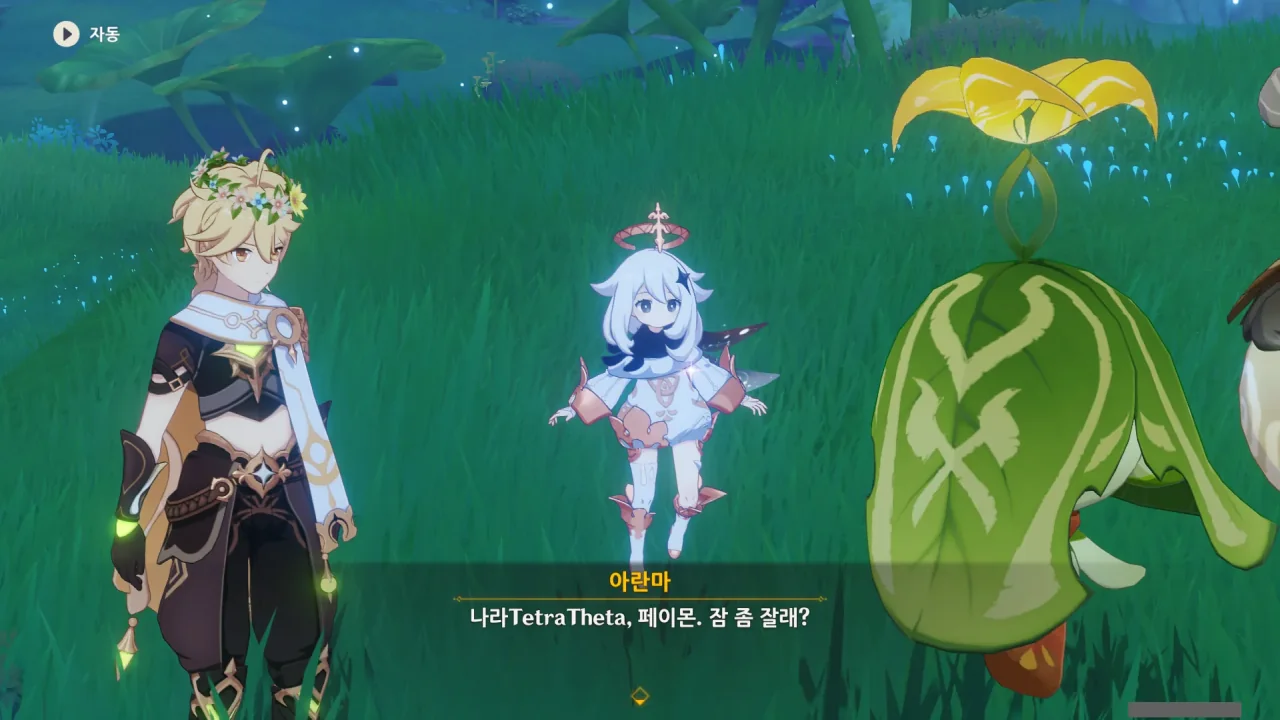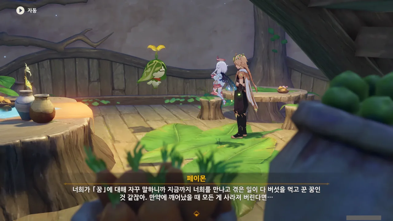 페이몬은 왜 내겐 화관을 주지 않냐 묻자, 아란마가 '넌 이미 여행자가 지켜주고 있잖아'라고 대답한다.