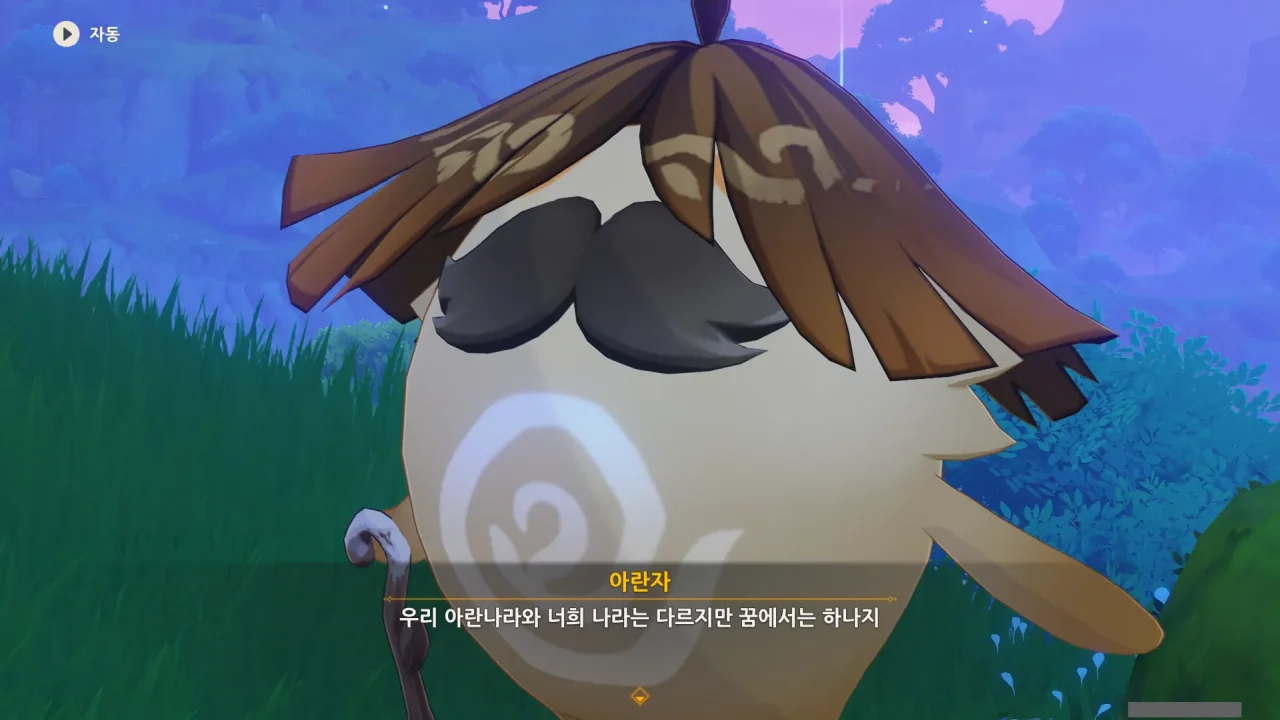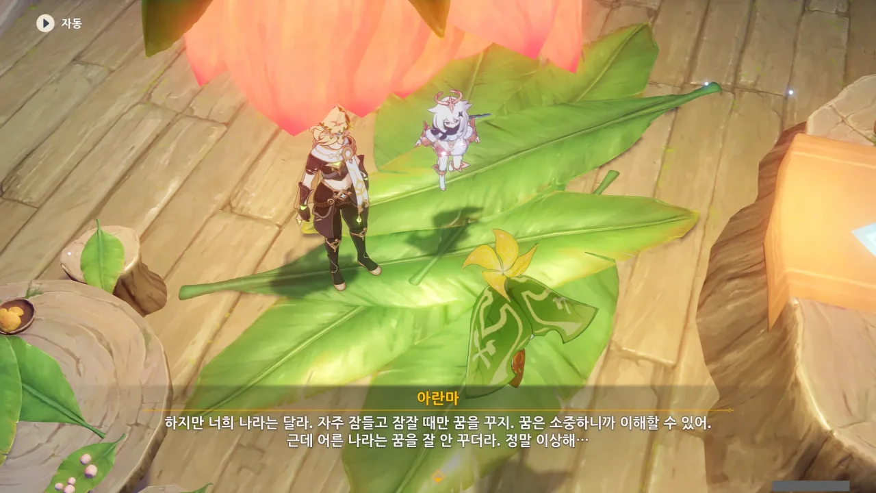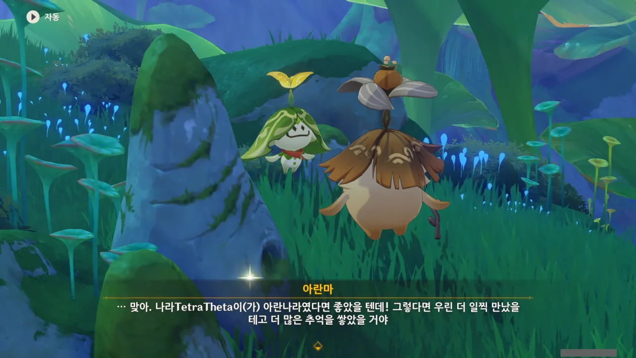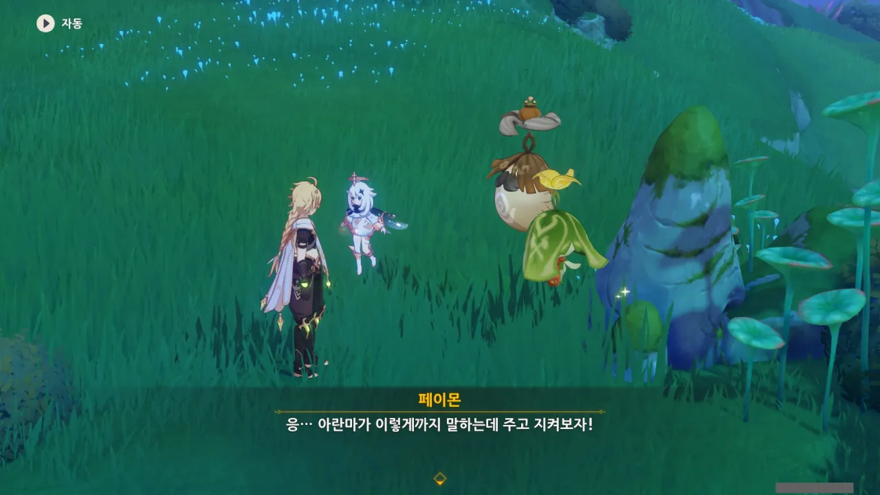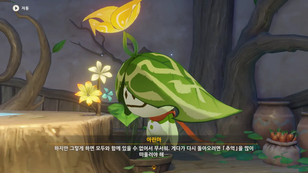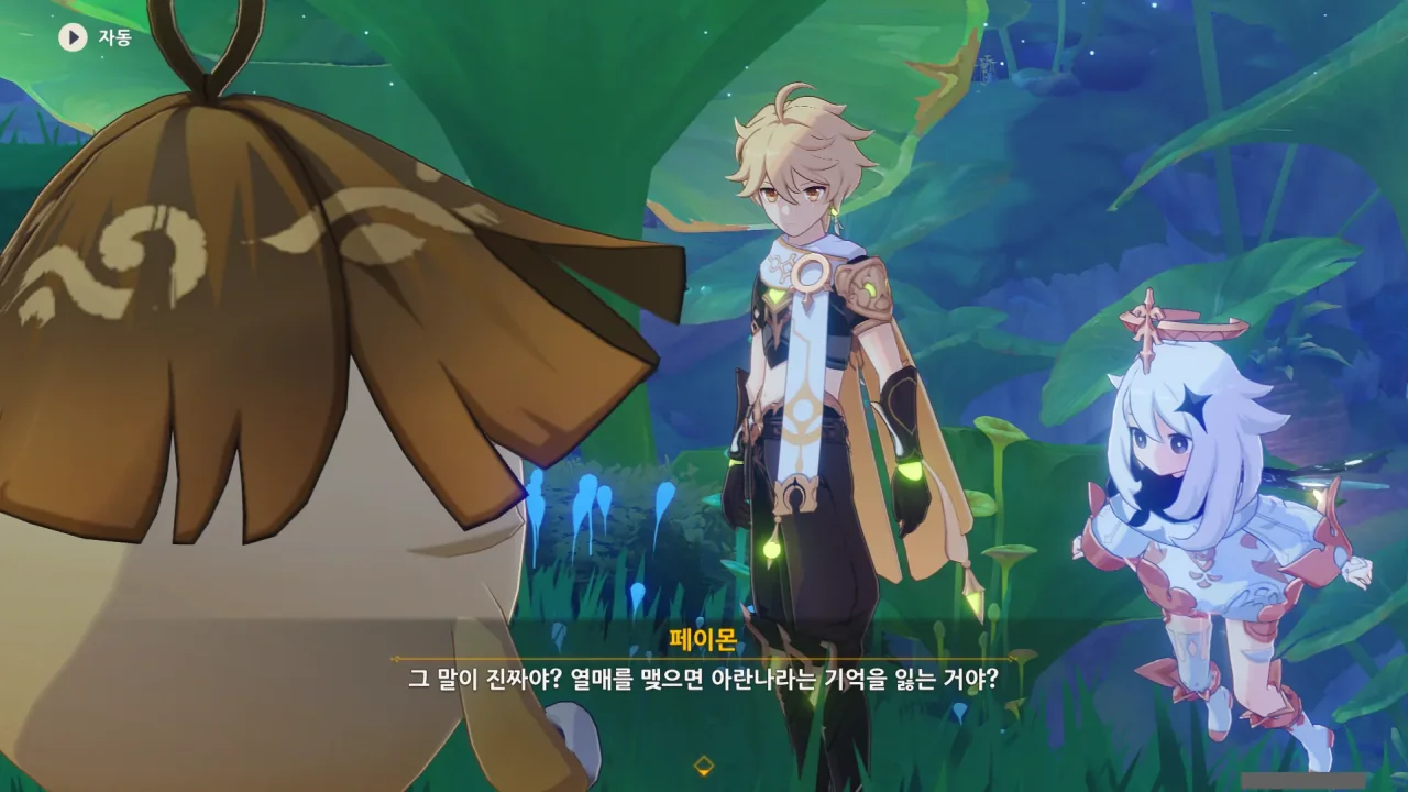 페이몬은 왜 내겐 화관을 주지 않냐 묻자, 아란마가 '넌 이미 여행자가 지켜주고 있잖아'라고 대답한다.