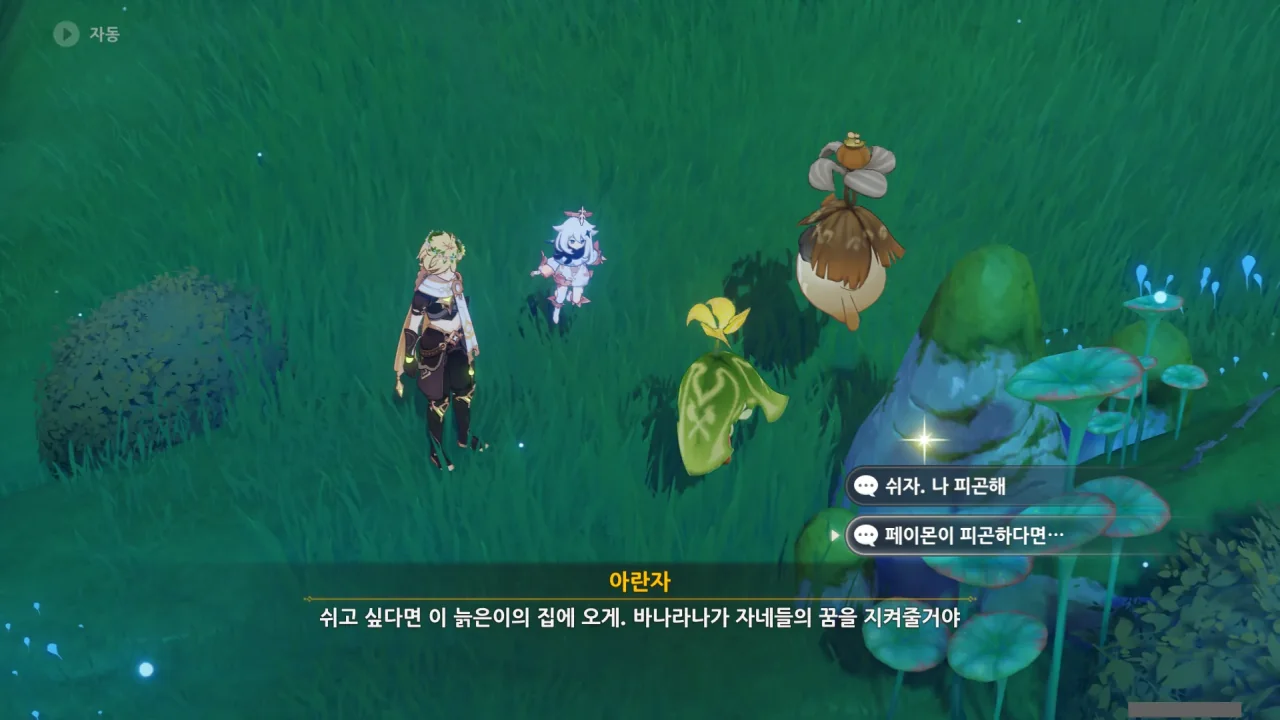 여기서 잠에 들고 다시 깨어나면 모든 게, 마치 한여름 밤의 꿈이었던 것처럼 감쪽같이 사라지는 그런 전개가 너무 유명한지라, 페이몬이 불안해하는 것도 이해가 간다.
