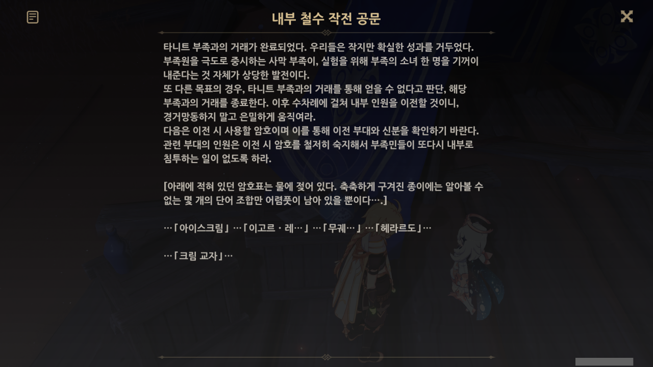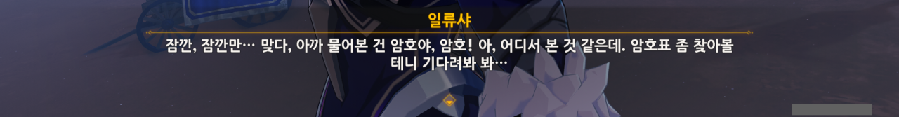 암구호에 대해선… 별 수 없지. 그냥 아무거나 대는 수밖에. 암호에 대한 다른 단서를 얻기 전까진 별다른 방법이 없다.
