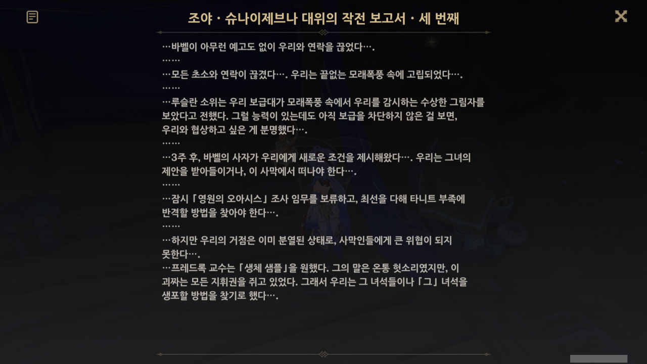우인단이 원했던 '또 다른 목표'가 뭔지에 대해선 전혀 감도 잡히지 않는다. 하지만 우인단이 타니트 부족과의 거래를 통해 이를 얻을 수 없다고 판단했으니, 지금 당장은 걱정하지 않아도 좋을 것 같다.